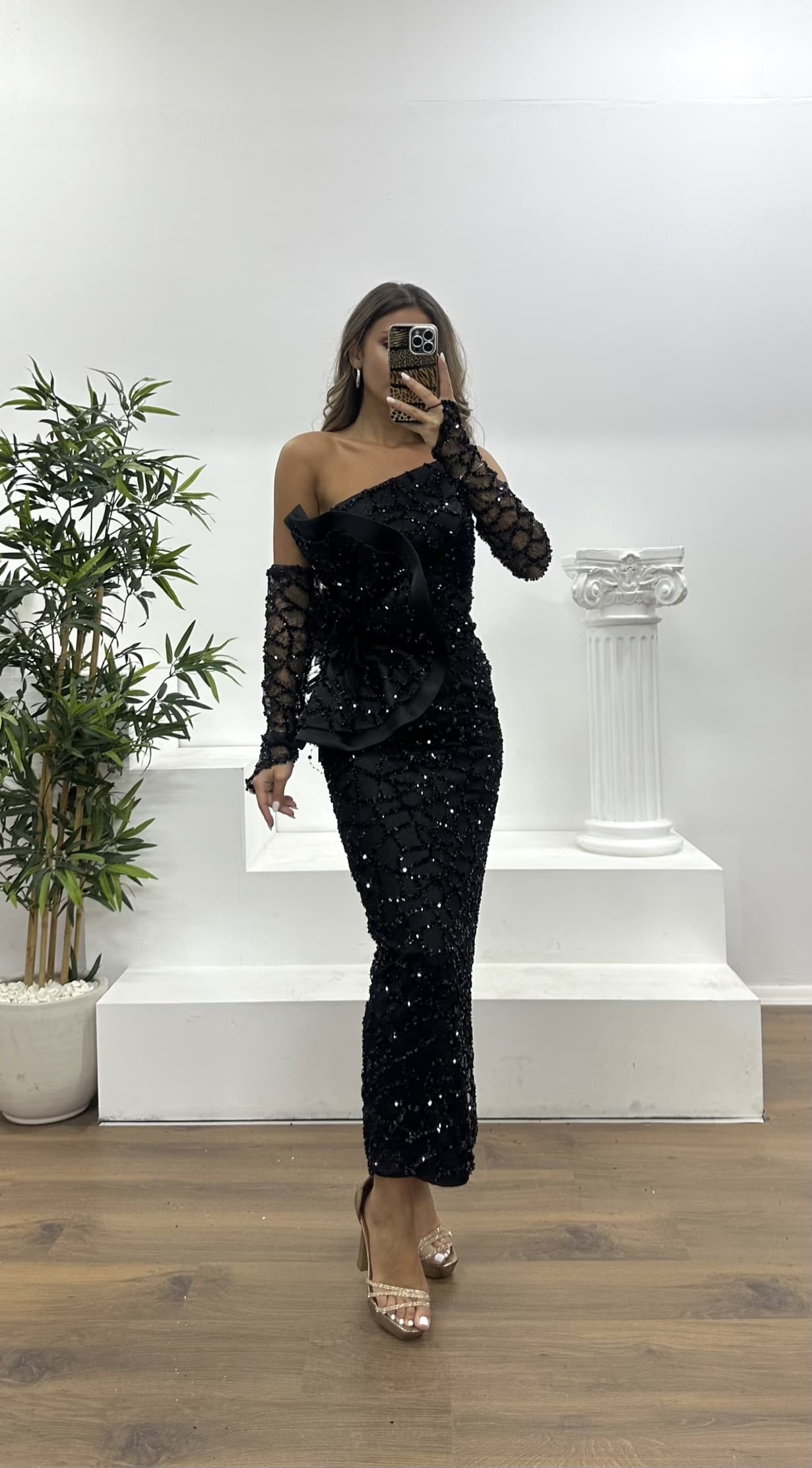 Gloved Waist Detail Evening Dress The product fits sizes 36-42, features padded bust, is fully lined, has a back zipper closure, and comes with gloves as part of the evening dress design. Dress Length: May vary between 170-175 cm. Fabric Type: Sequin fabric, 100% polyester.