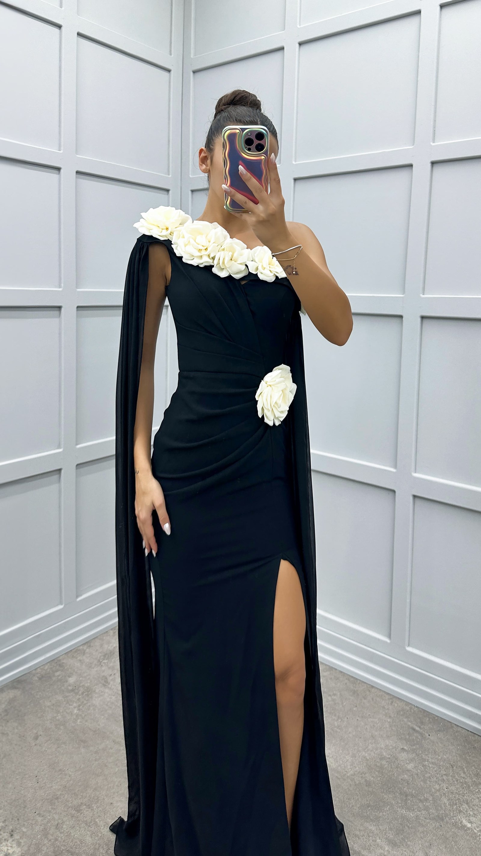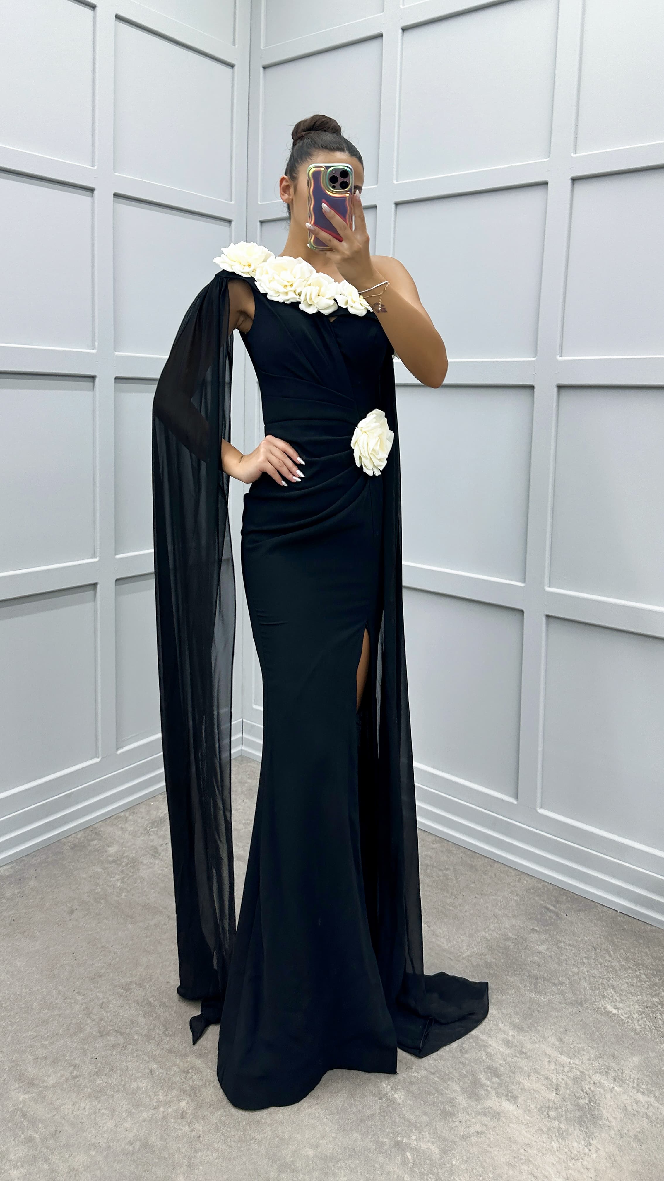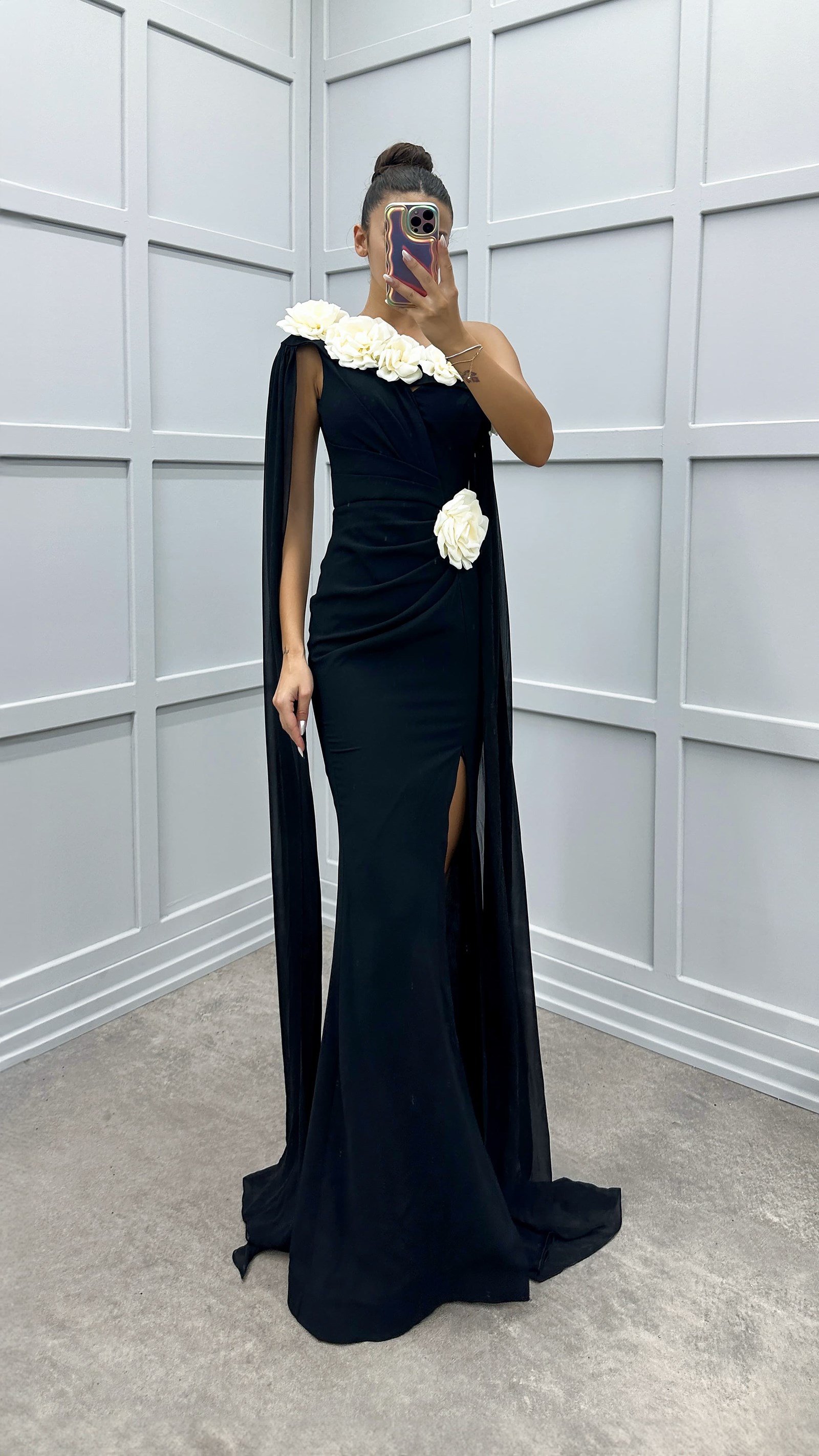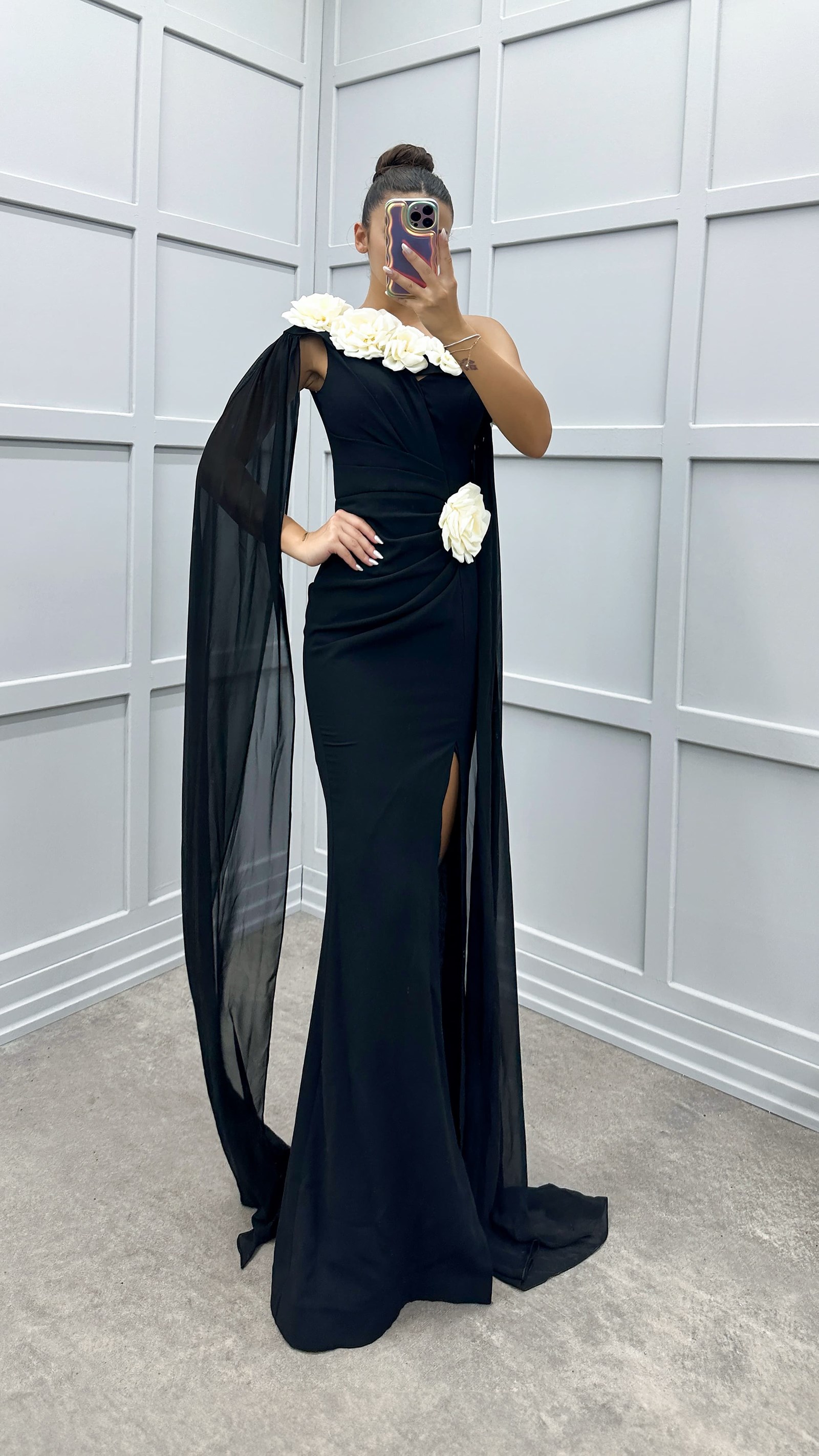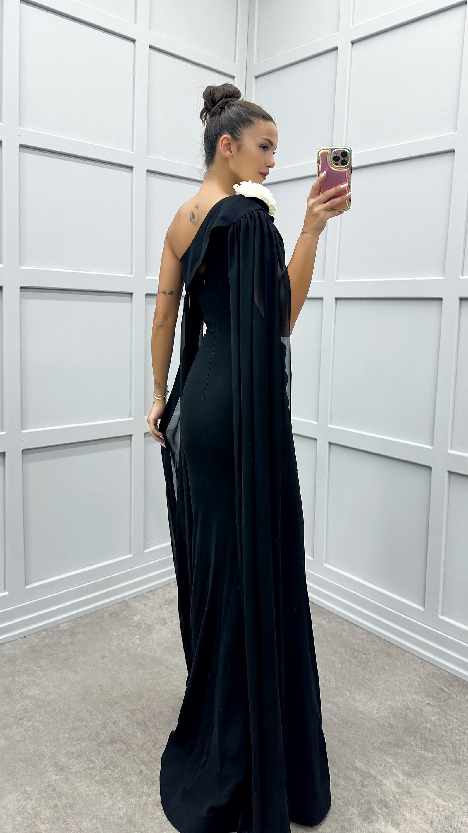 Siyah Tek Omuz Gül Detay Pelerinli Tasarım Elbise