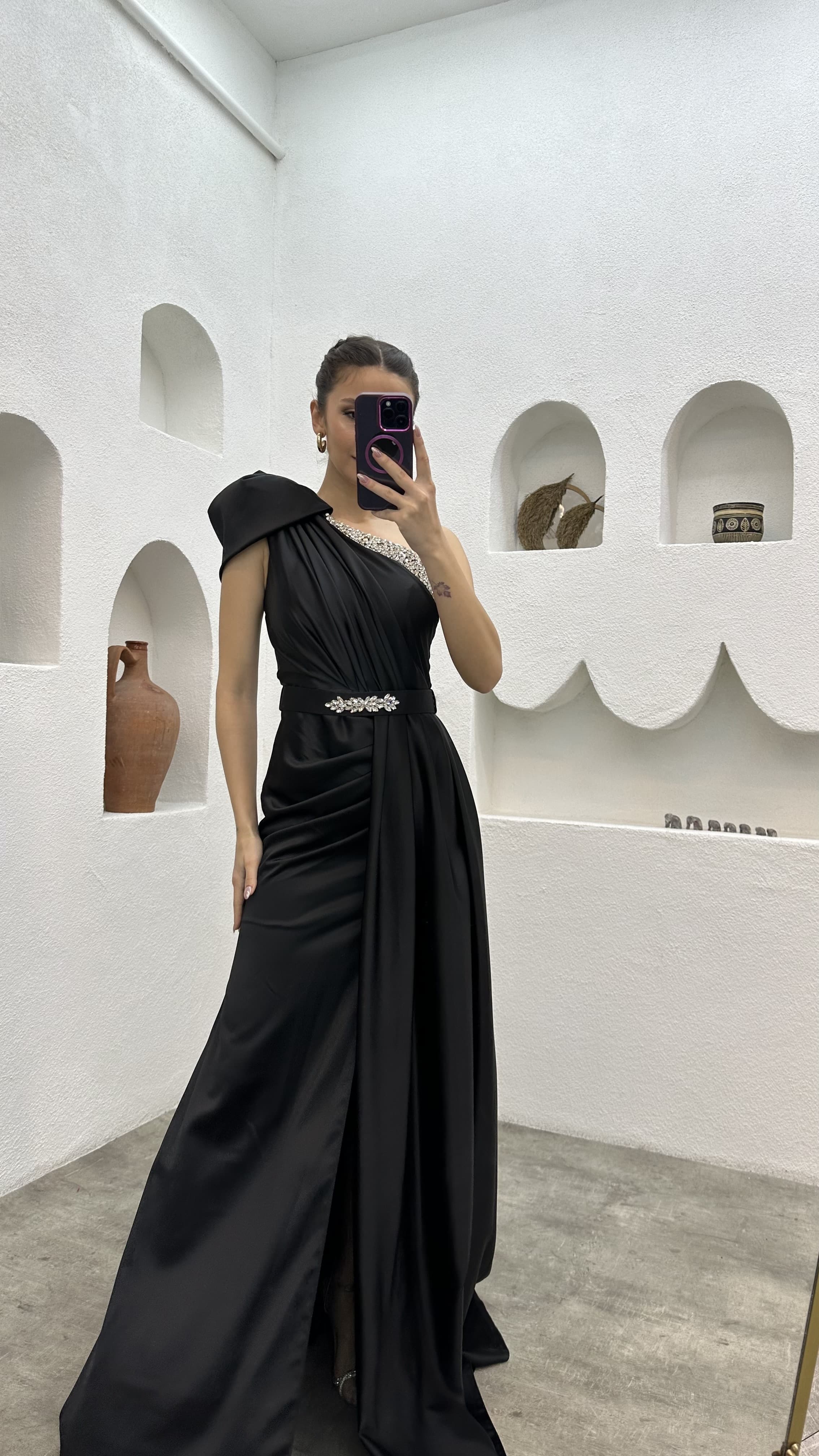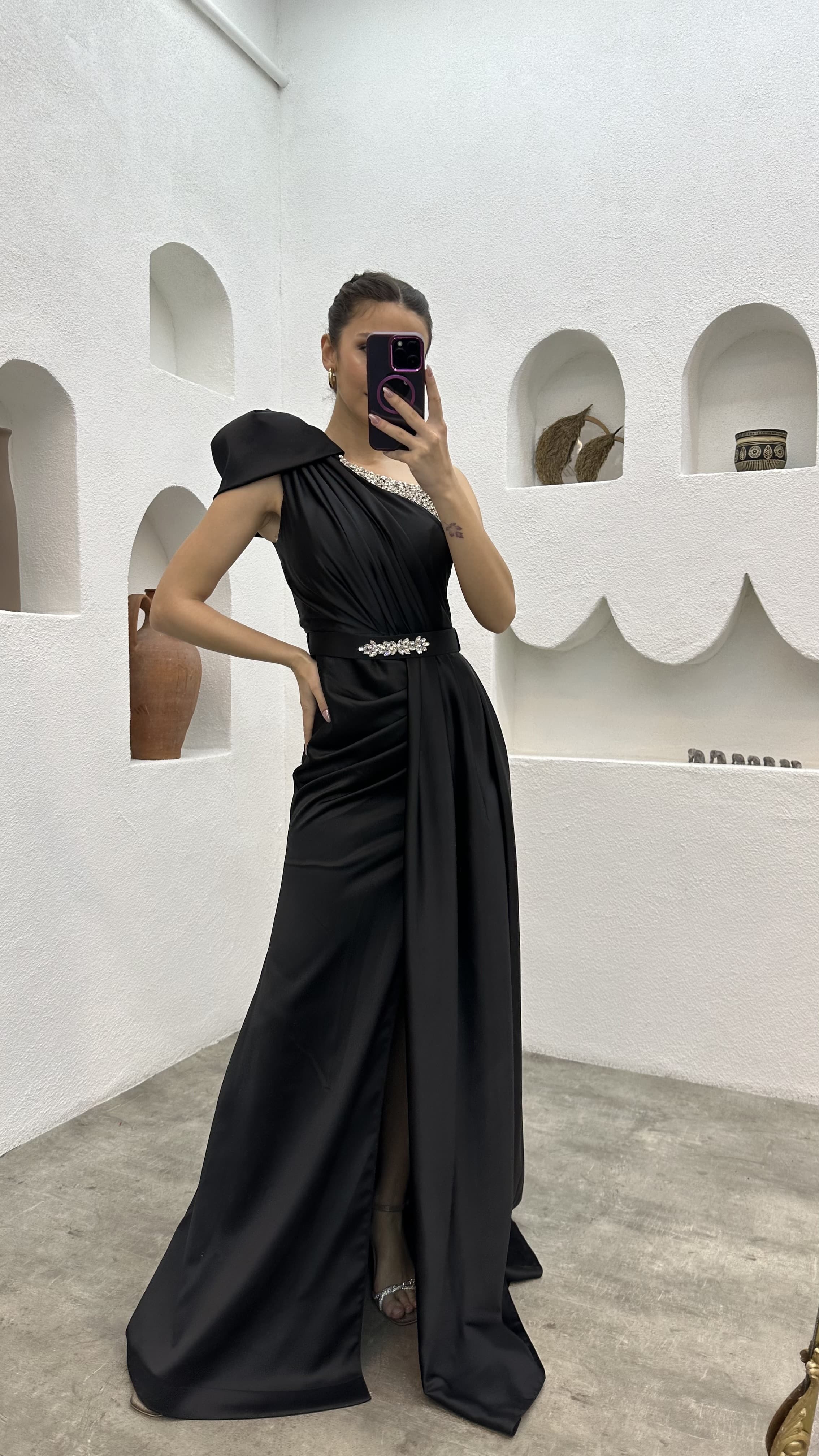 • Siyah Tek Omuz Taş İşlemeli Abiye Elbise