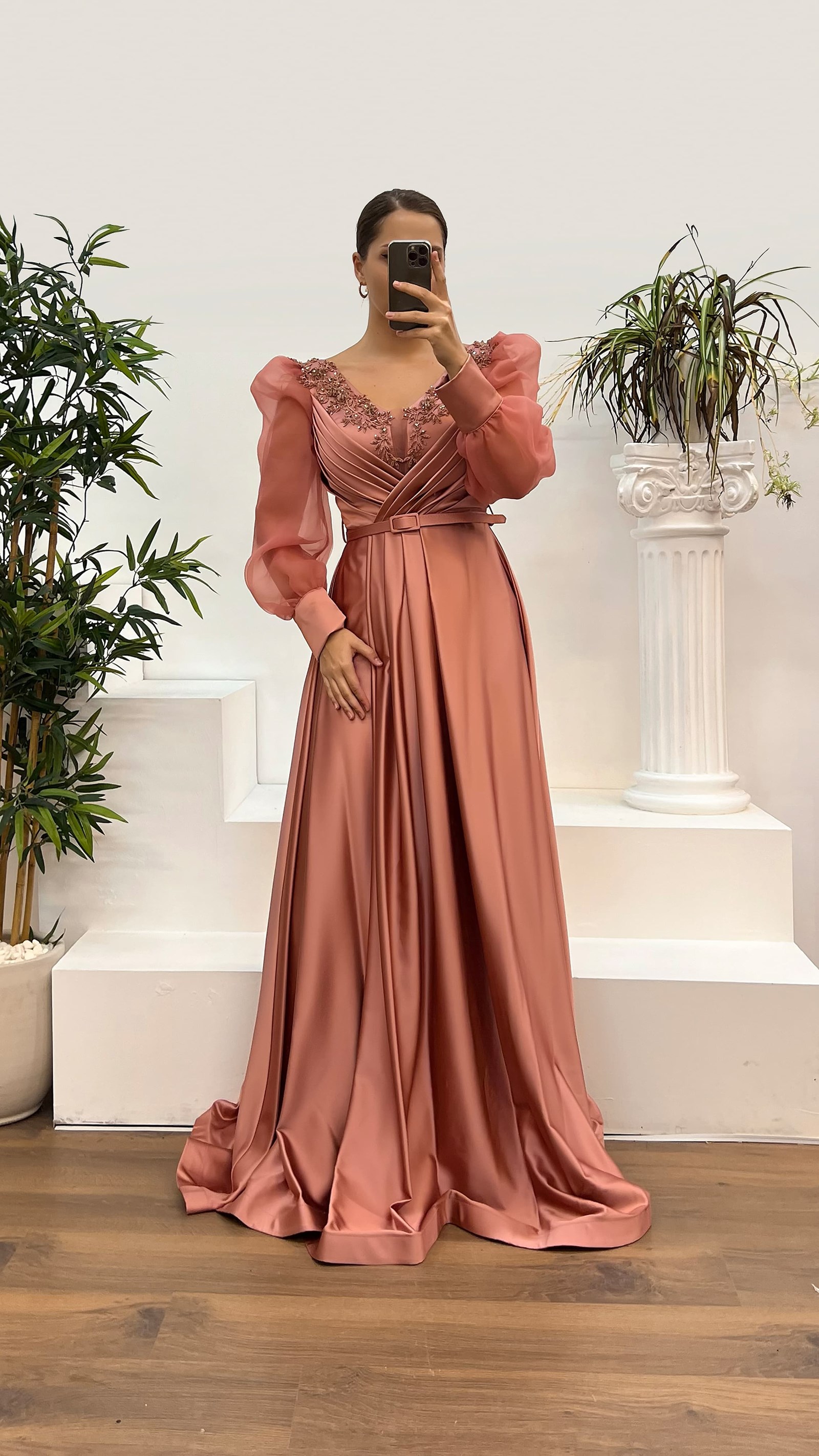 • Soğan Kabuğu V Yaka İşlemeli Saten Büyük Beden Abiye Elbise