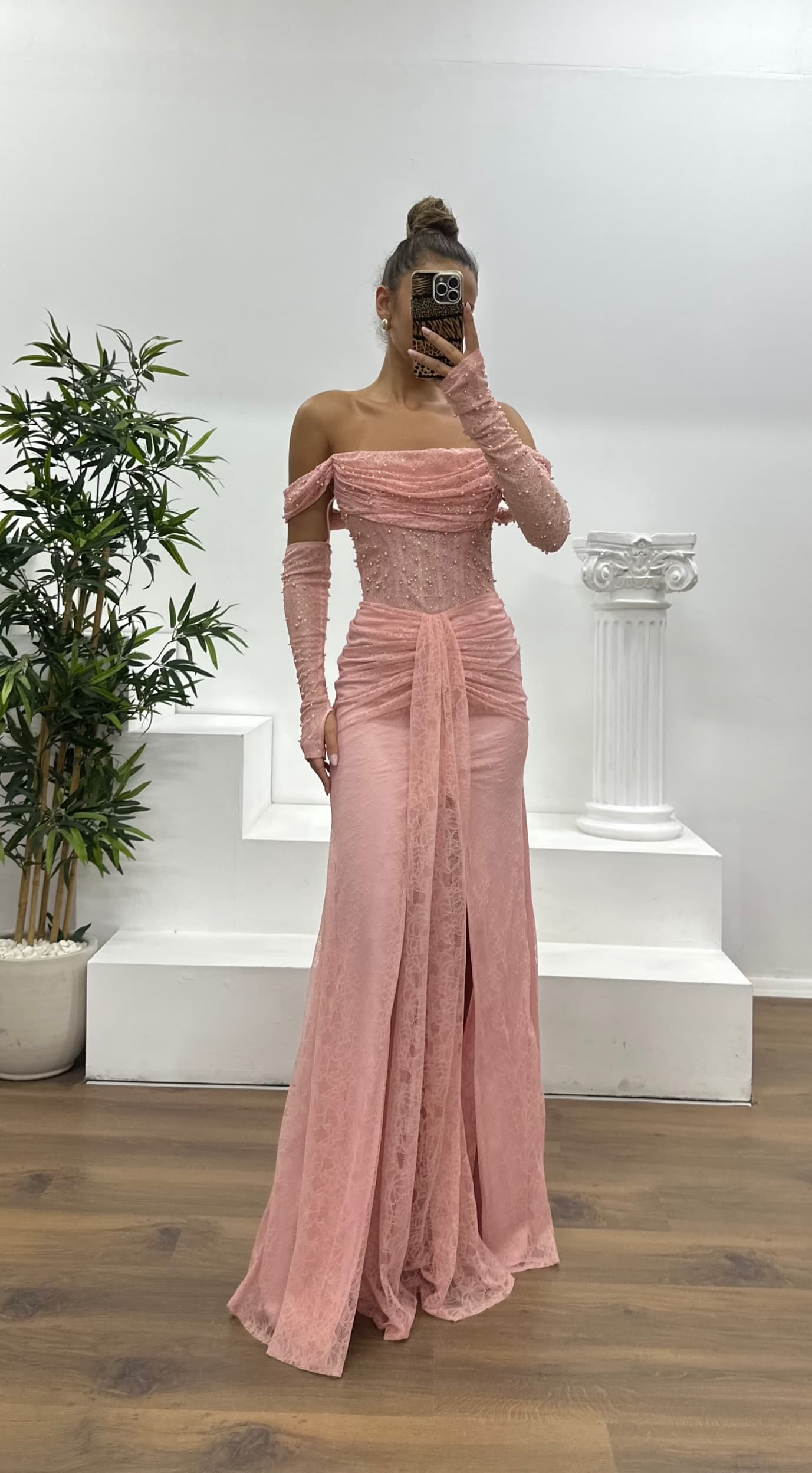 Pearl Lace Evening Dress The dress fits sizes 36 to 42, features padded bust, lining, back criss-cross strap and zipper closure. It is designed with gloves, a slit, and pearl embellishments. Dress length: Varies between 170-175 cm. Fabric type: Lace