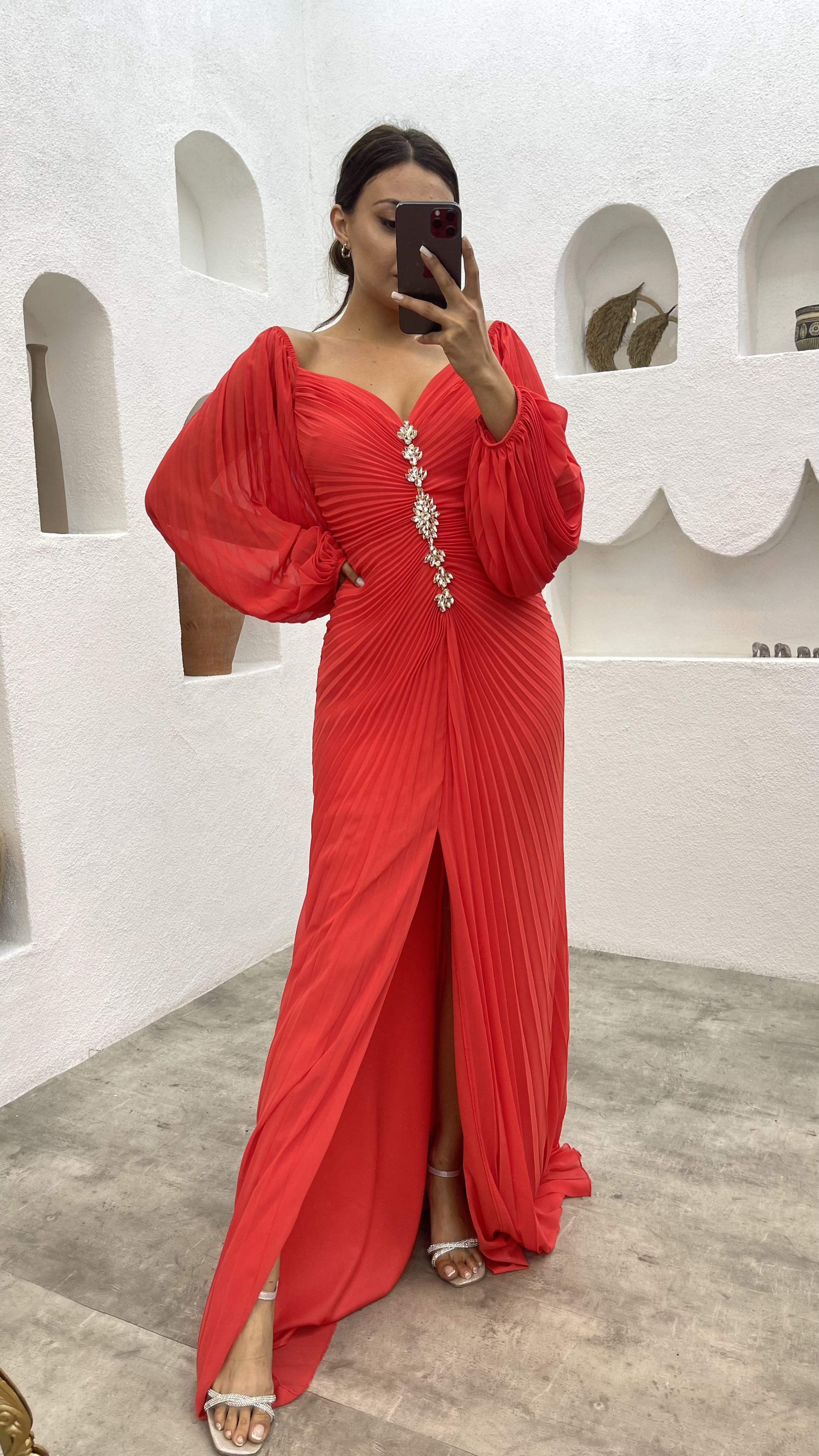 • Kırmızı Pliseli Önü Broş Detay Abiye Elbise