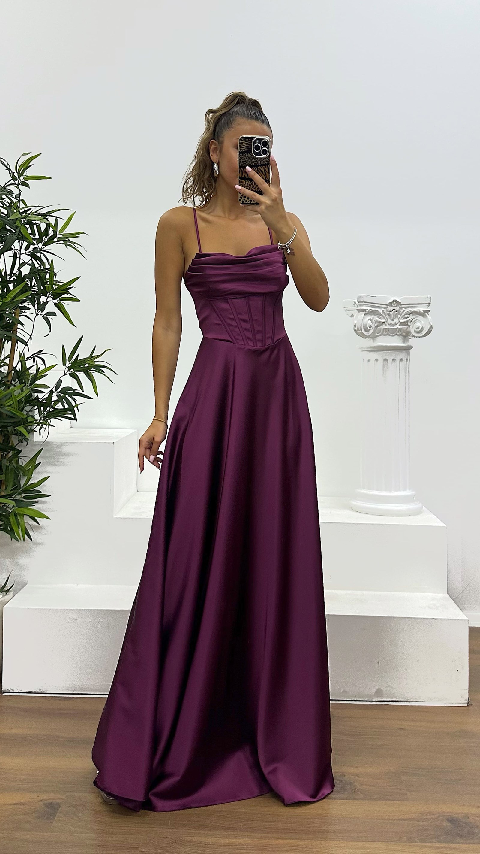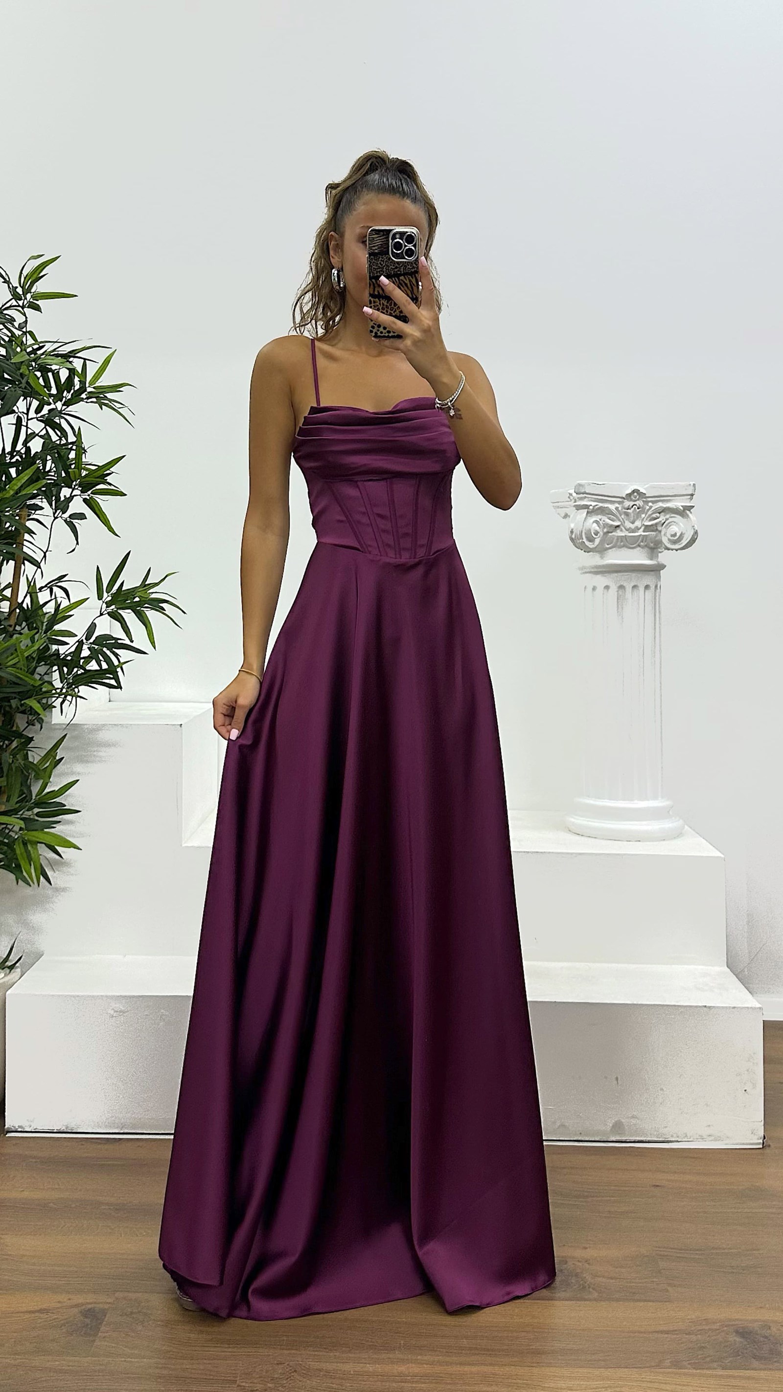 • Fuşya Sırt Detay Saten Abiye Elbise