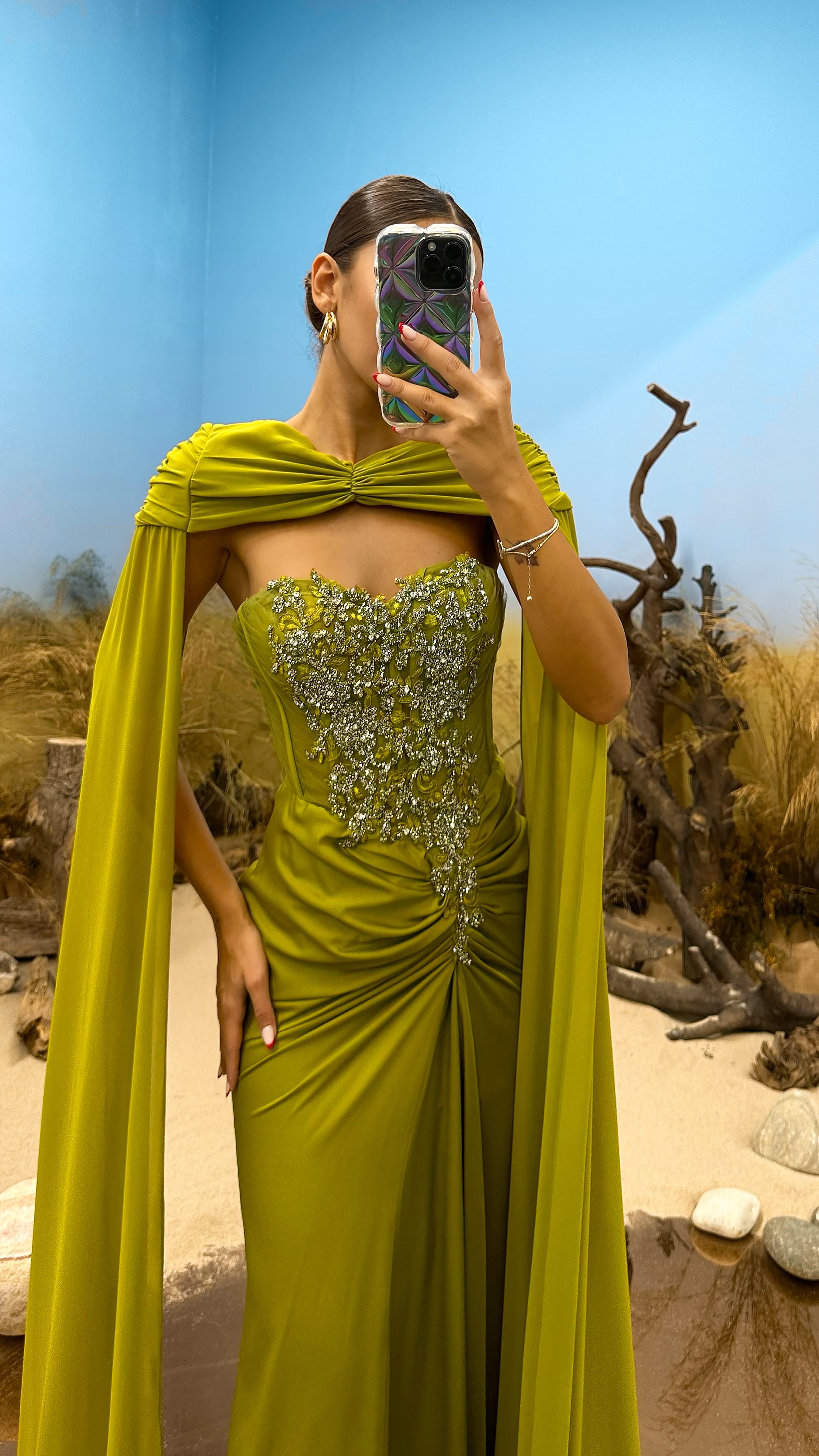 • Yeşil Göğüs Taş Detay Tasarım Abiye Elbise