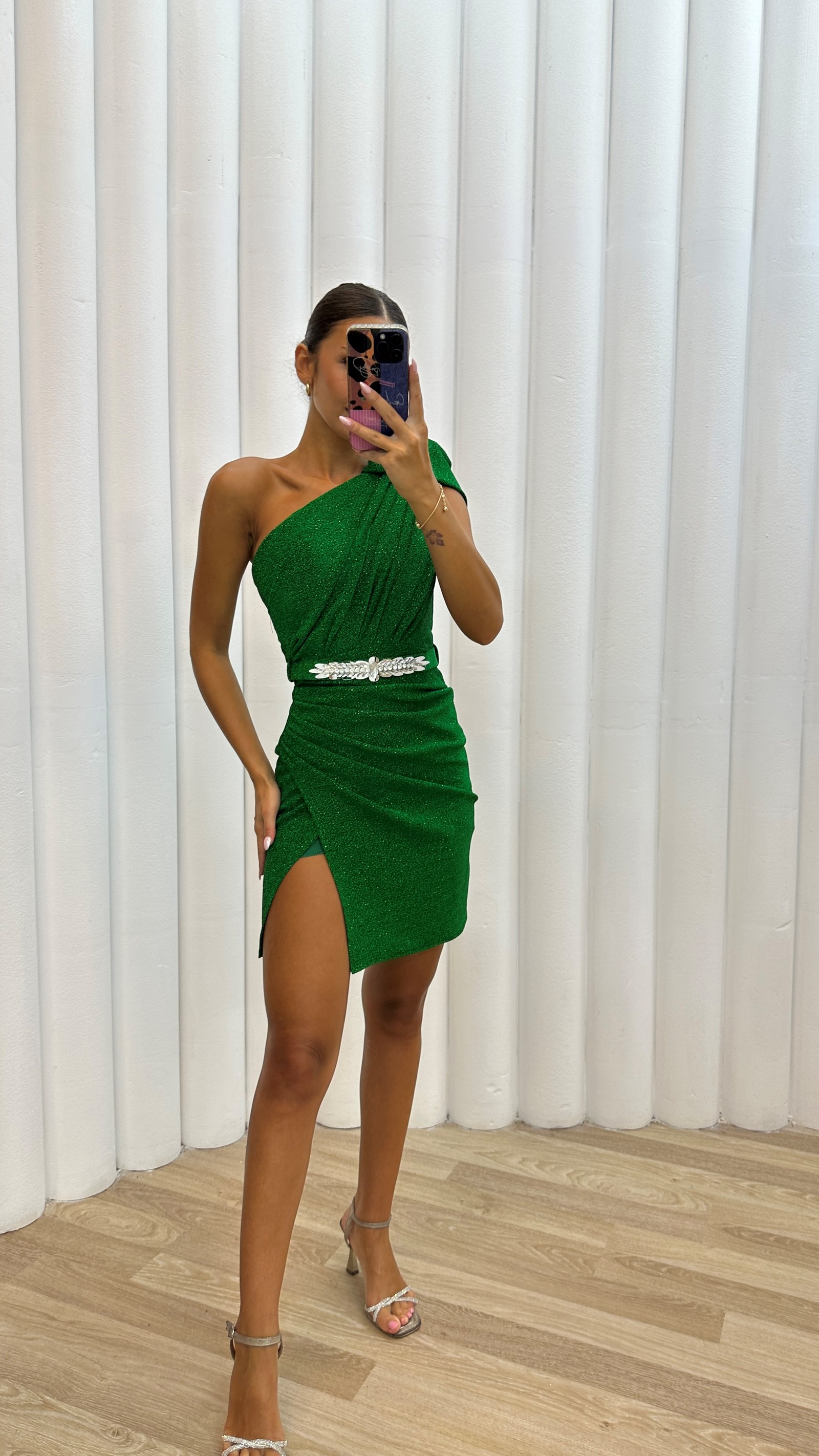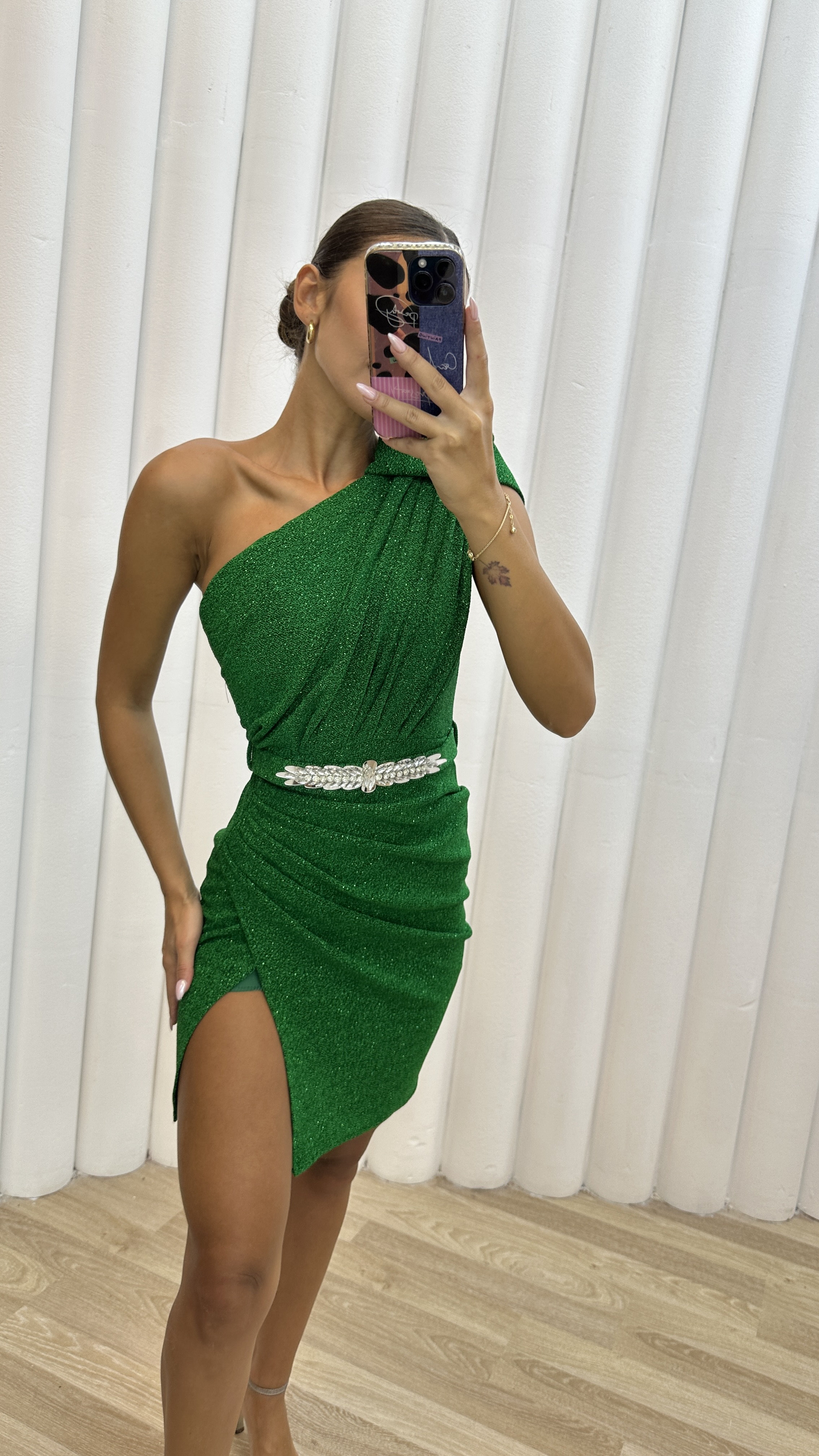 • Yeşil Tek Omuz Kemerli Mini Abiye Elbise