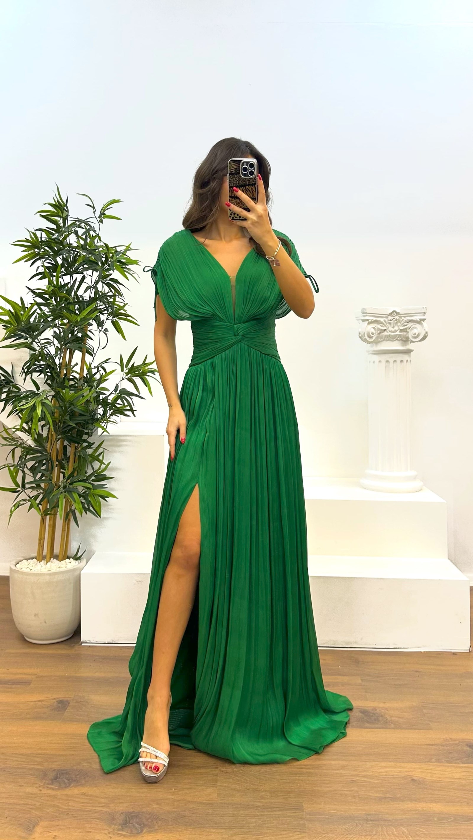 V-neck Pleated Evening Dress The product is compatible with sizes 36-42, featuring built-in breast pads, lined, with a back zipper, slit, and designed in a pleated style. The product length may vary between 175-170 cm. Fabric type: Chiffon 66% Viscose 34% Polyester.