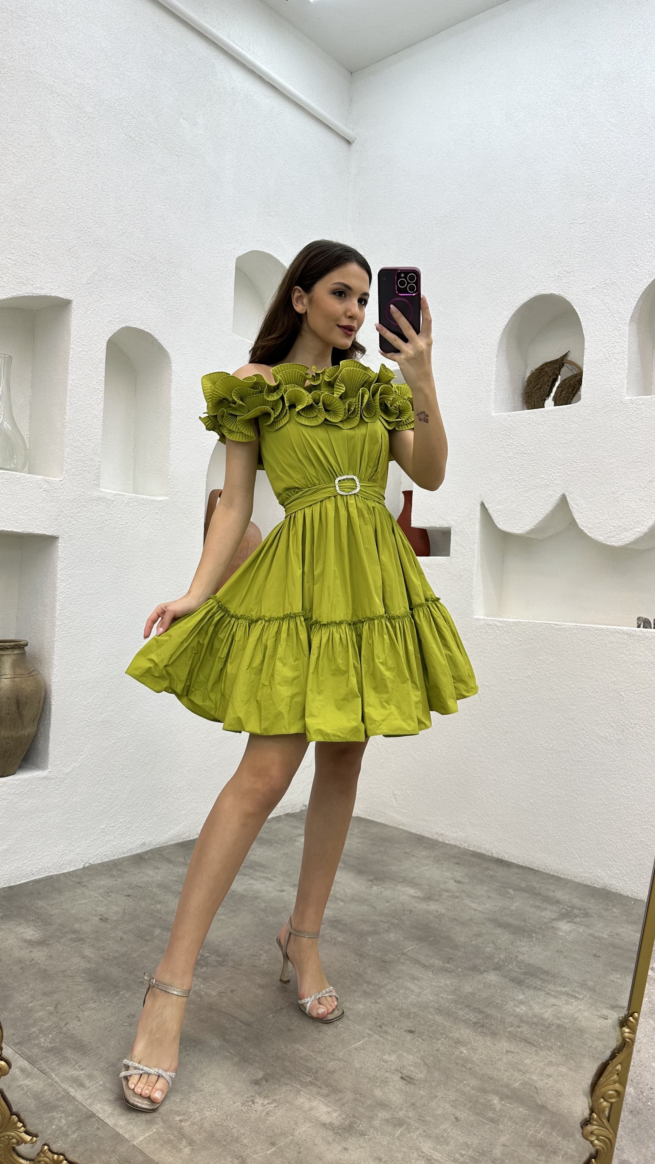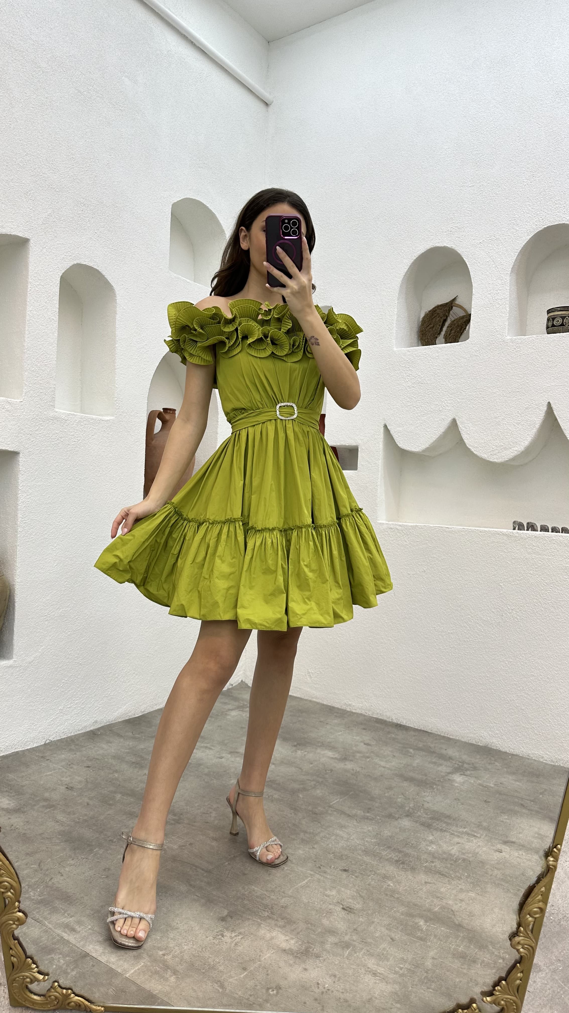 • Yeşil Volanlı Kemerli Abiye Elbise
