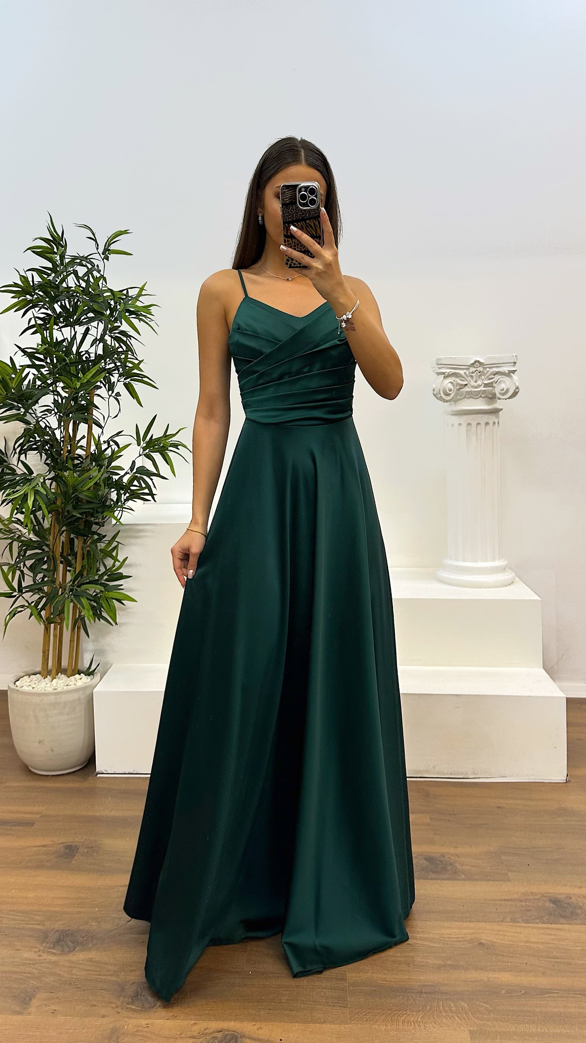 • Zümrüt Göğüs Drapeli Saten Abiye Elbise