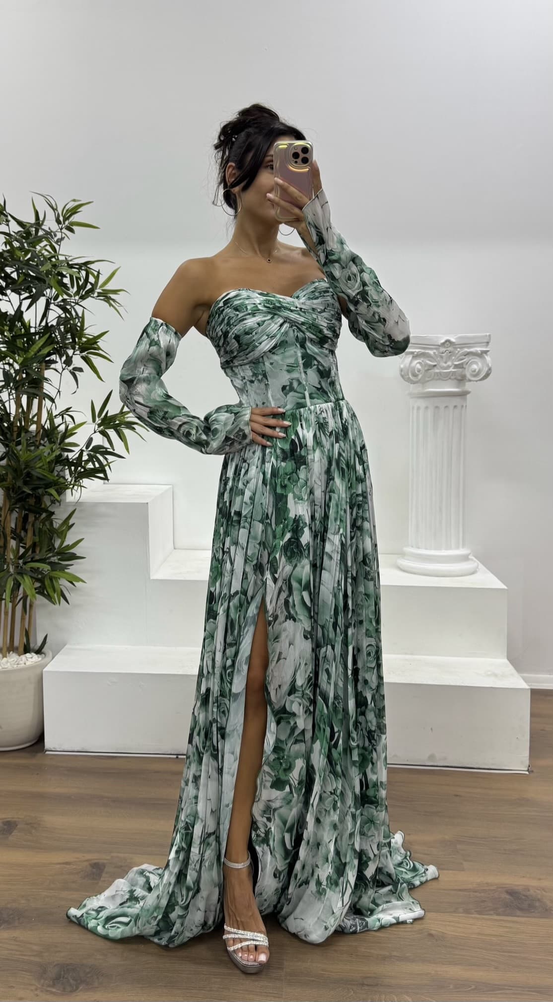 • Kemik-Yeşil Kalp Yaka Desenli Abiye Elbise