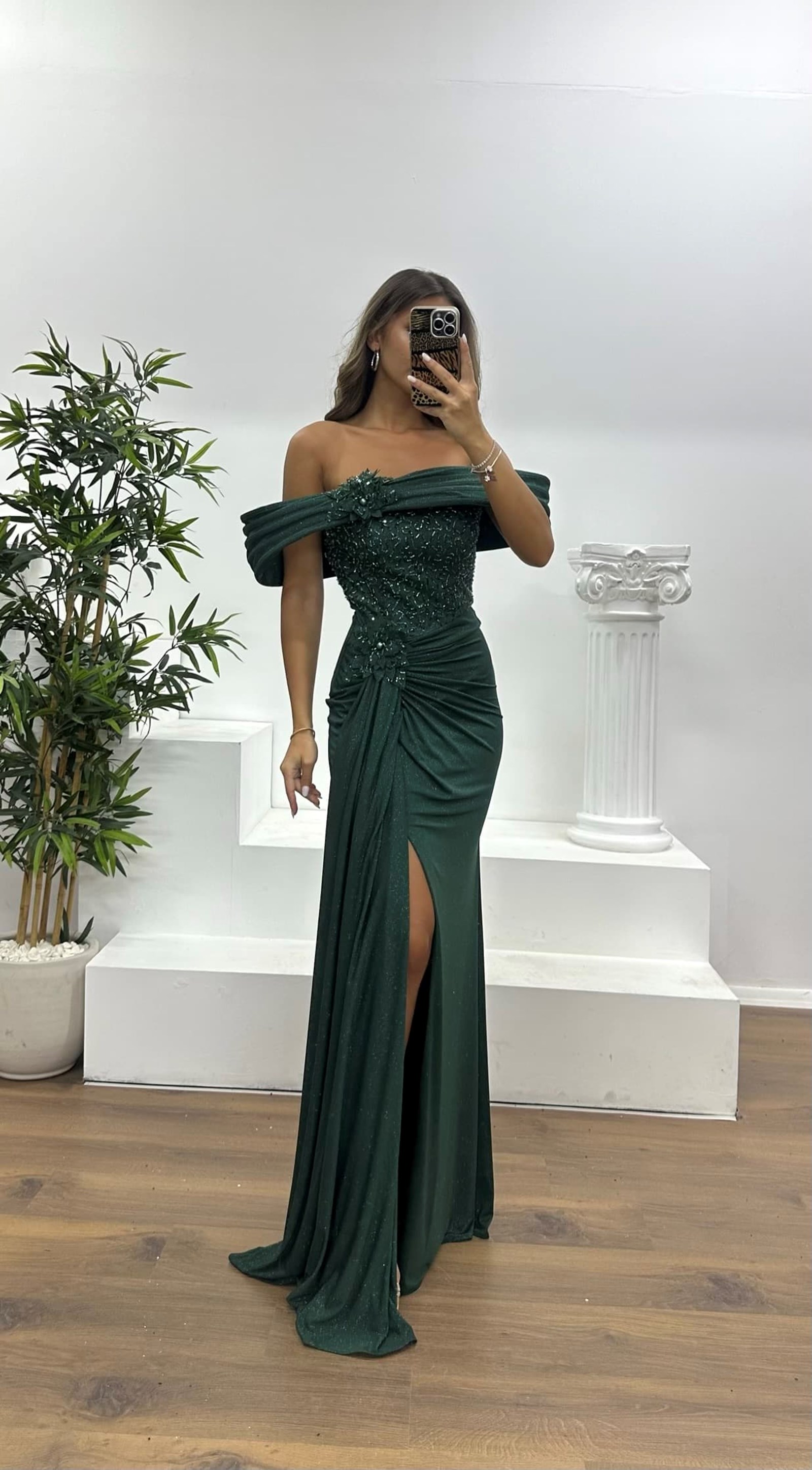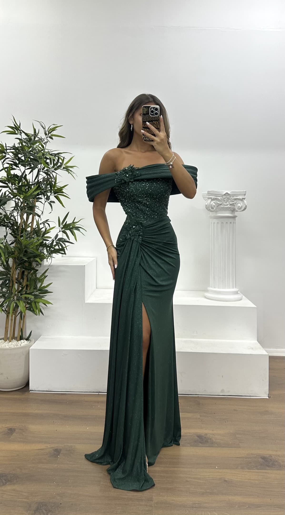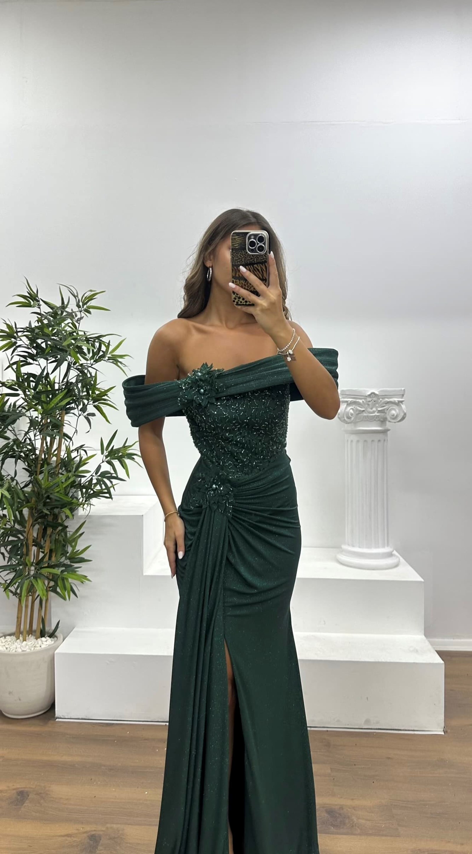 The boat-neck floral detailed evening dress is designed to fit sizes 36–42, with padded bust, full lining, back zipper closure, slit, and elegant embroidery. Length: Varies between 170–175 cm. Fabric type: Jersey lycra-polyester. An ideal choice to stand out with elegance at weddings, engagements, graduations, or special occasions.