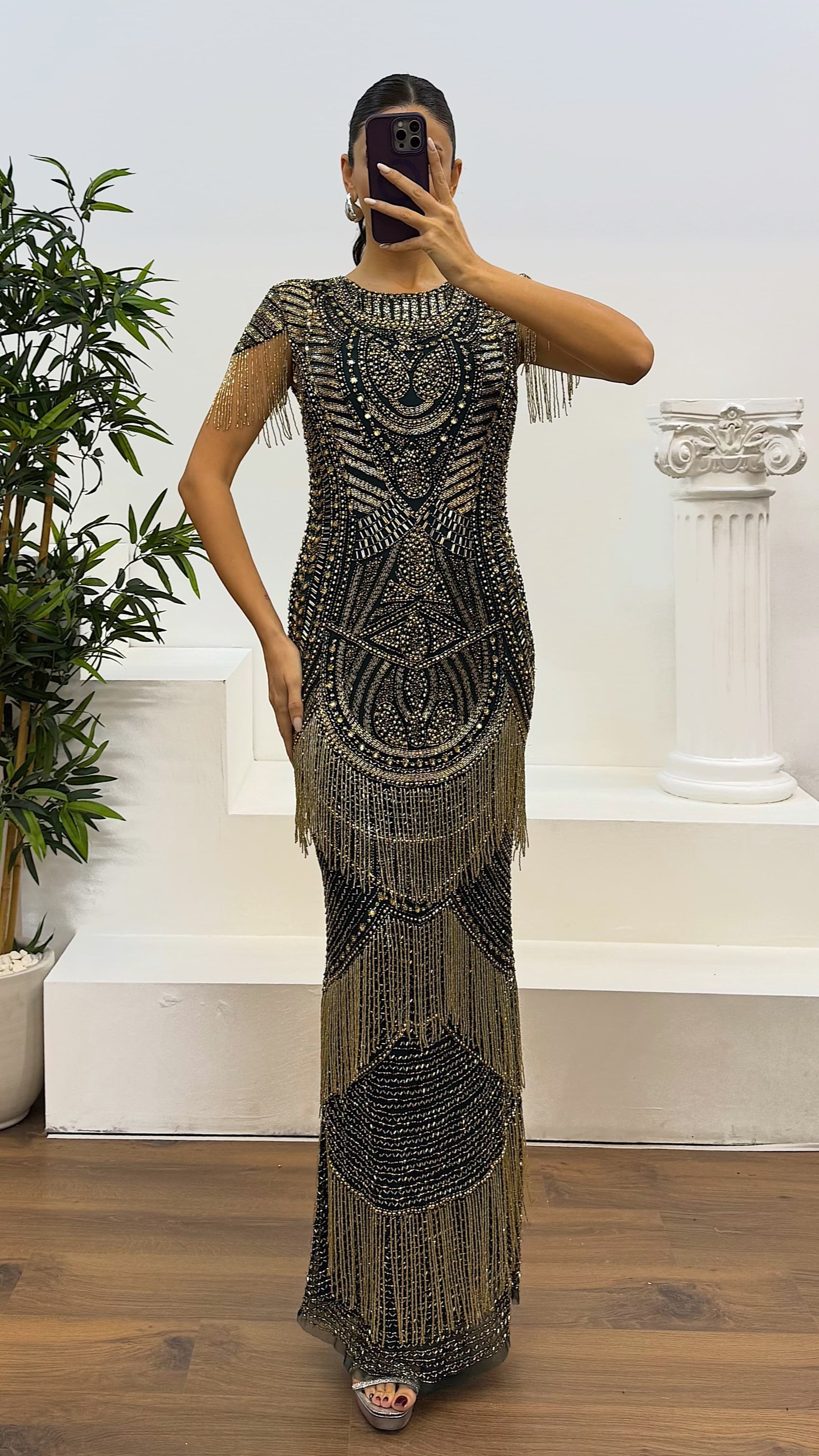 • Gold Kısa Kol El İşlemesi Tasarım Abiye Elbise
