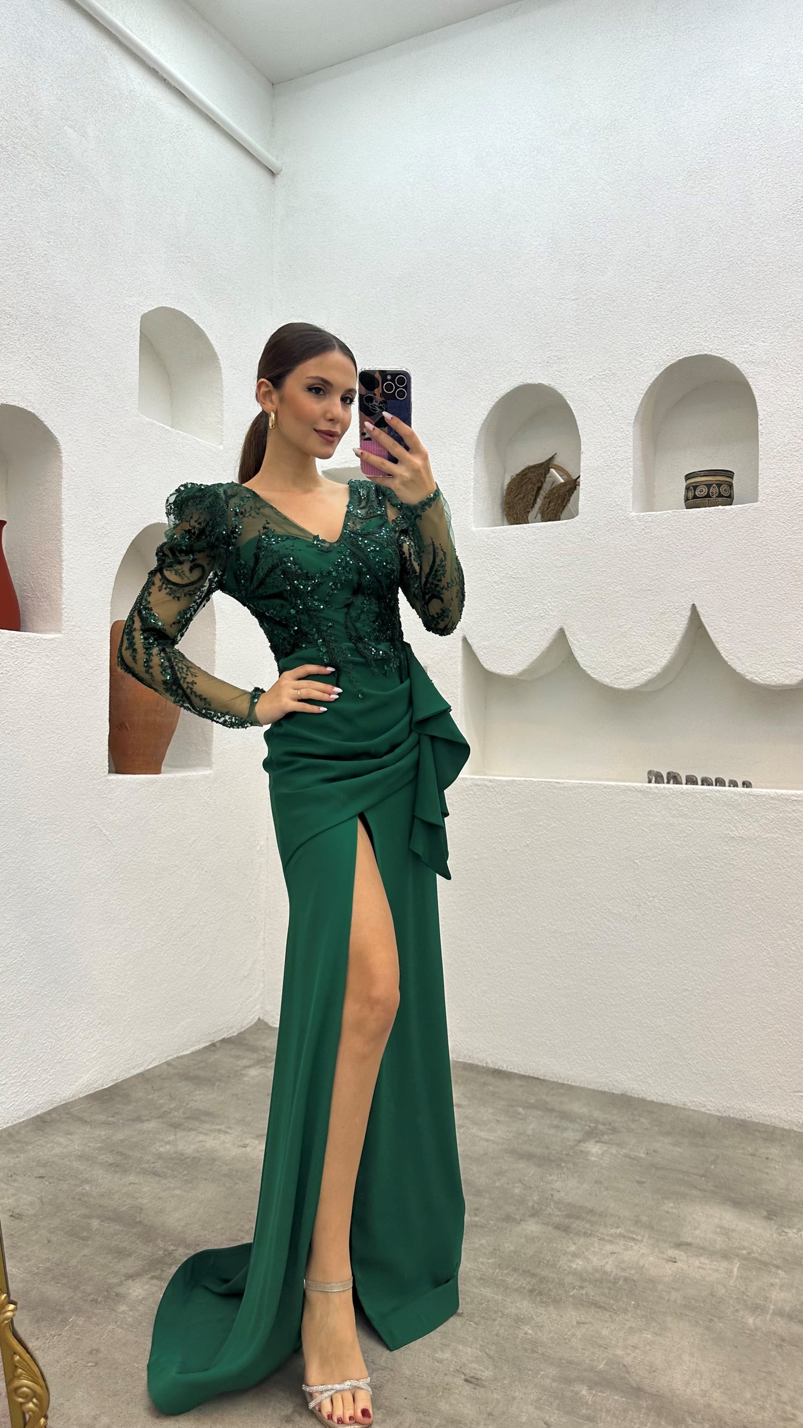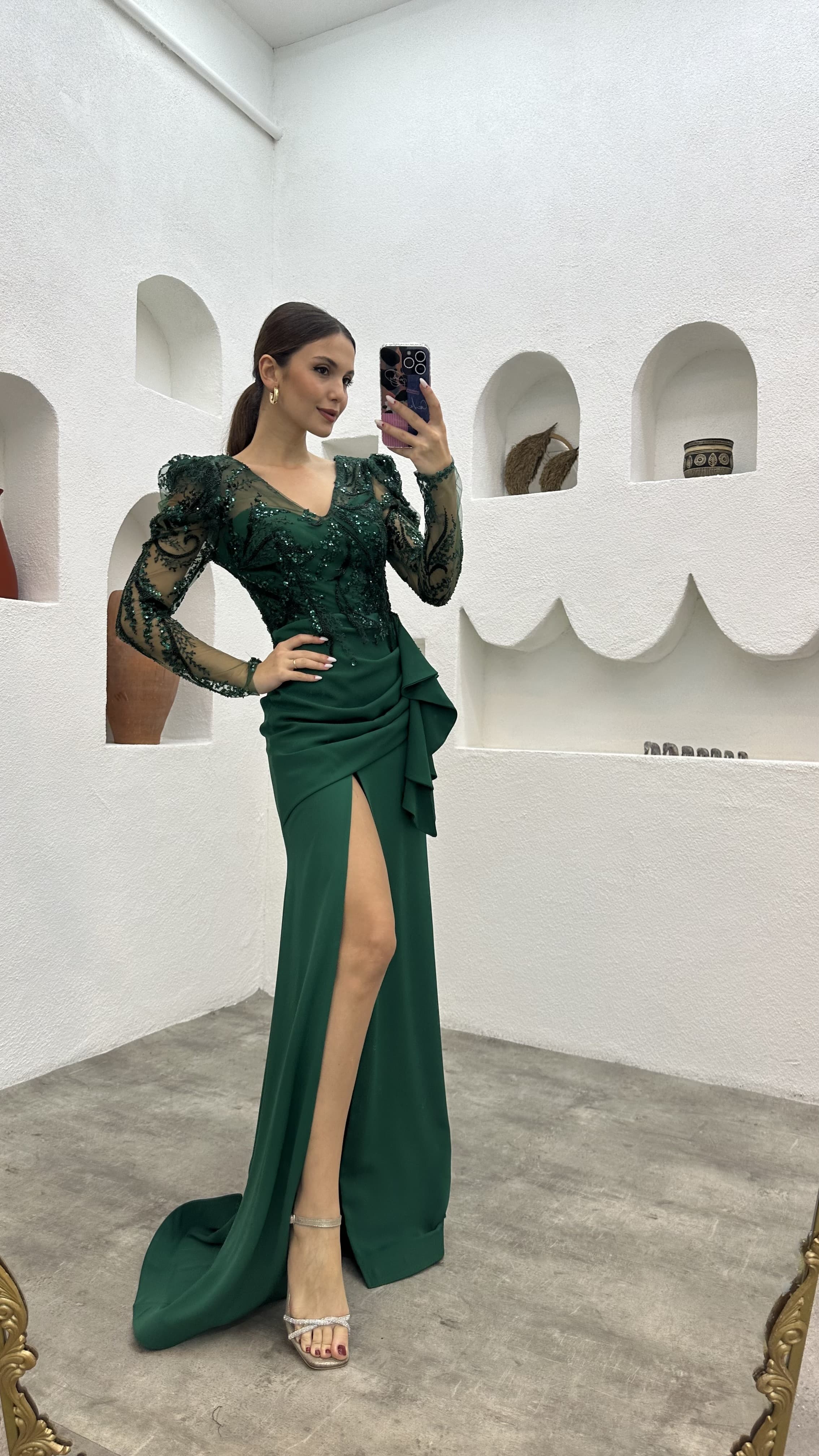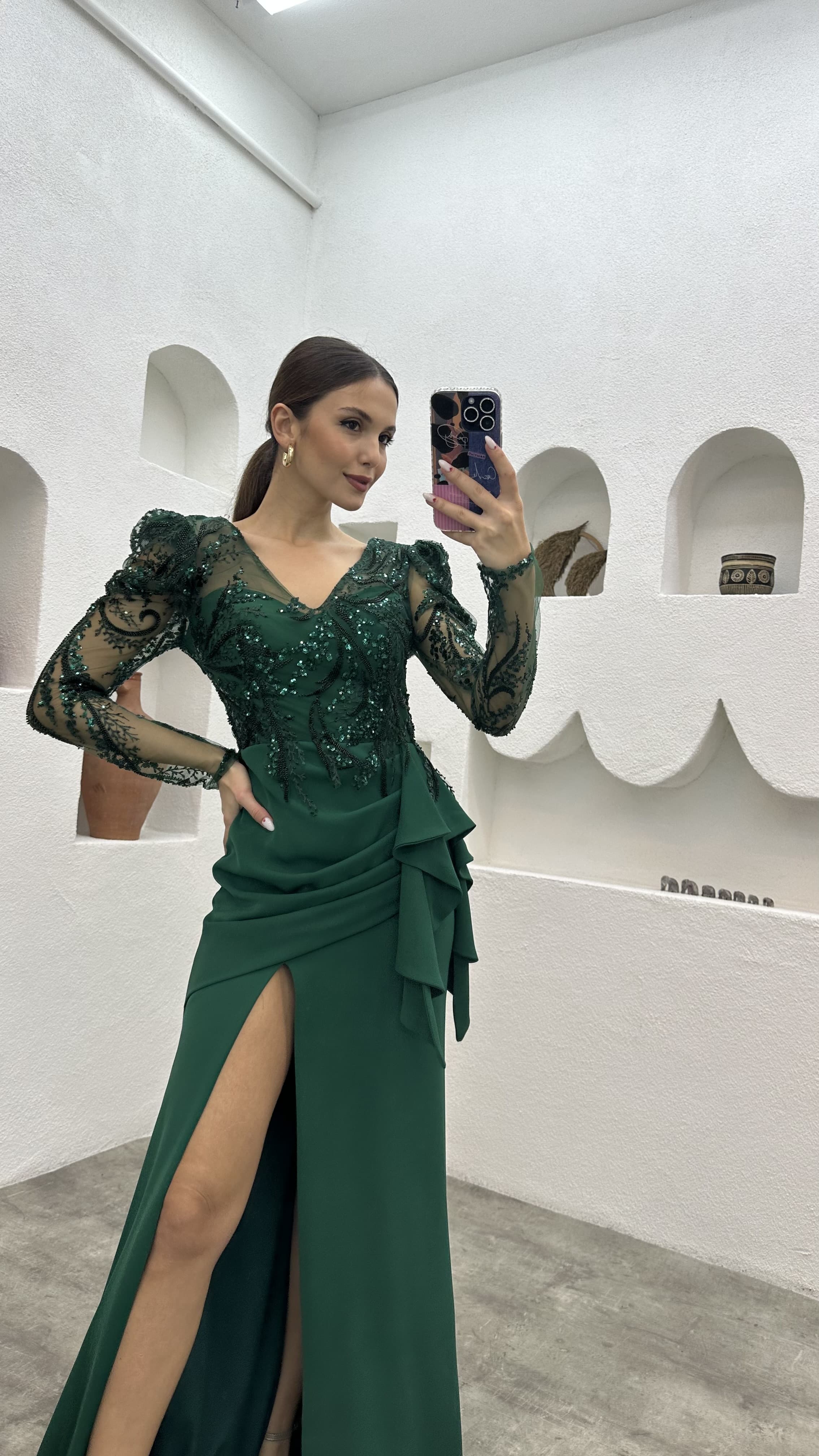 • Zümrüt Payet Detay Volanlı Abiye Elbise