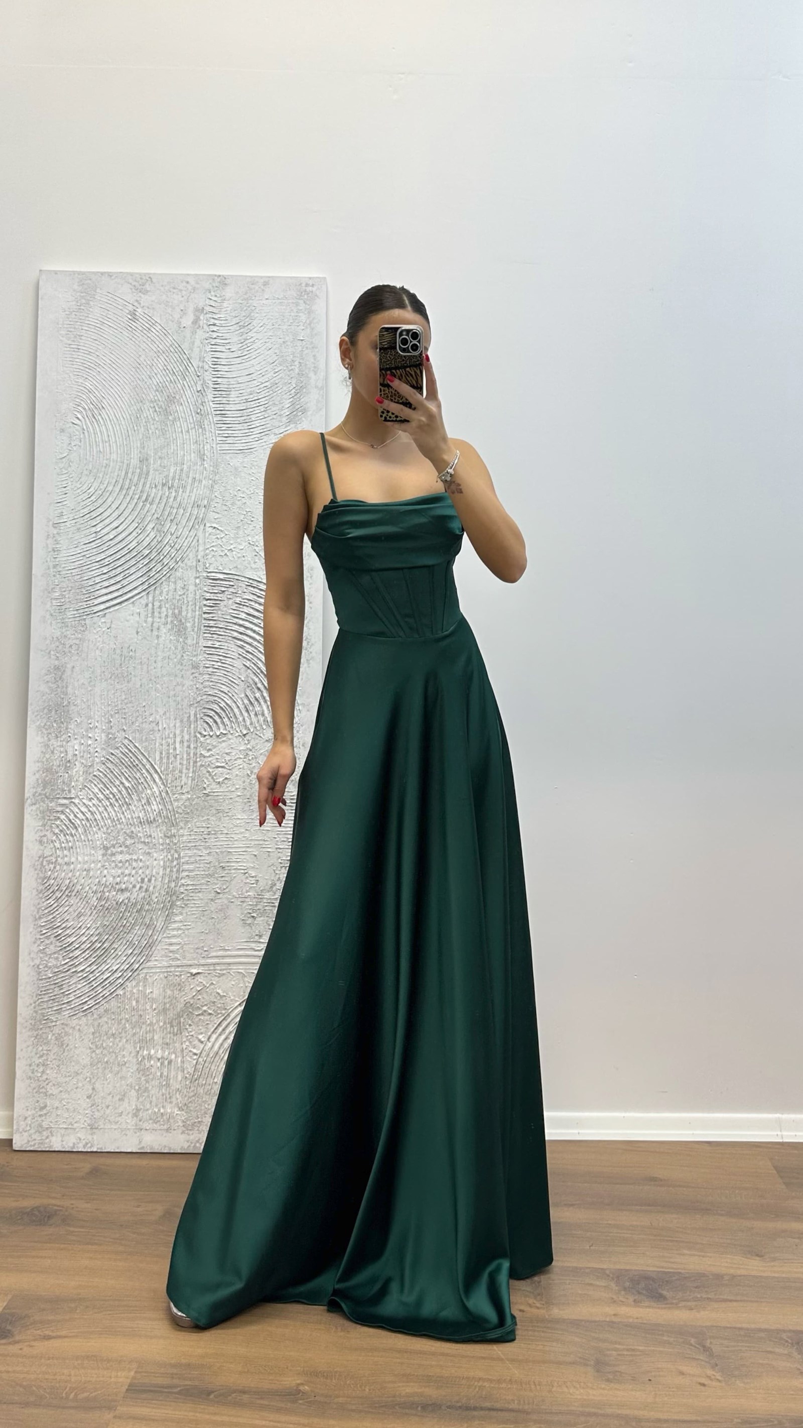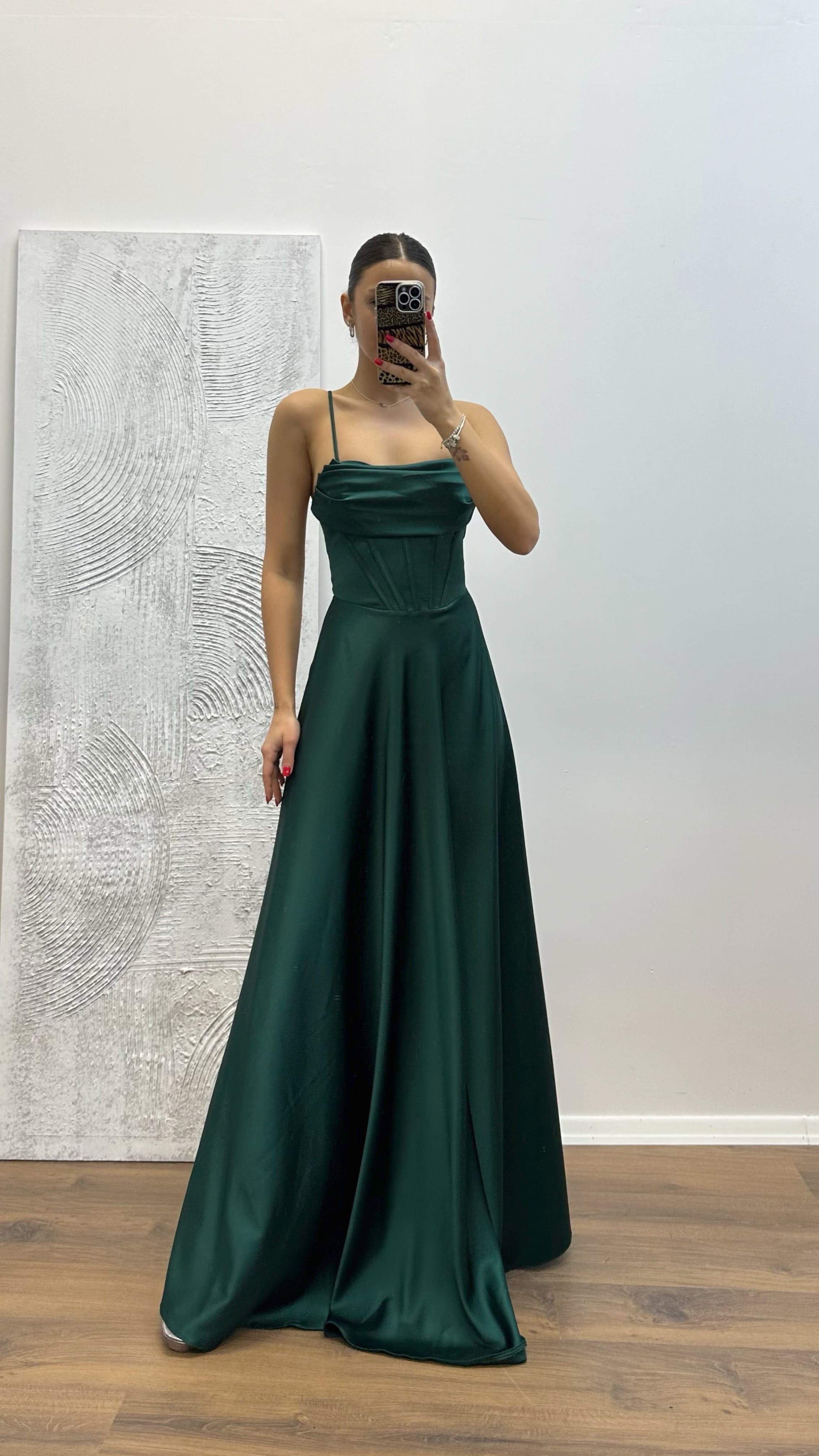 • Zümrüt Sırt Detay Saten Abiye Elbise