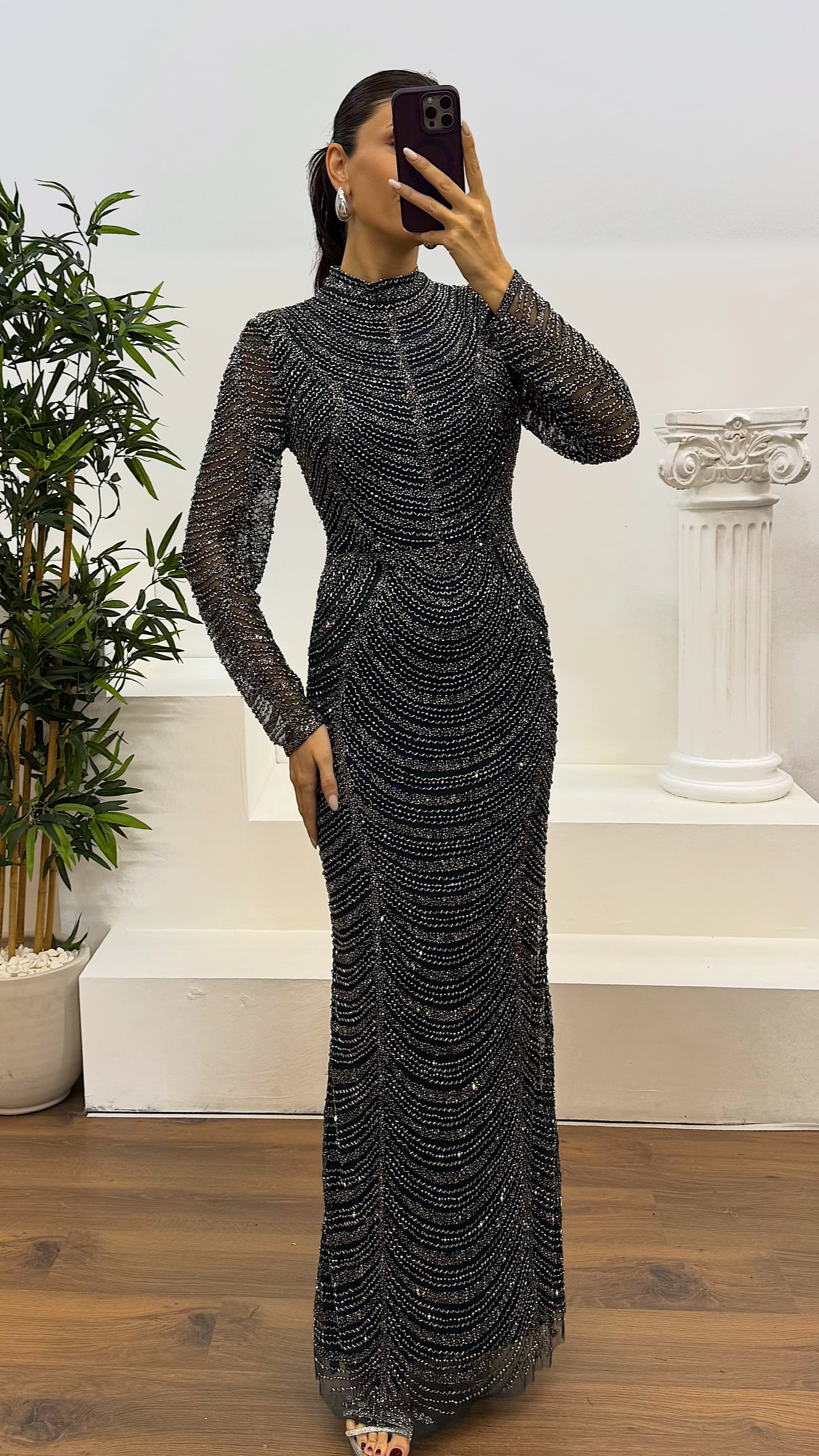 • Antrasit Uzun Kol El İşlemesi Tasarım Abiye Elbise