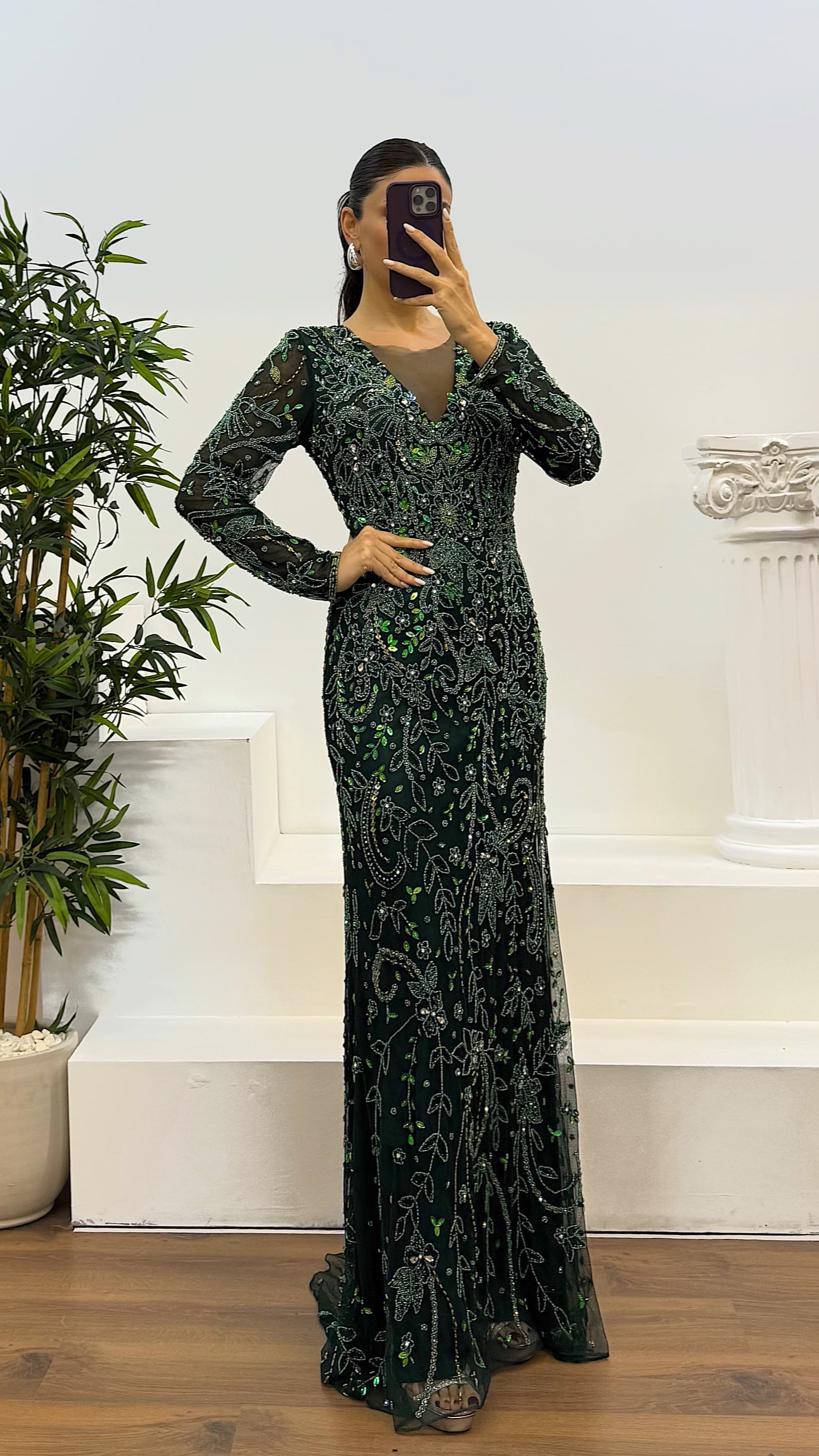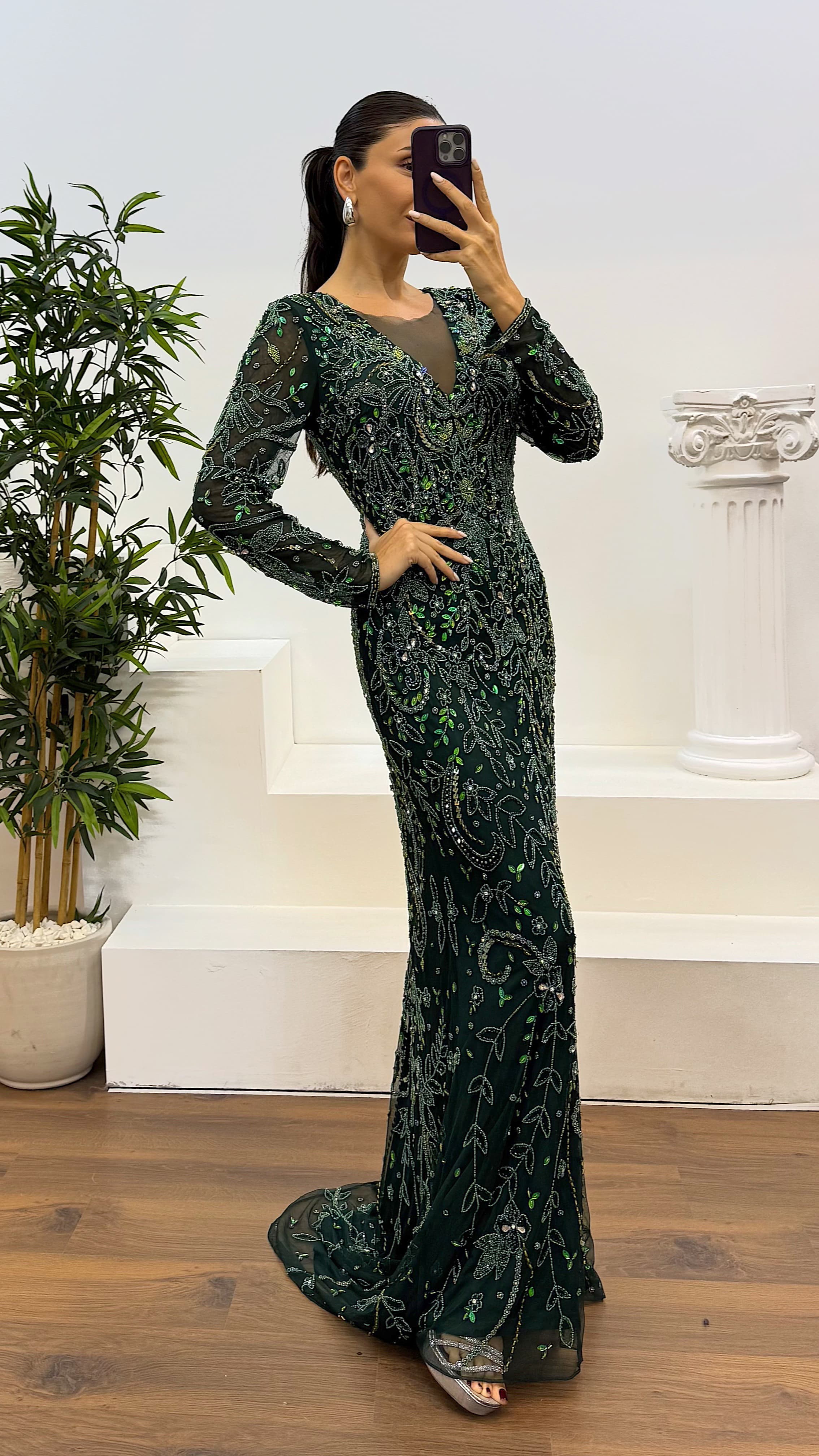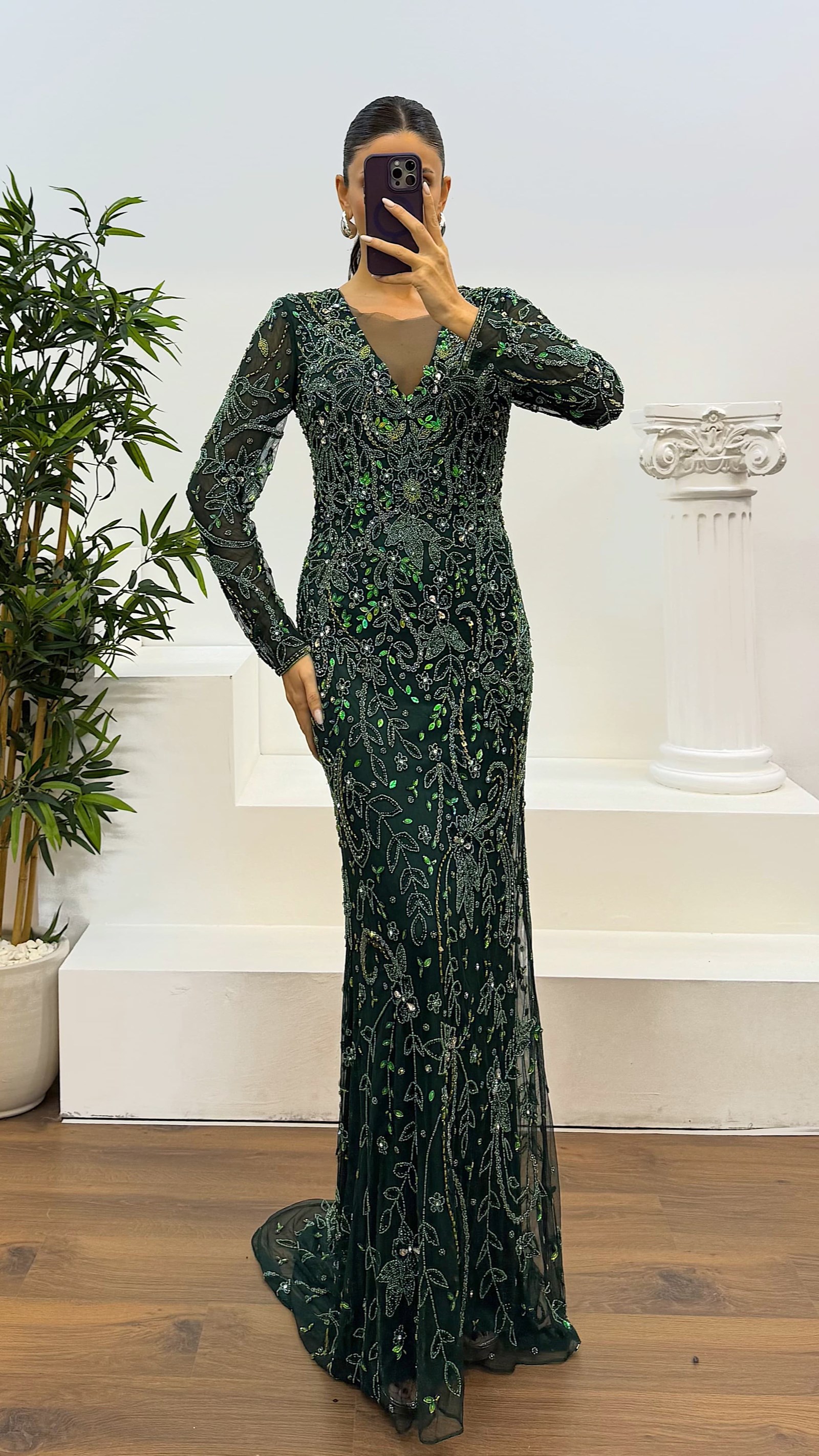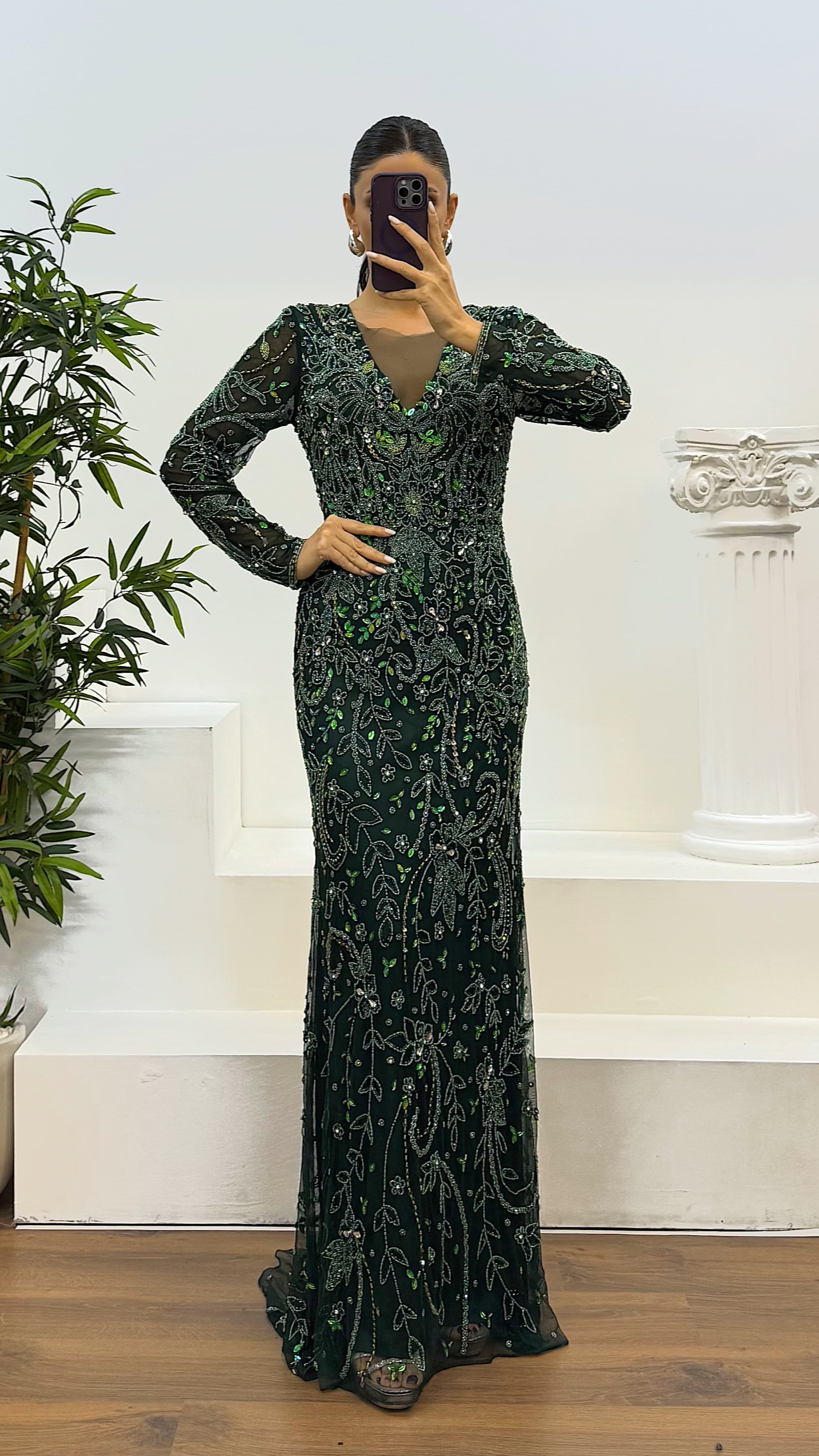 V-neck embroidered evening dress The product is compatible with sizes 36-42, featuring padded cups, lining, a back zipper closure, and designed as an embroidered evening dress. Product length: May vary between 165 and 170 cm. Product sleeve length: 60 cm. Fabric type: Embroidered tulle, 3% Lycra, 97% Polyester.