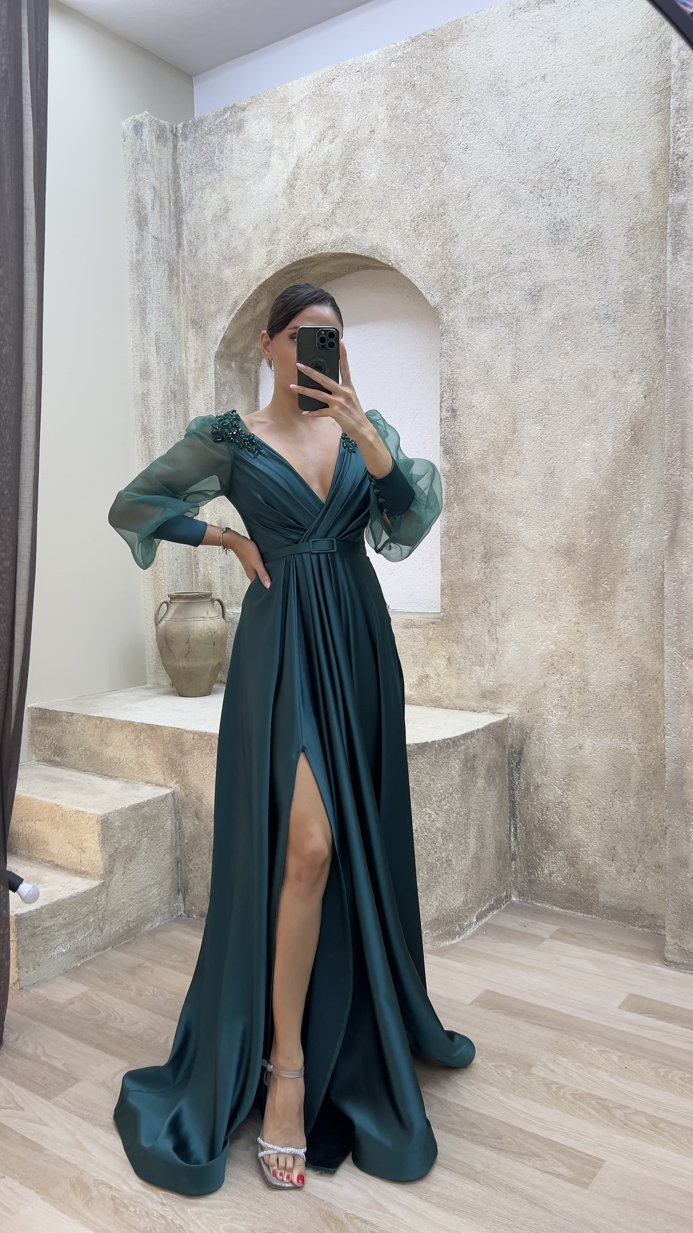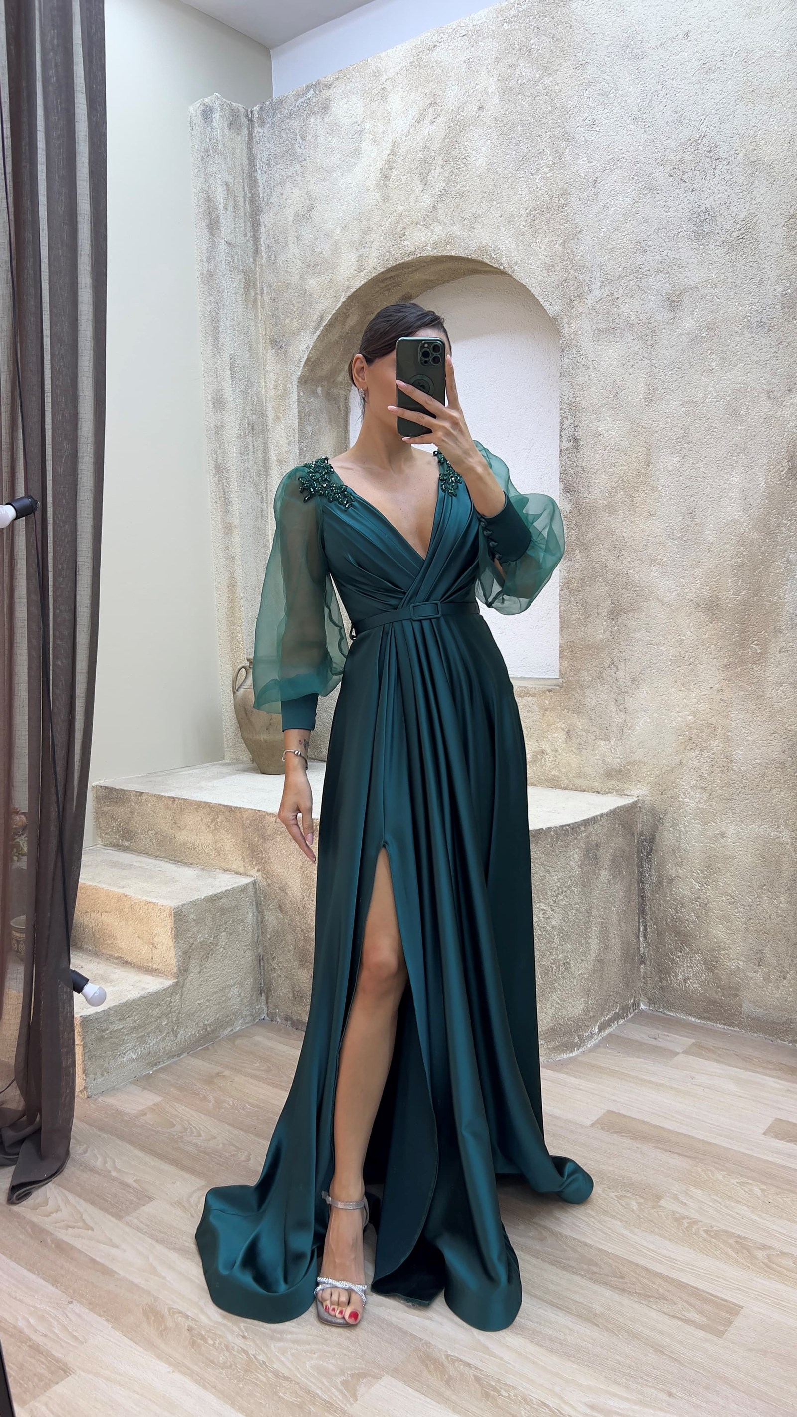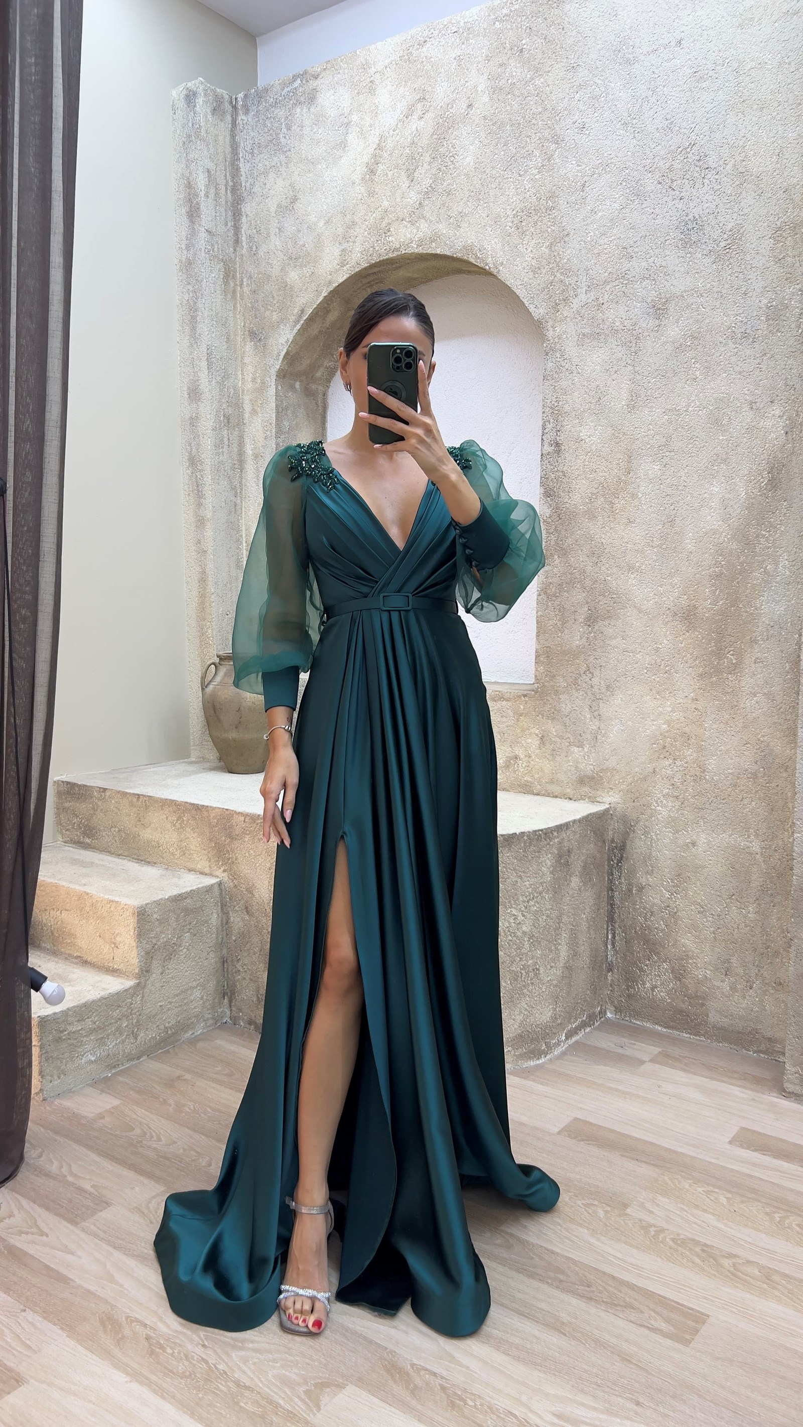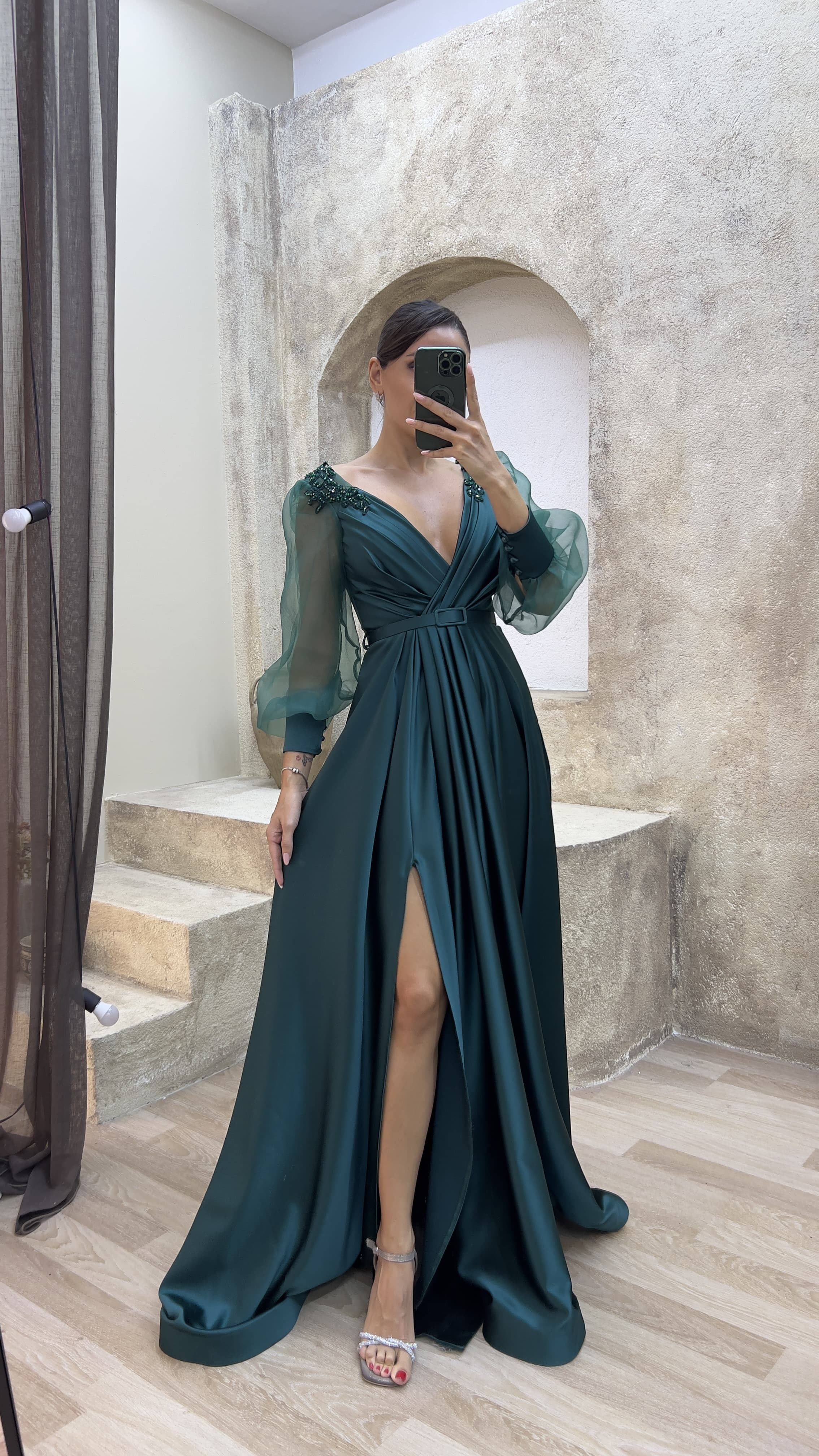 • Zümrüt Yeşili Balon Kol İşleme Omuzları İşlemeli Tasarım Abiye Elbise