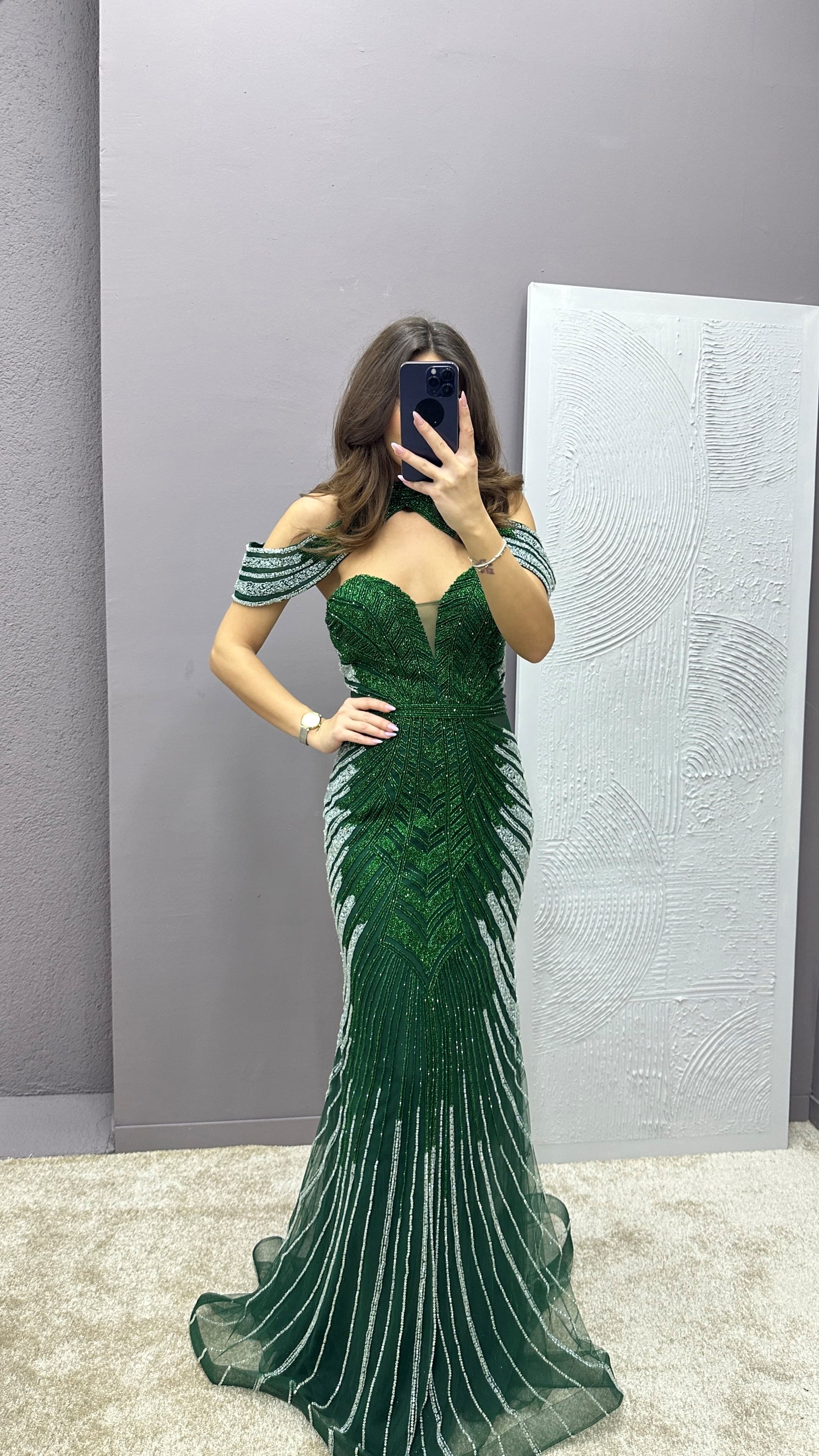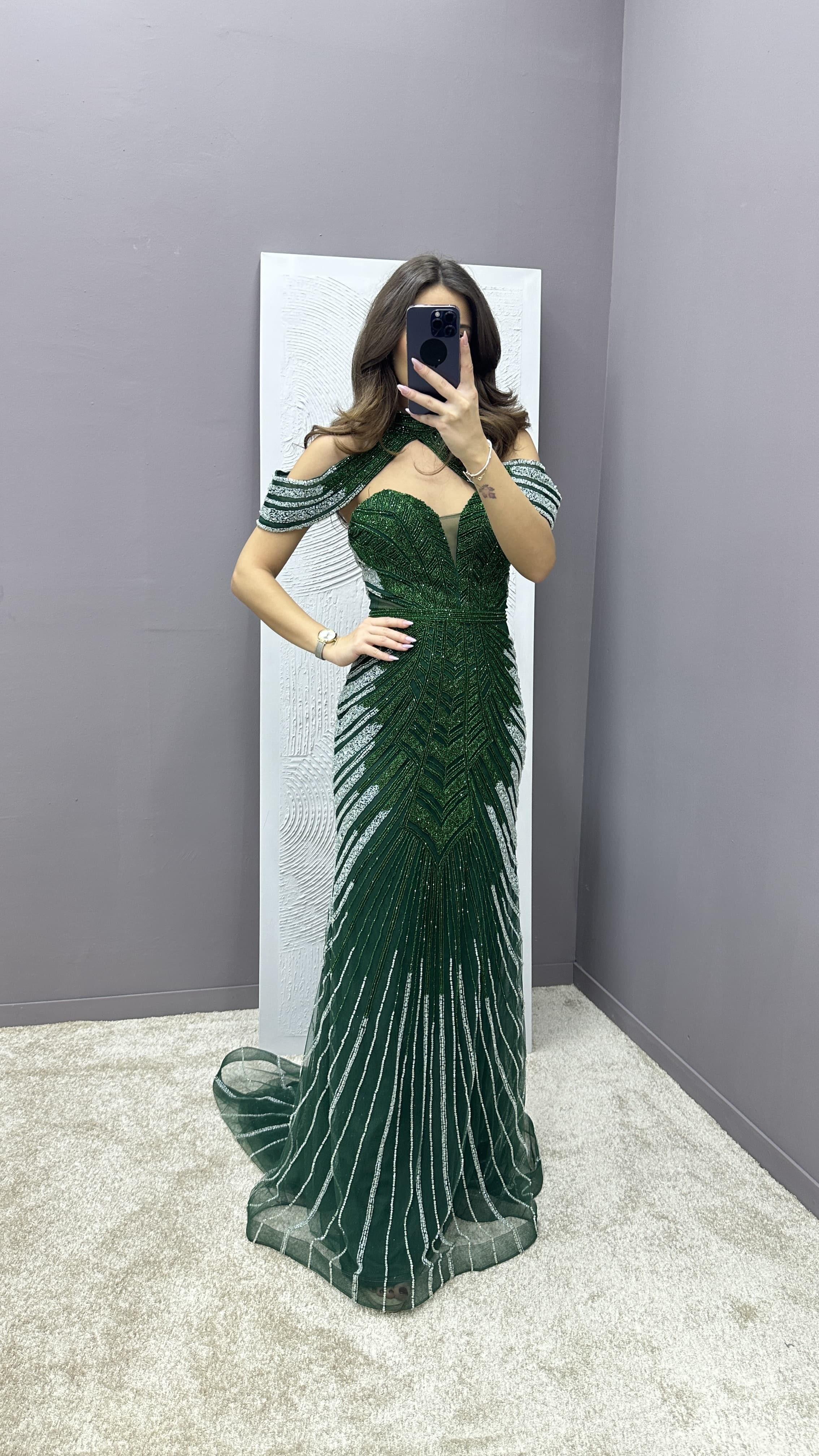 Emerald Green Neck Detail Embroidered Design Evening Dress