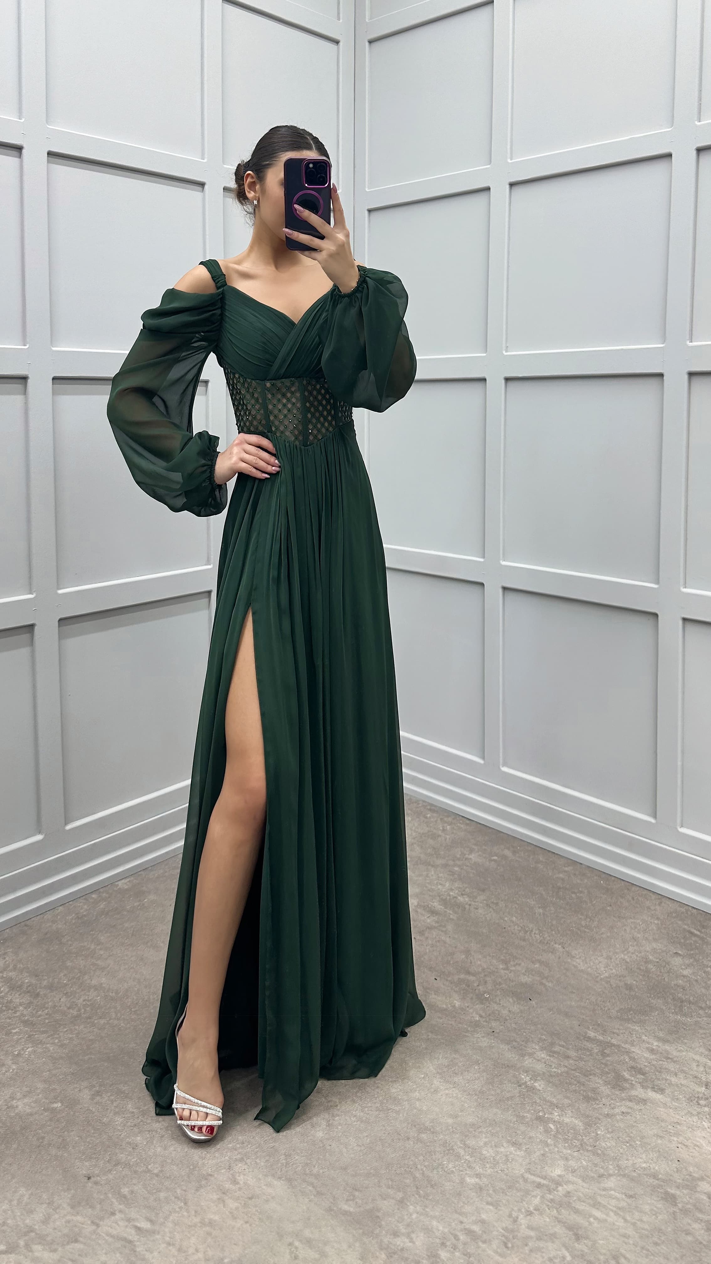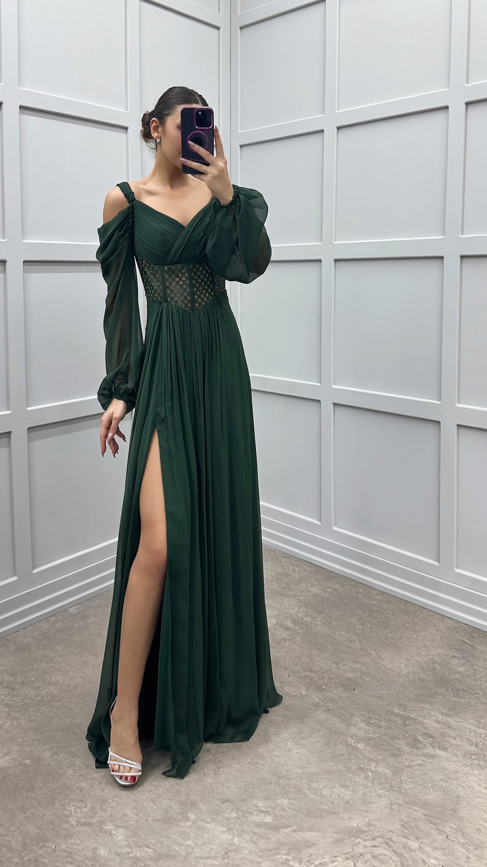 • Zümrüt Yeşili Omuz Detay Beli Transparan Tasarım Şifon Elbise