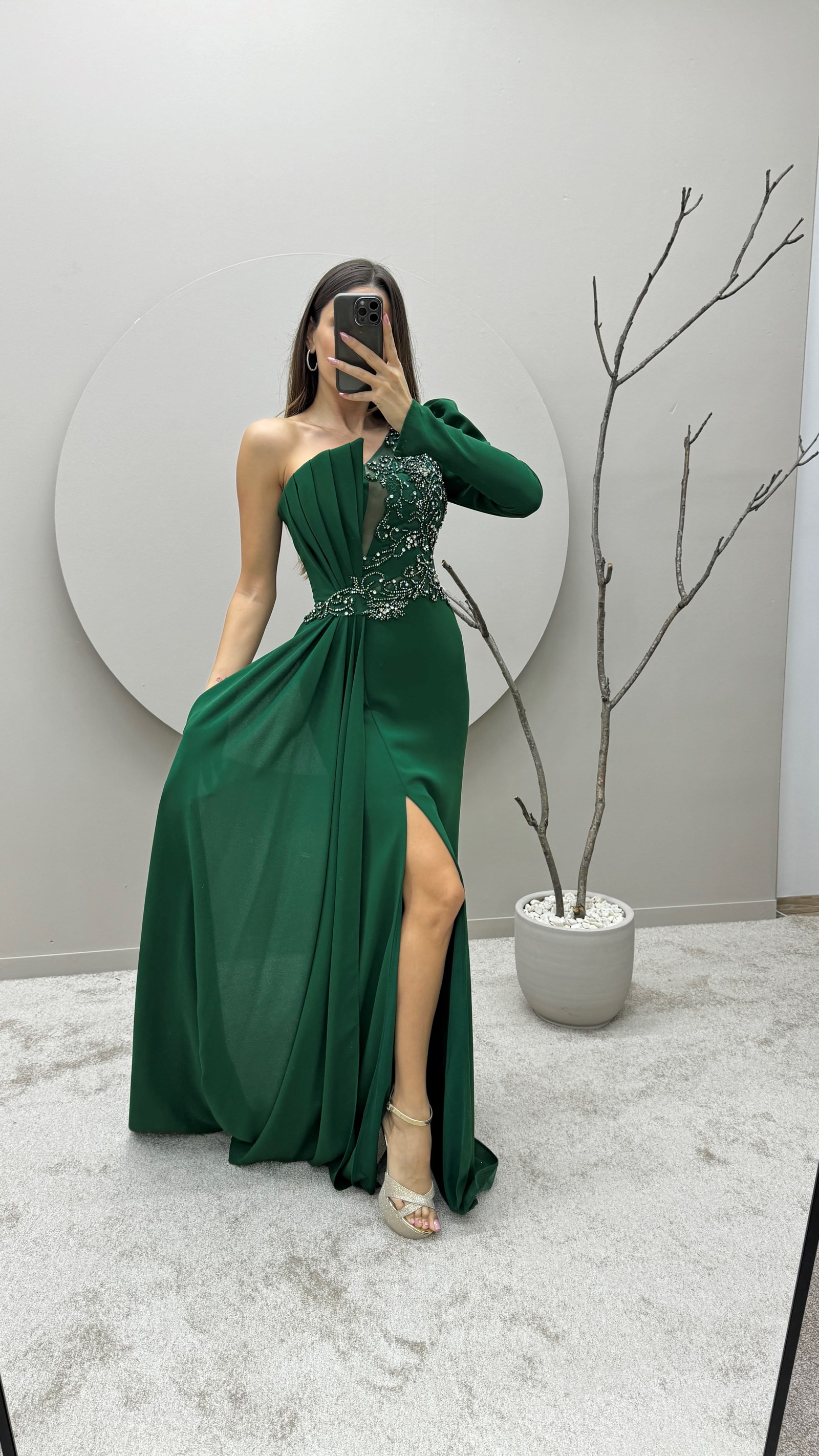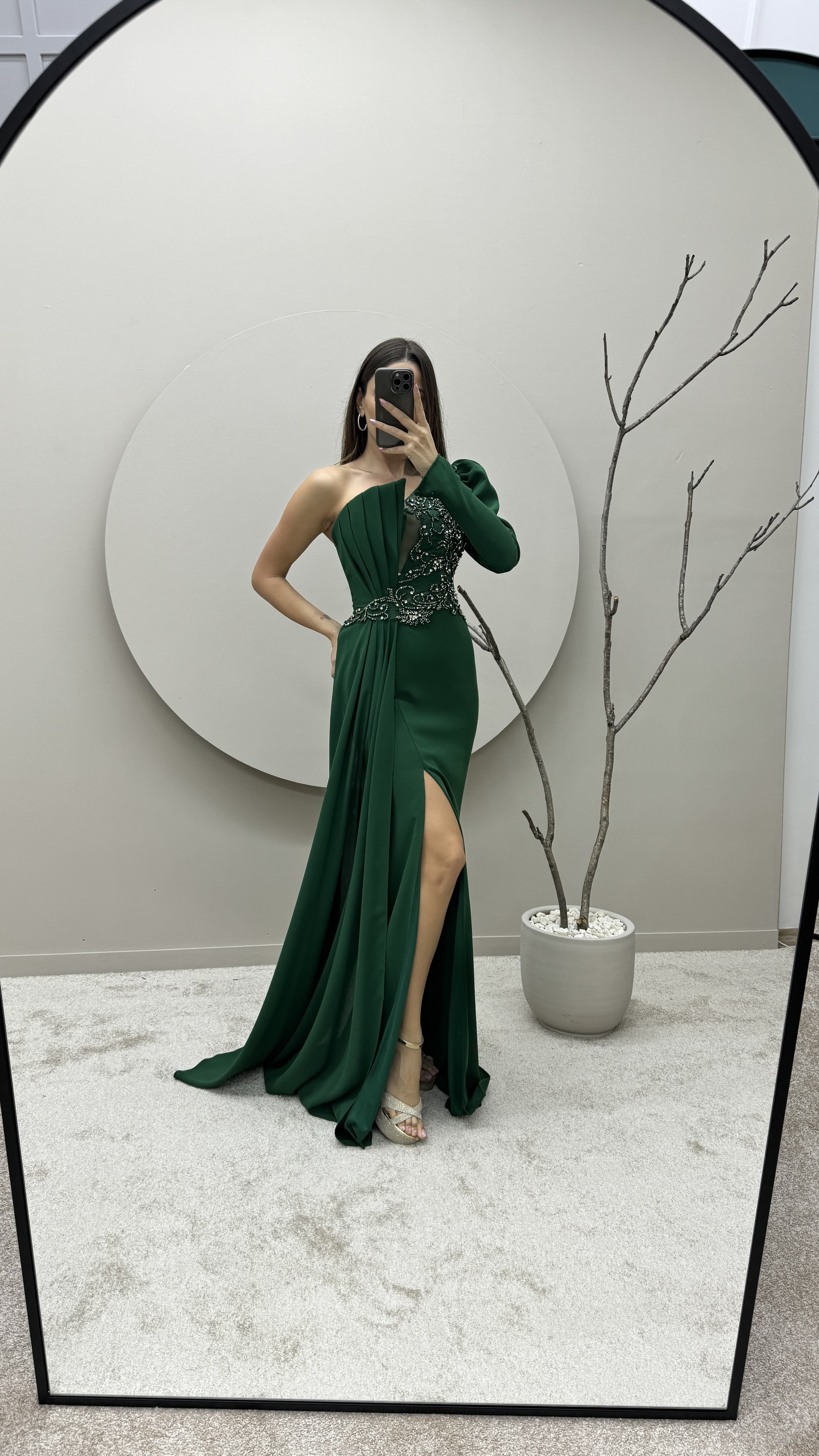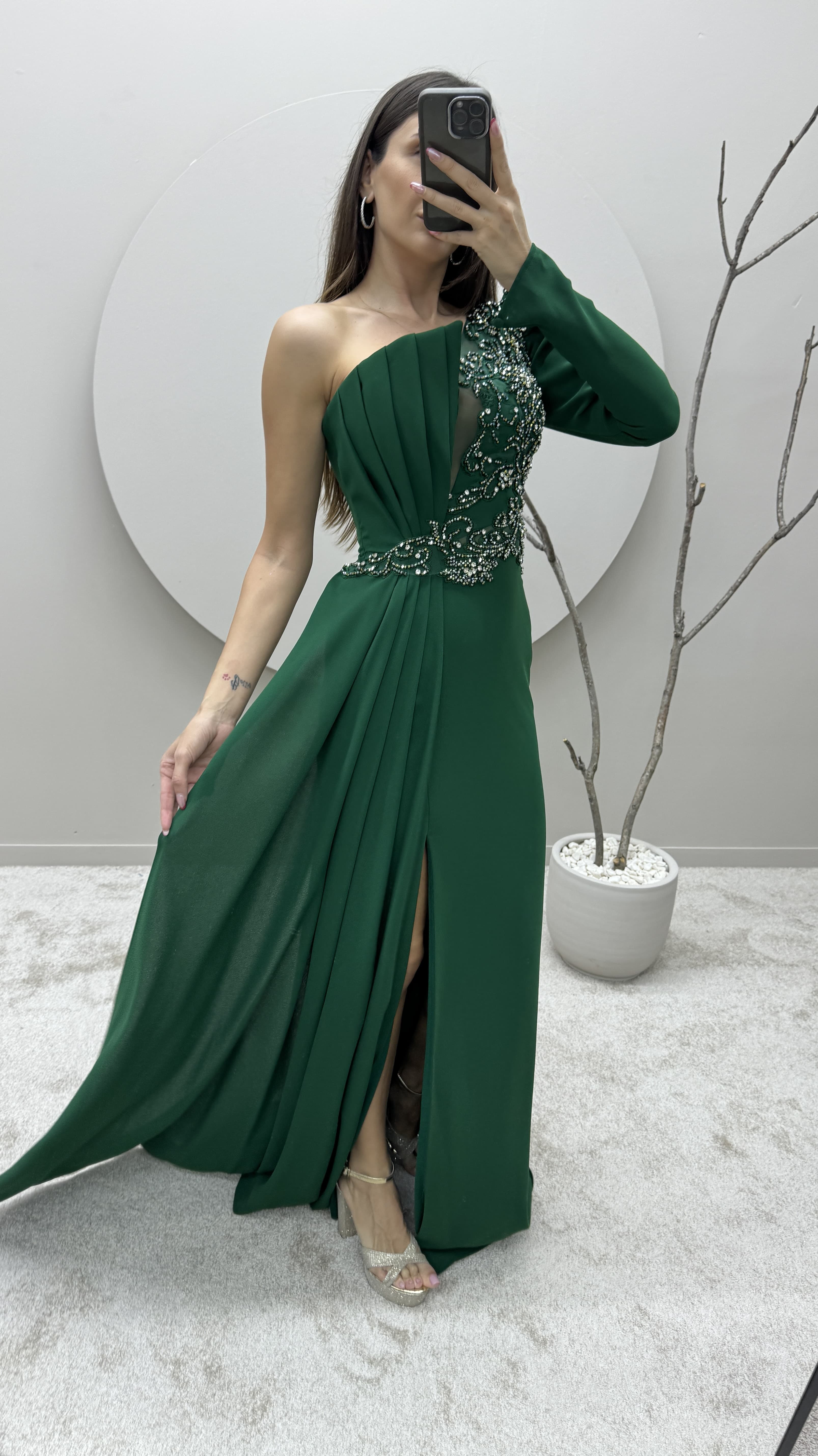 • Zümrüt Yeşili Tek Kol Plise Detay İşlemeli Tasarım Abiye Elbise