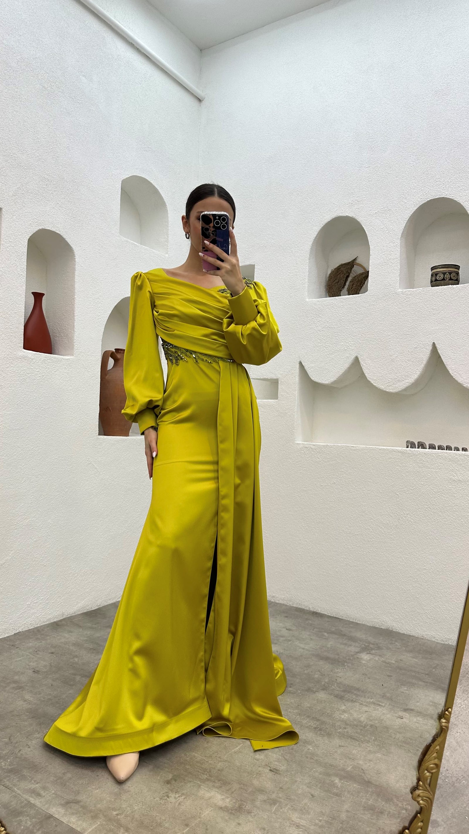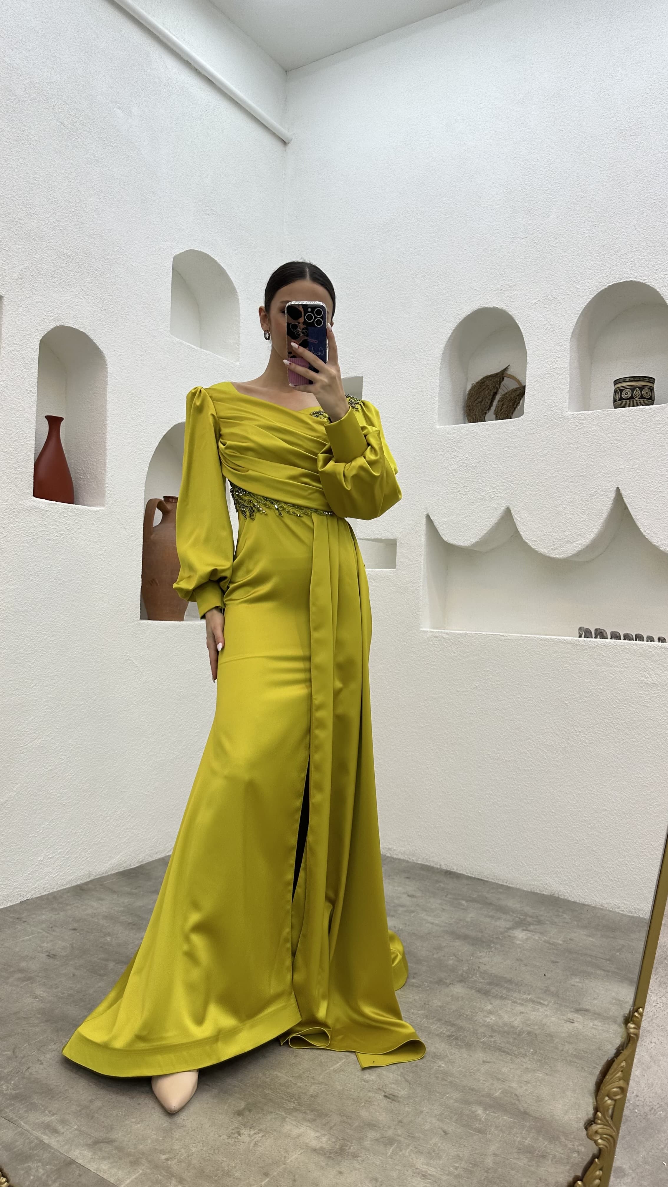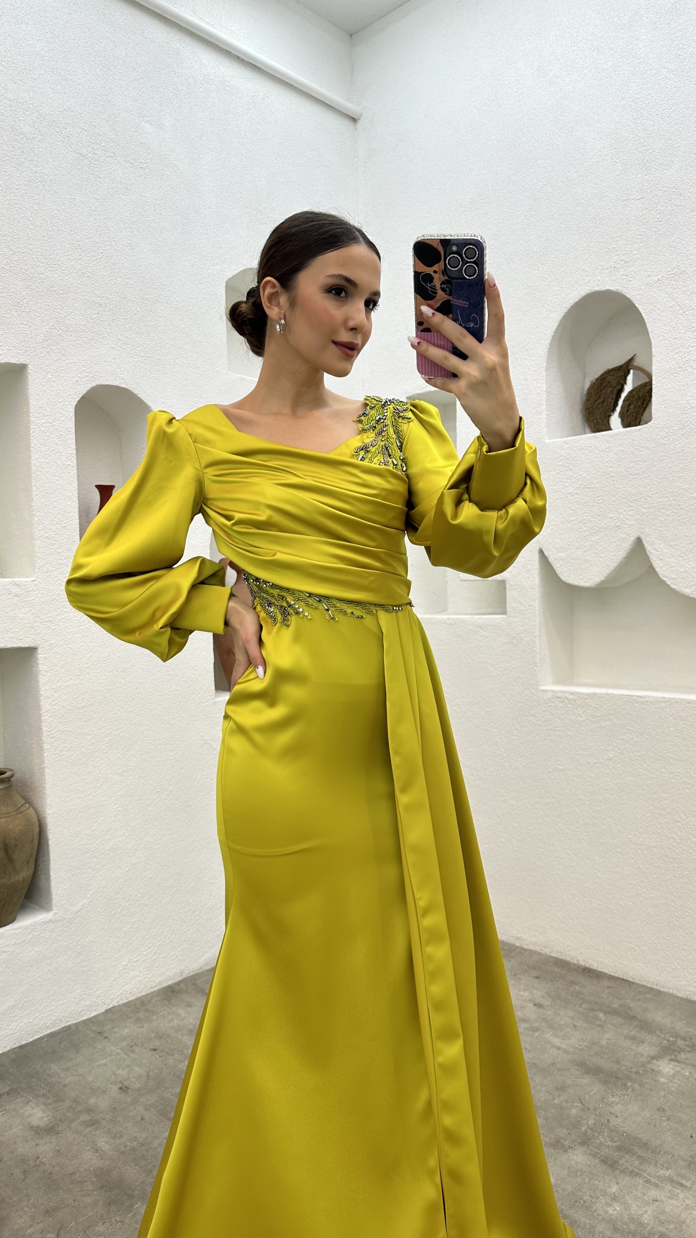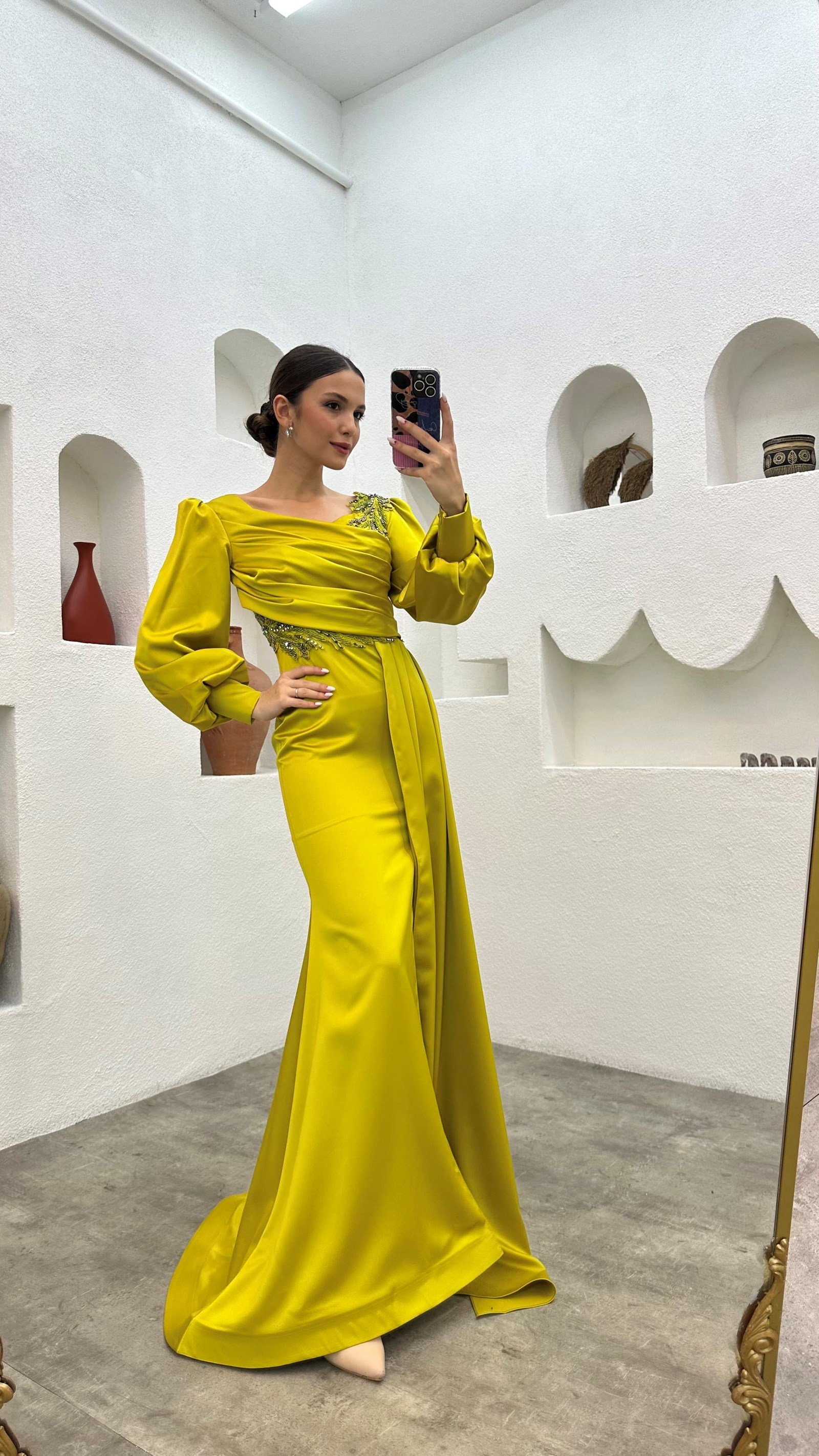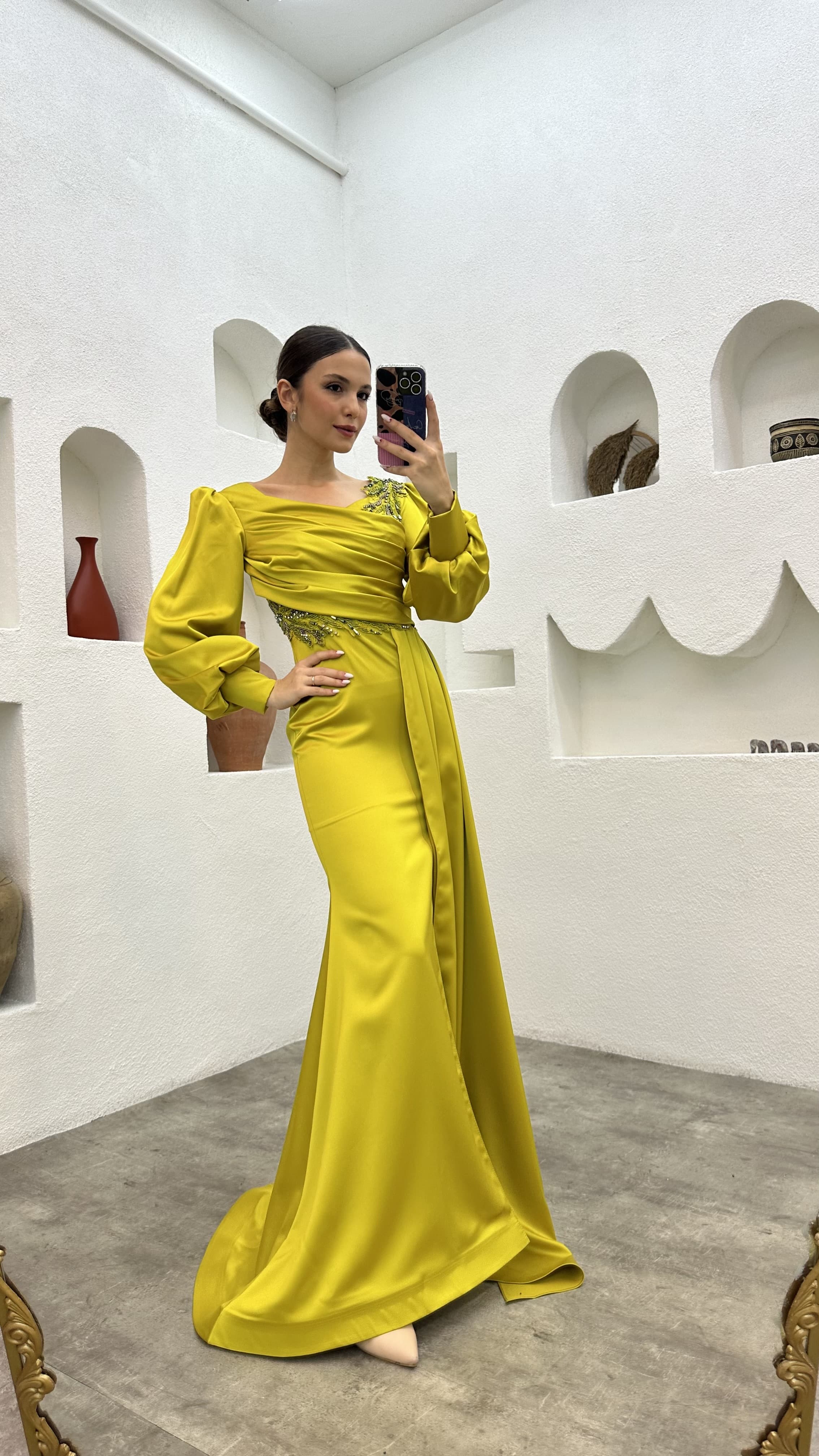 • Sarı İşlemeli Drapeli Saten Abiye Elbise
