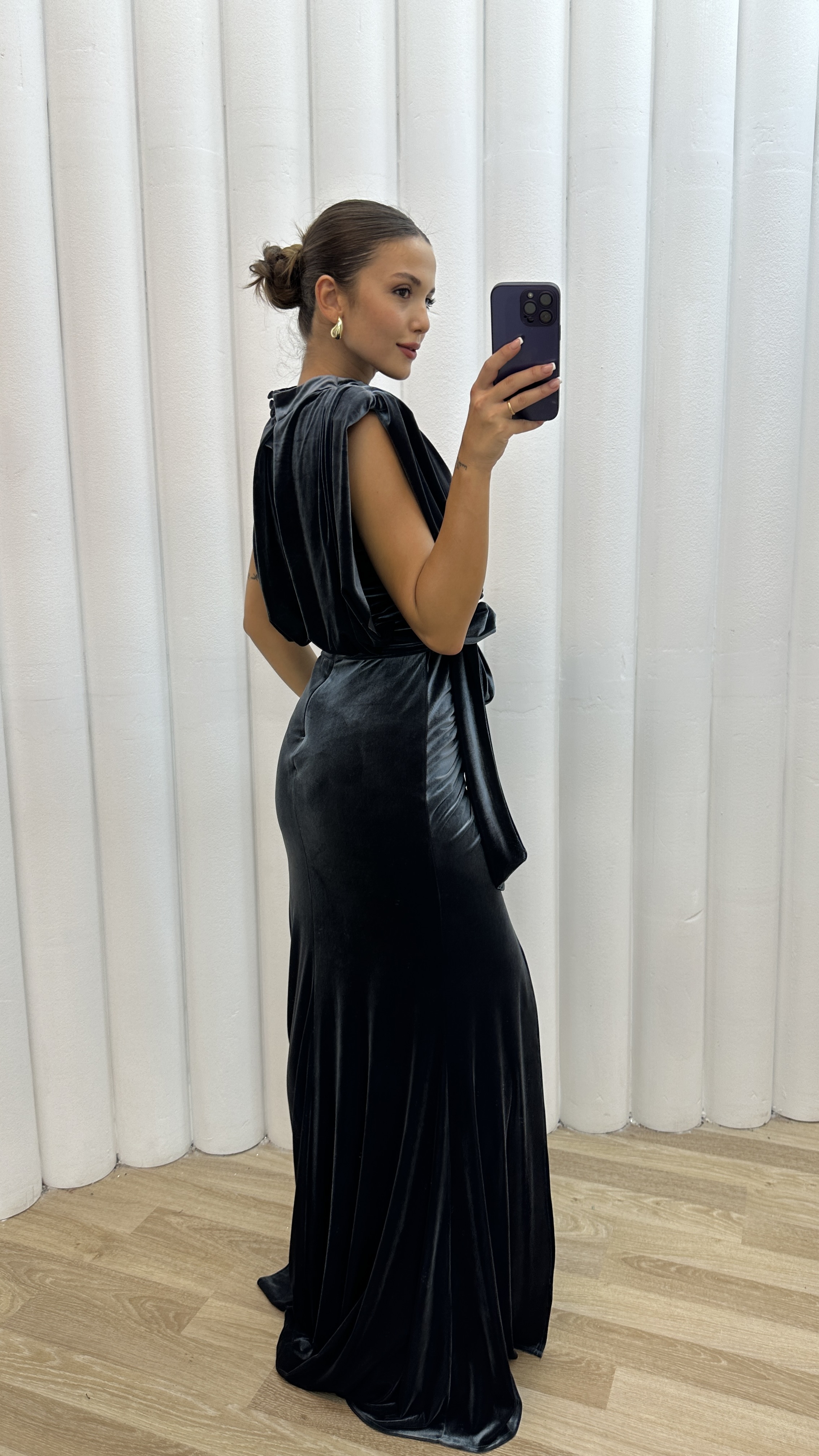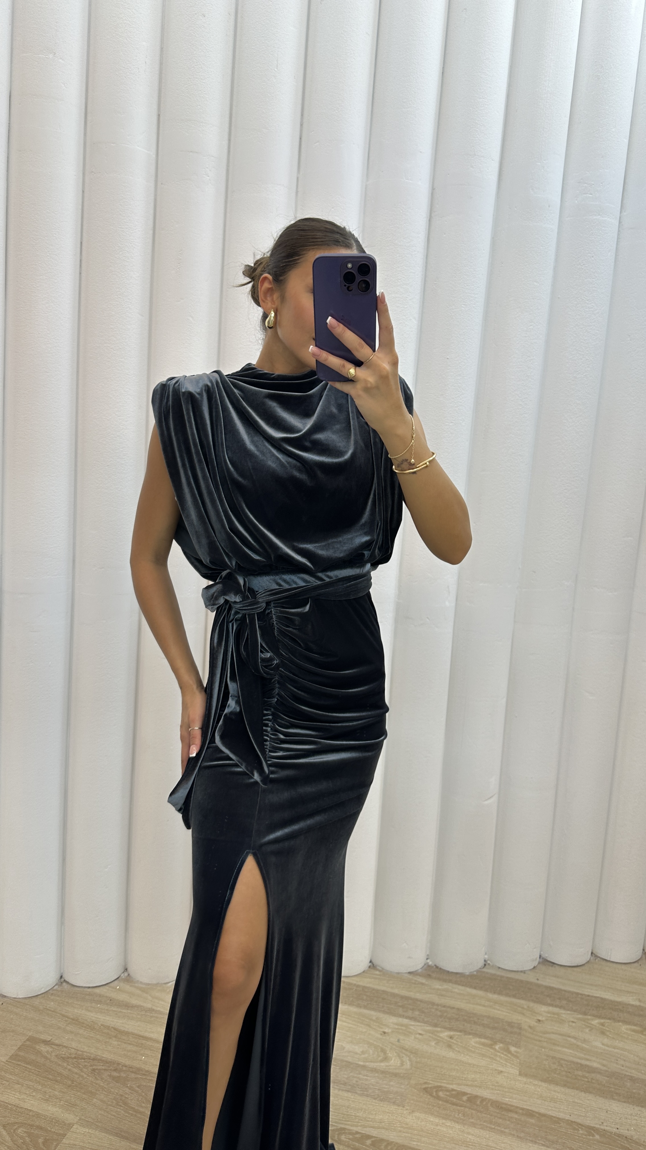 • Antrasit Yarasa Kol Kadife Abiye Elbise