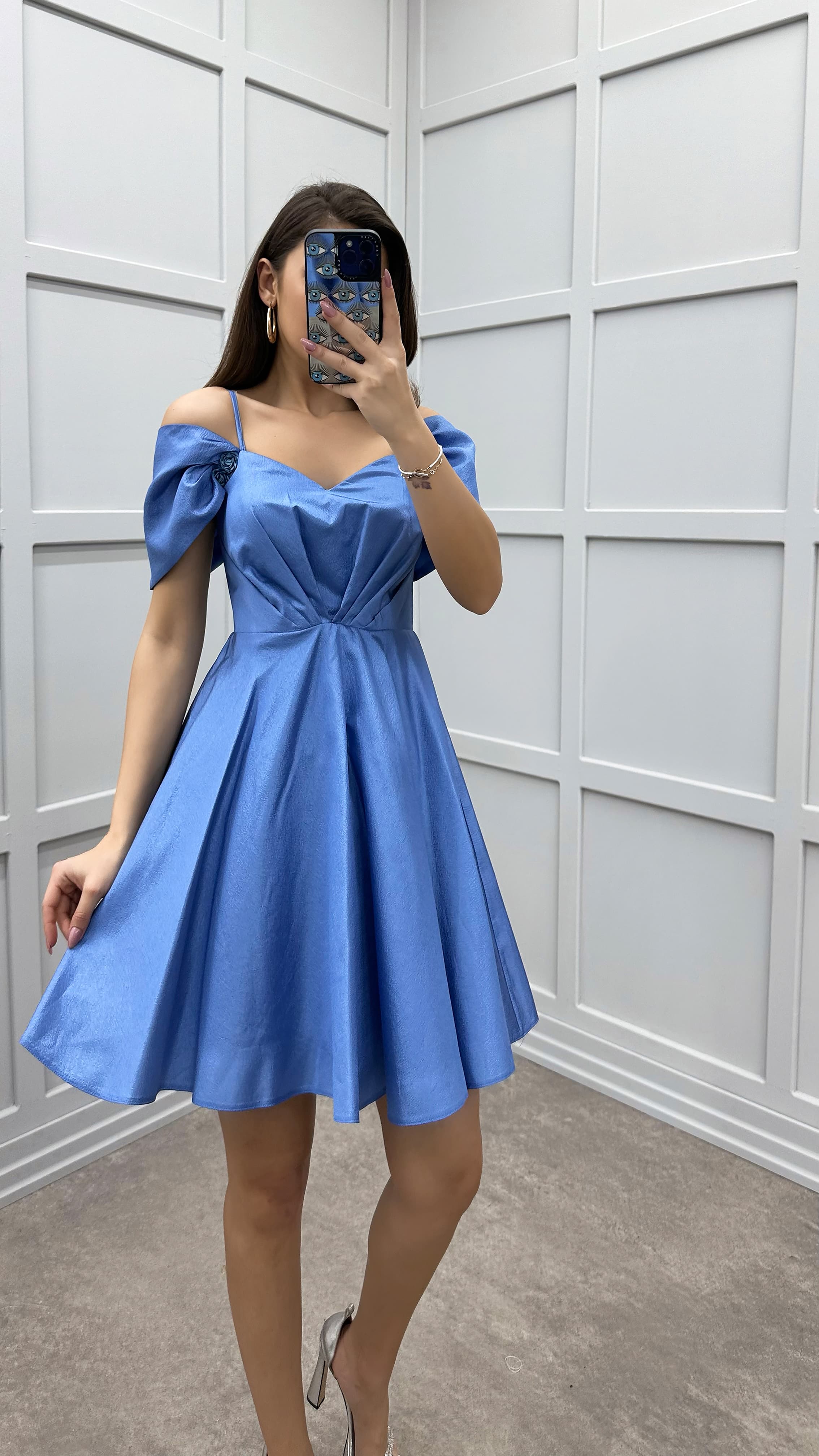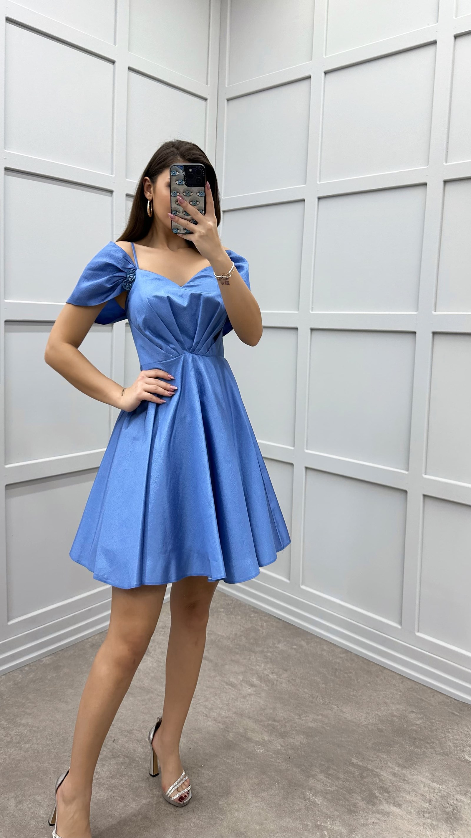 • İndigo Kalp Yaka Bel Detay Tasarım Mini Elbise