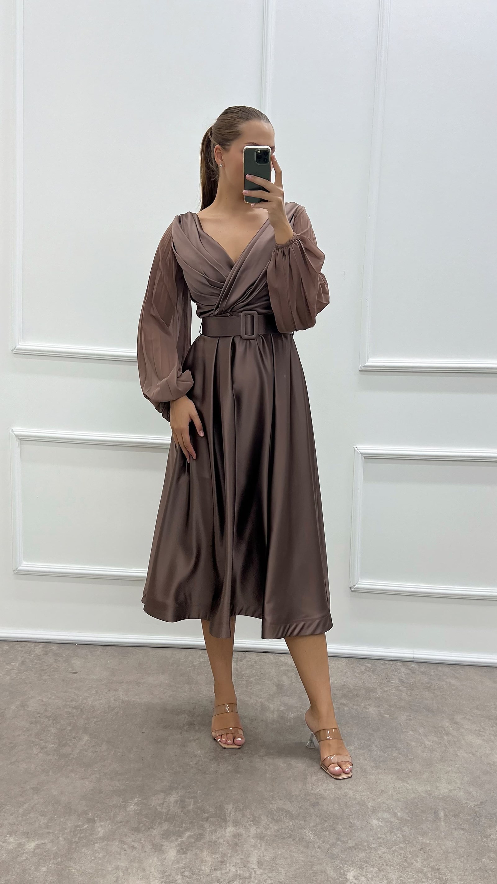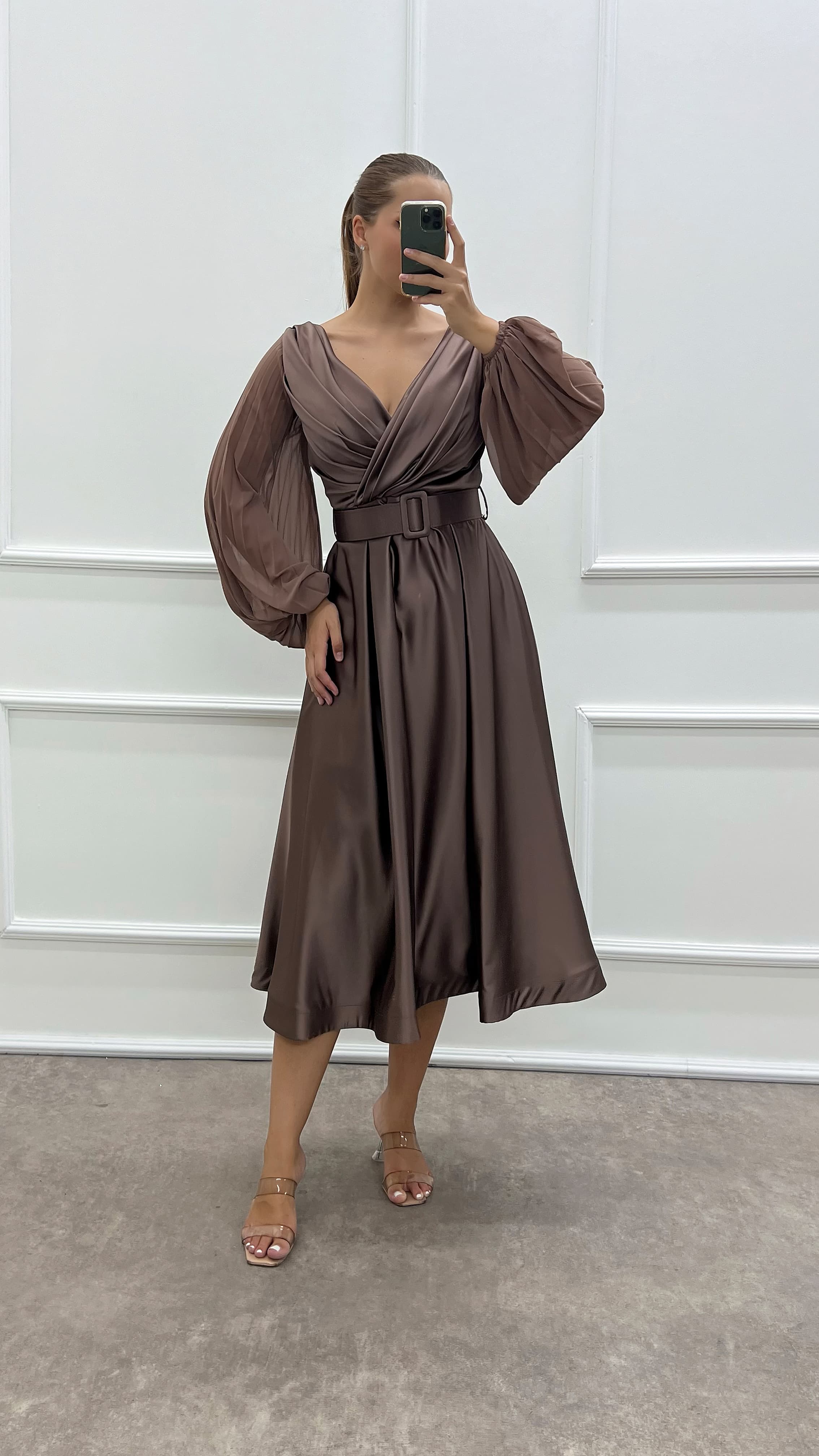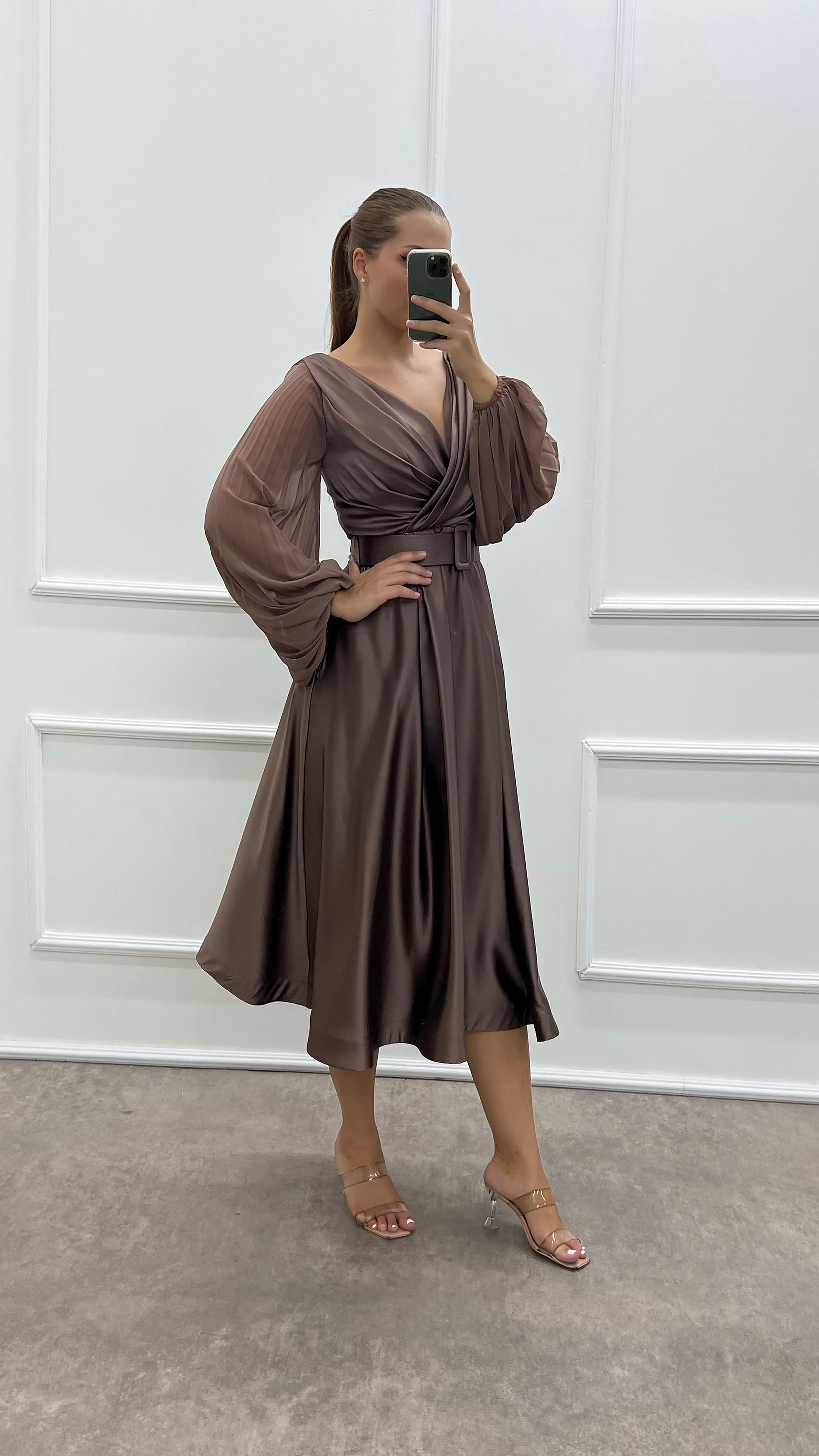 Kahverengi Göğsü Kruvaze Balon Kol Tasarım Büyük Beden Saten Elbise