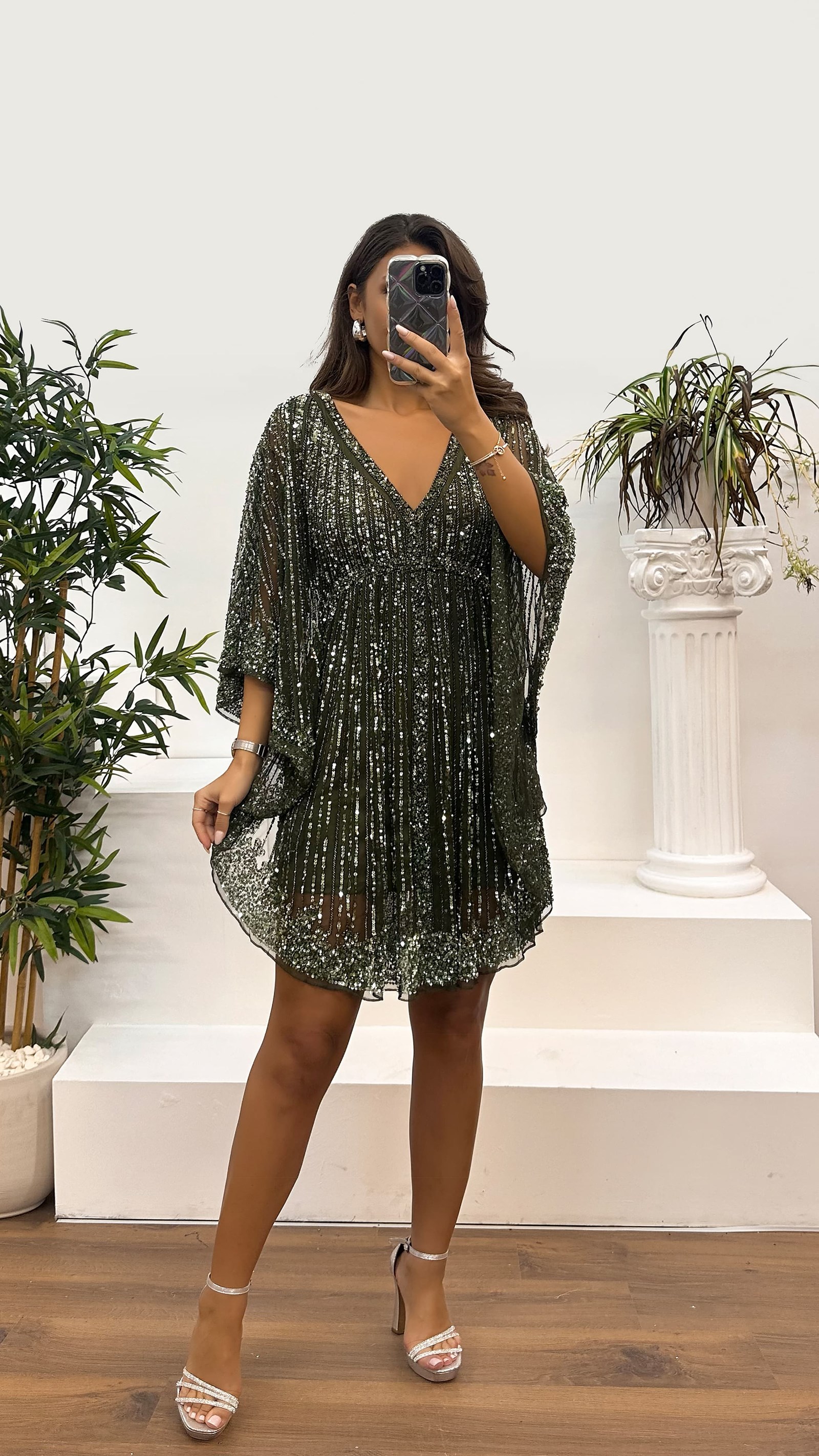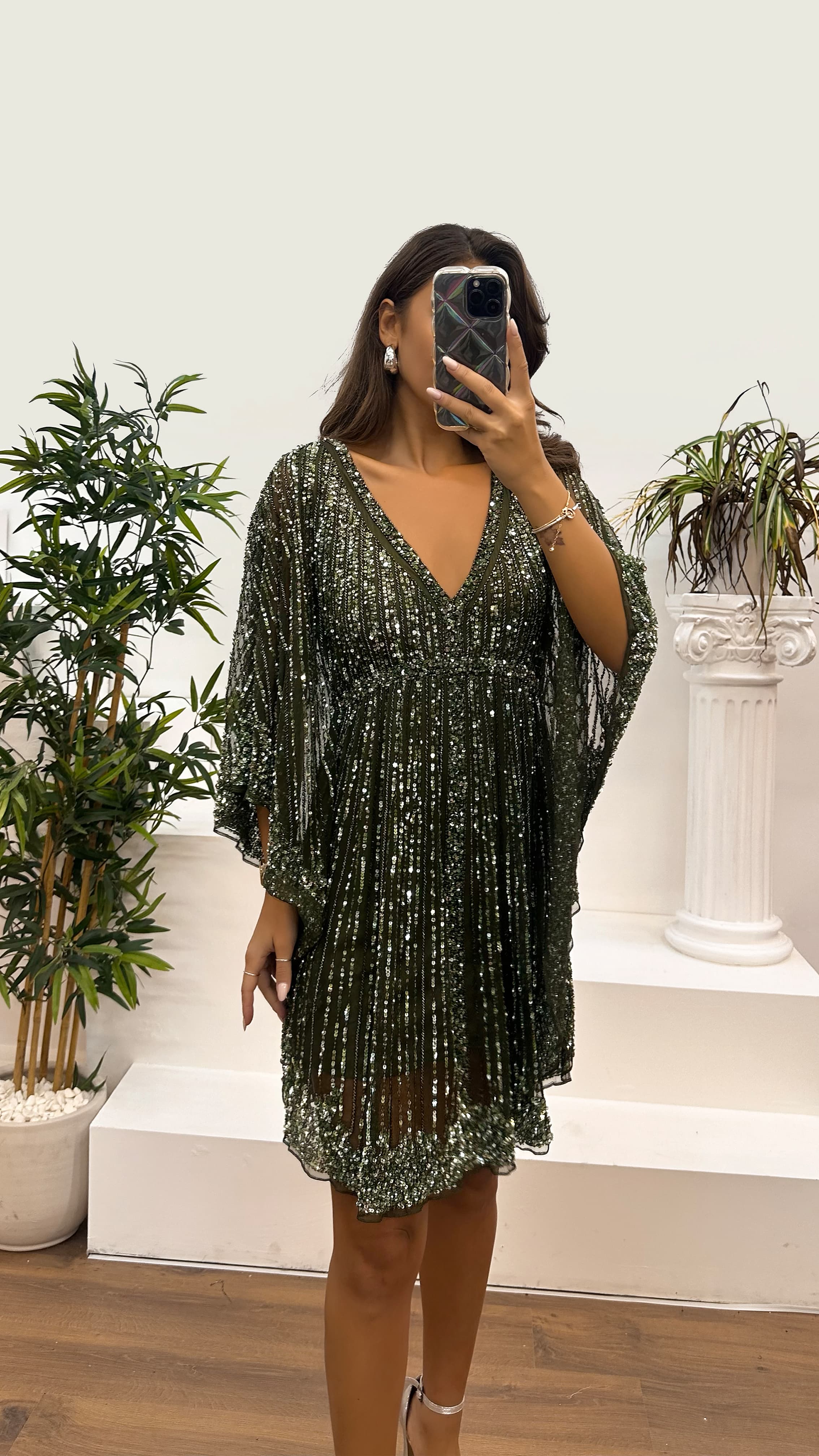Haki V Yaka Yarasa Kol Kısa El İşlemesi Tasarım Abiye Elbise