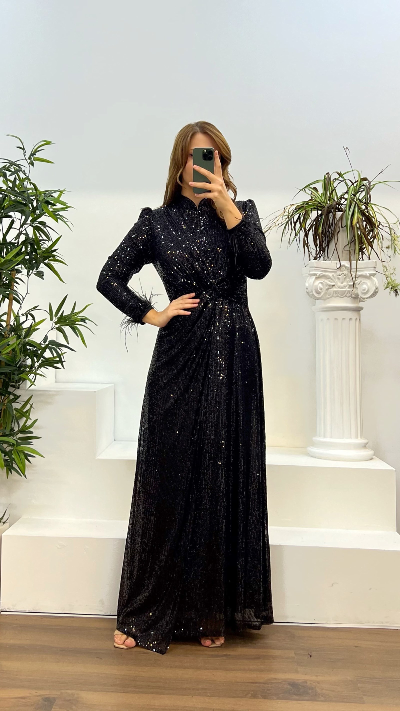 • Siyah Hakim Yaka Pul Payet Büyük Beden Abiye Elbise