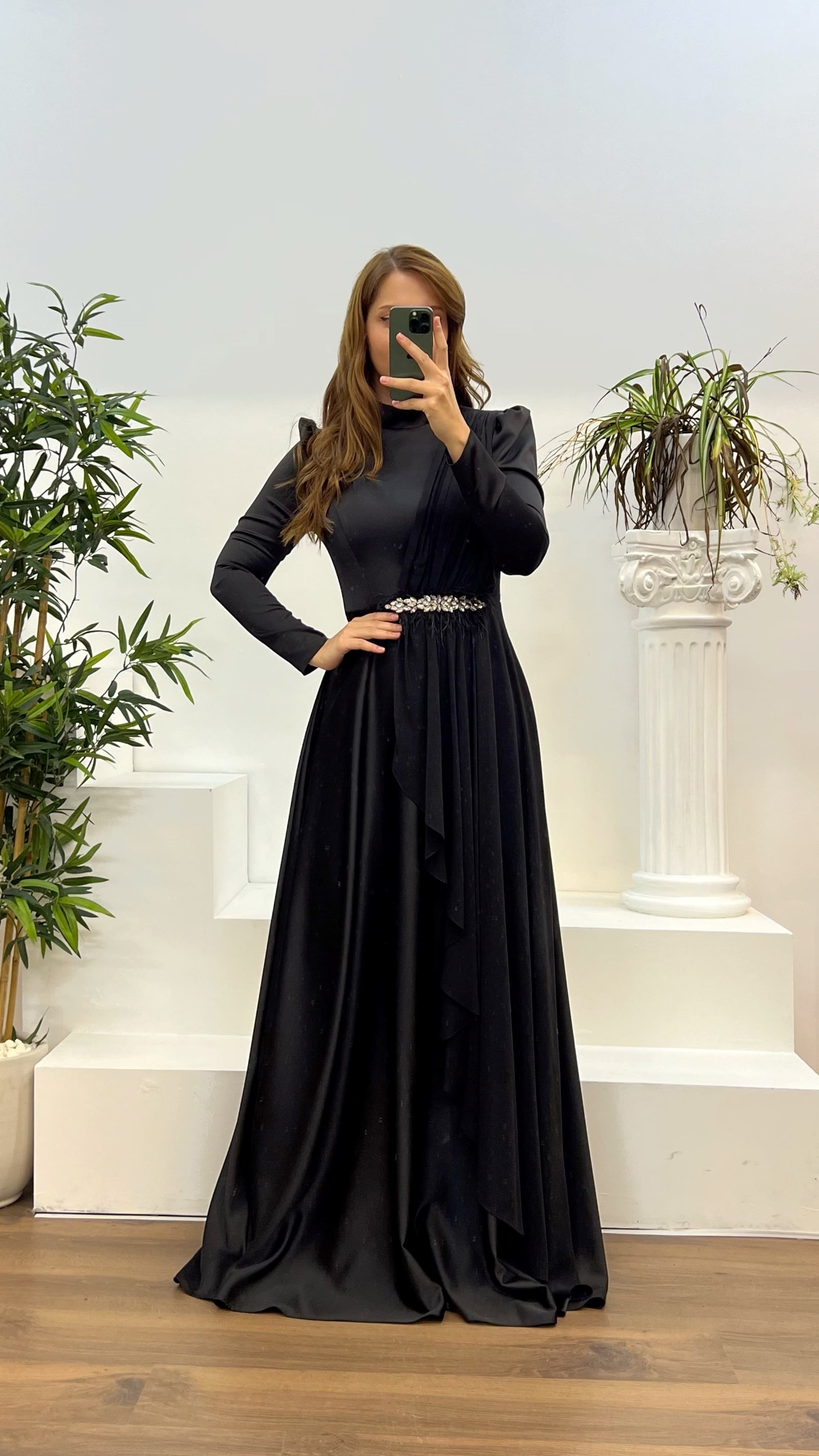• Siyah Bel Detay Büyük Beden Tesettür Abiye Elbise