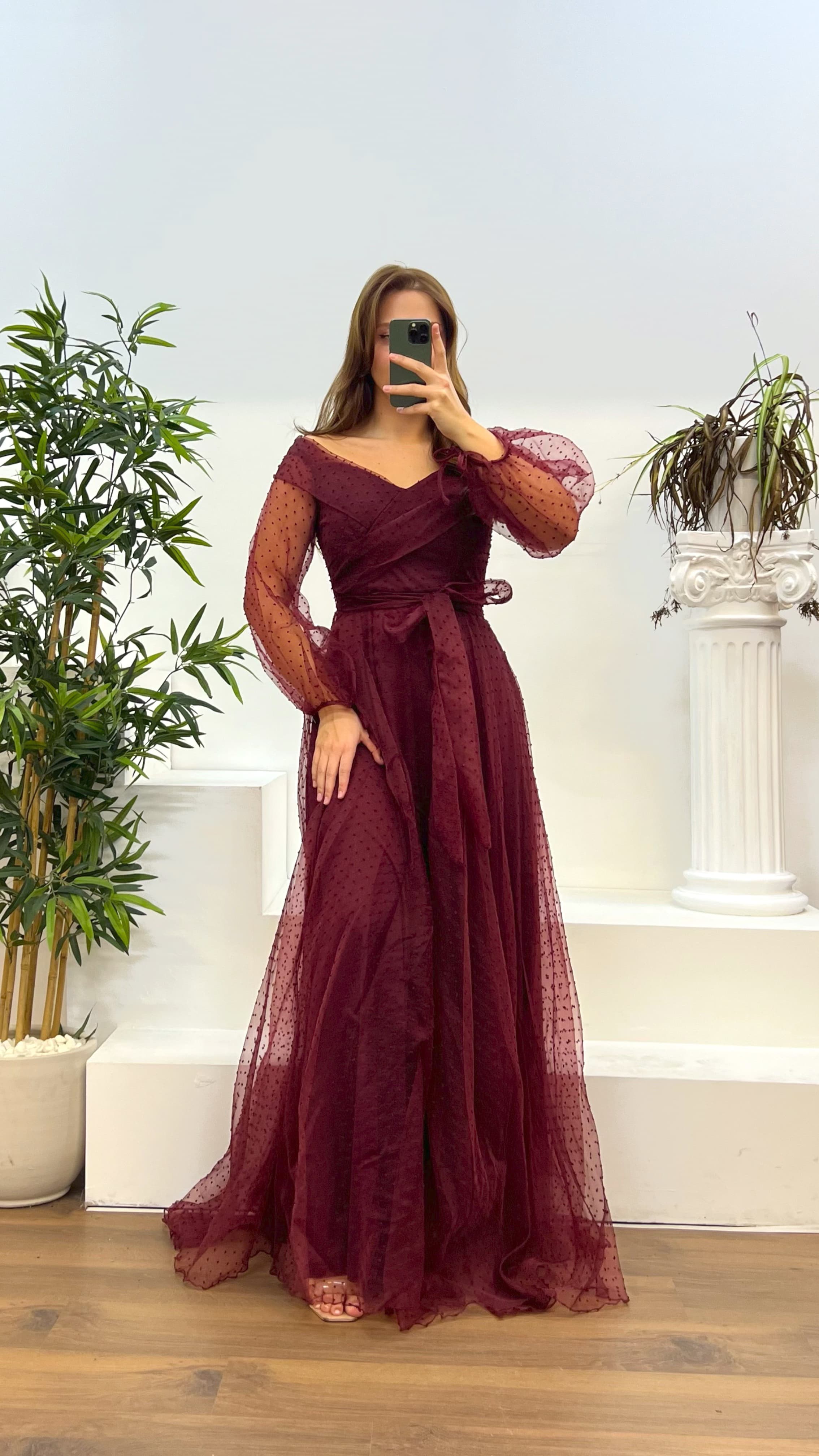 • Bordo Kuşaklı Tül Büyük Beden Abiye Elbise