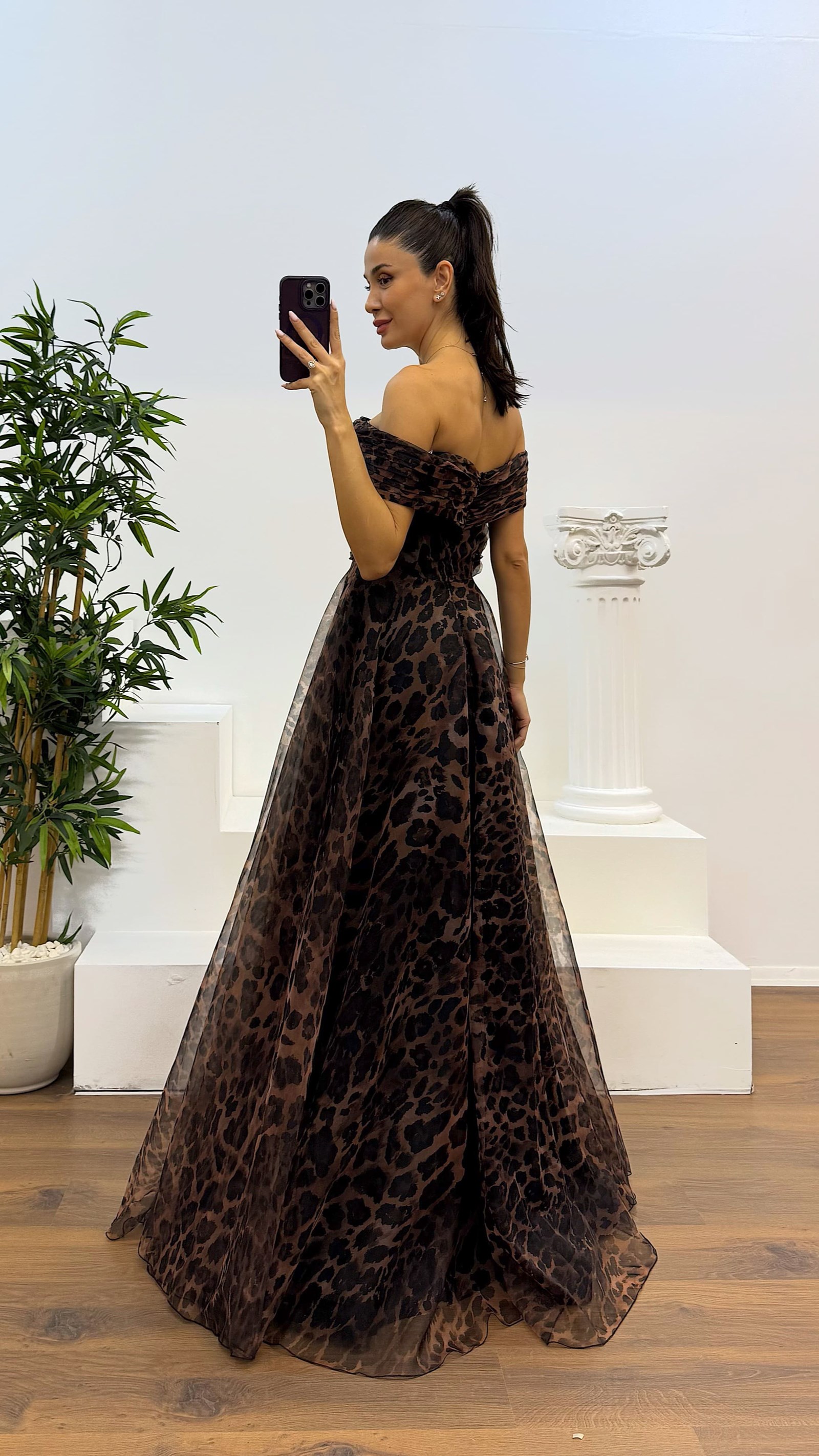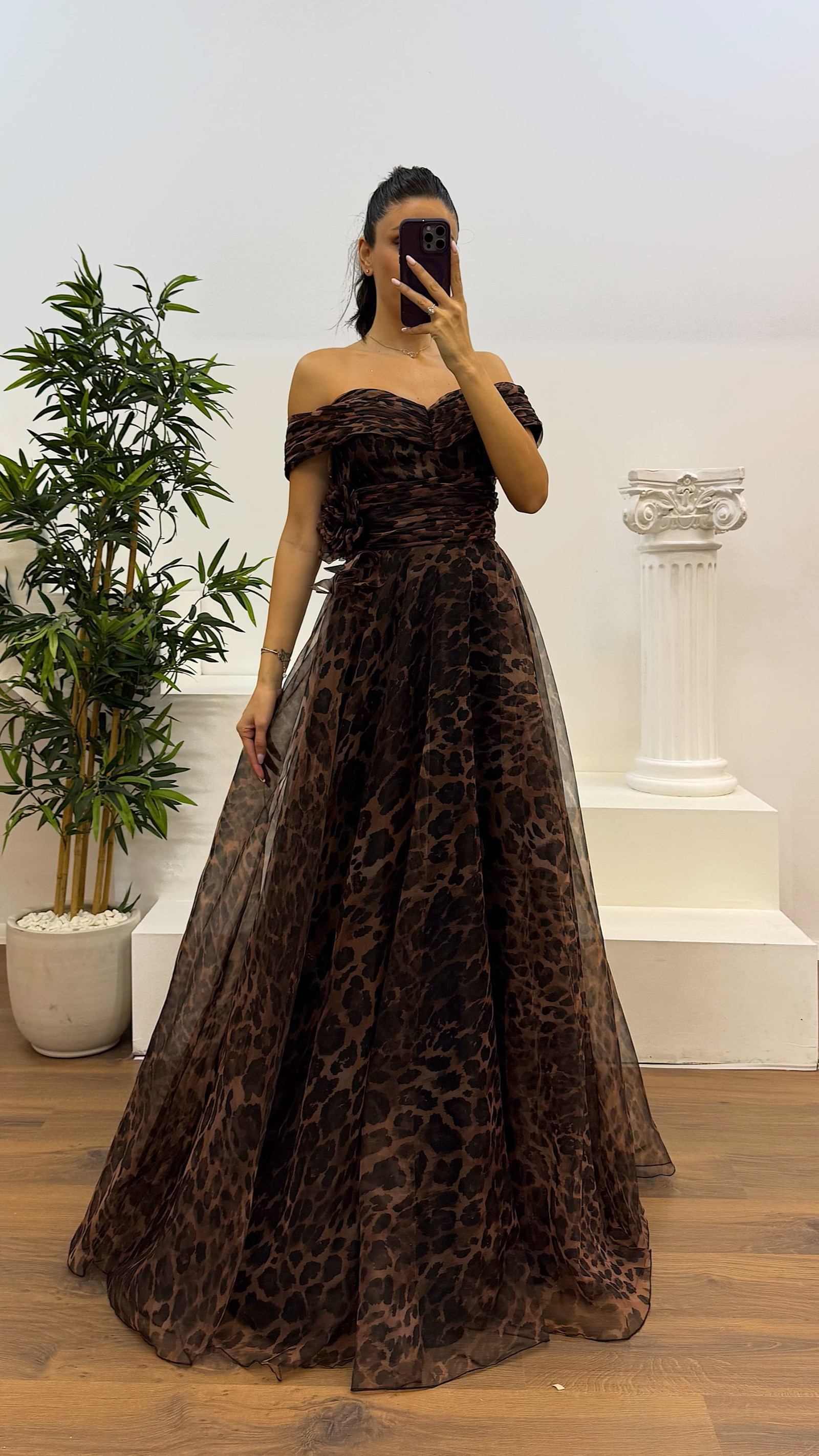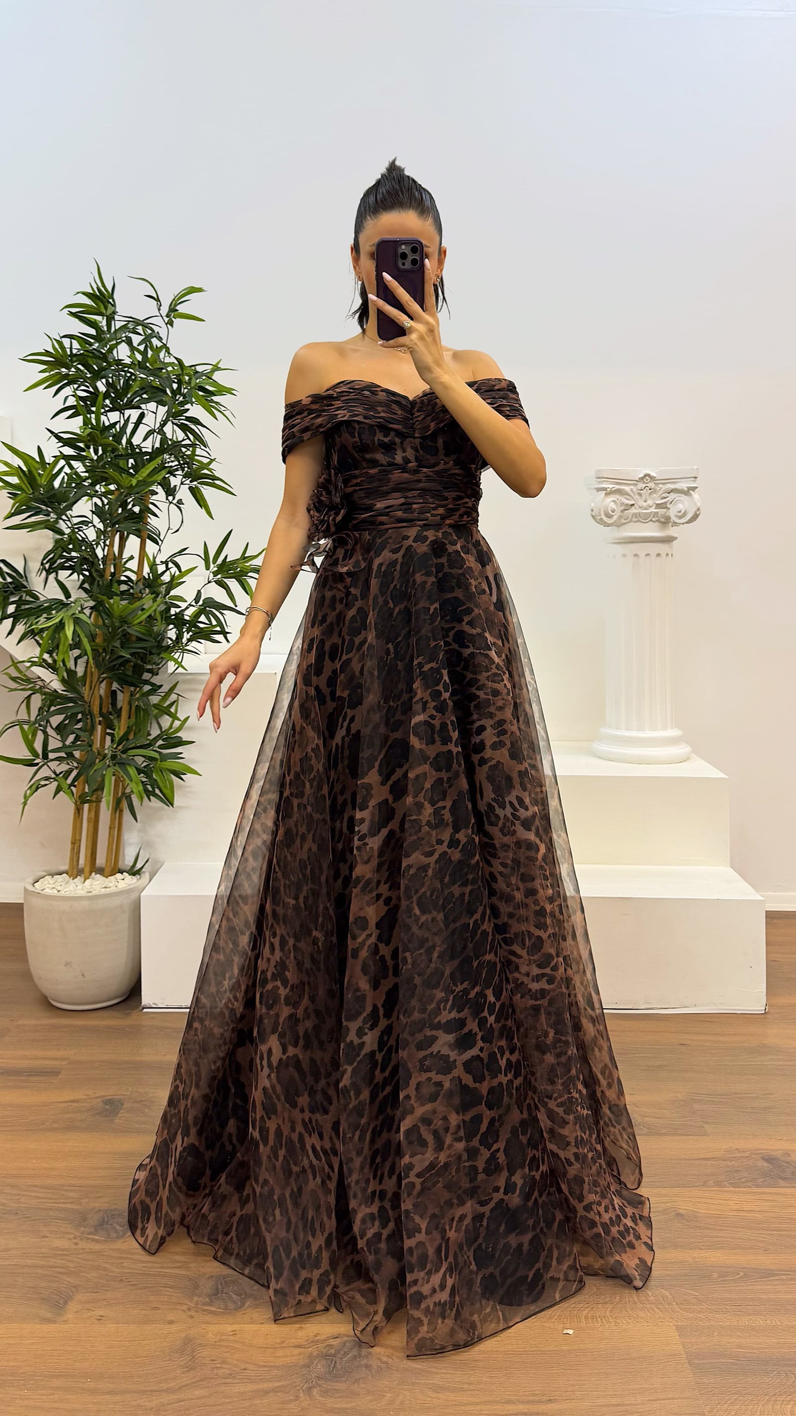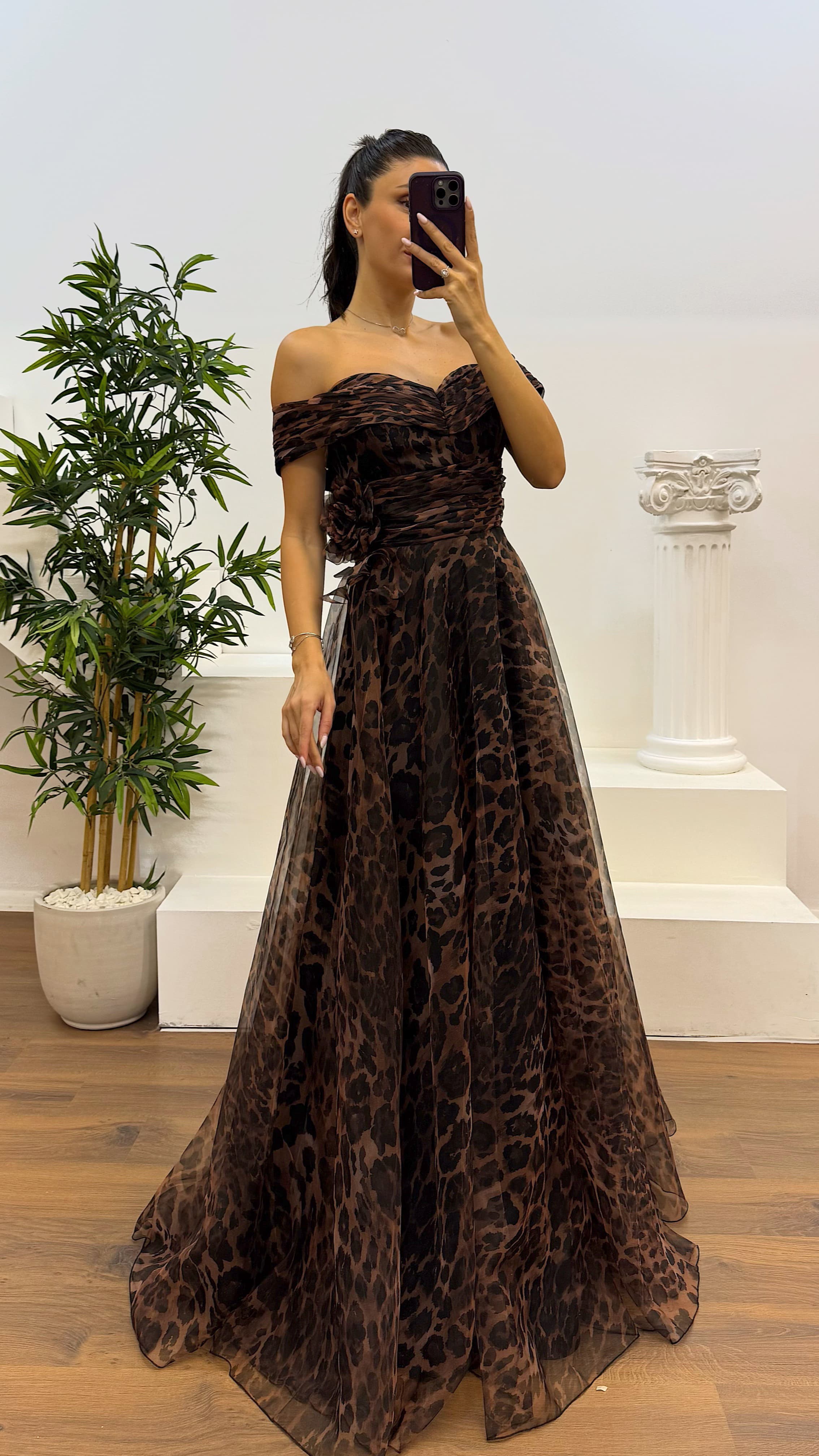 The product is suitable for sizes 36-42, features padded bust, lined, with a back zipper closure, designed as an off-shoulder evening dress. Product length: 160 cm. Fabric type: Tulle 3% Lycra, 97% Polyester.