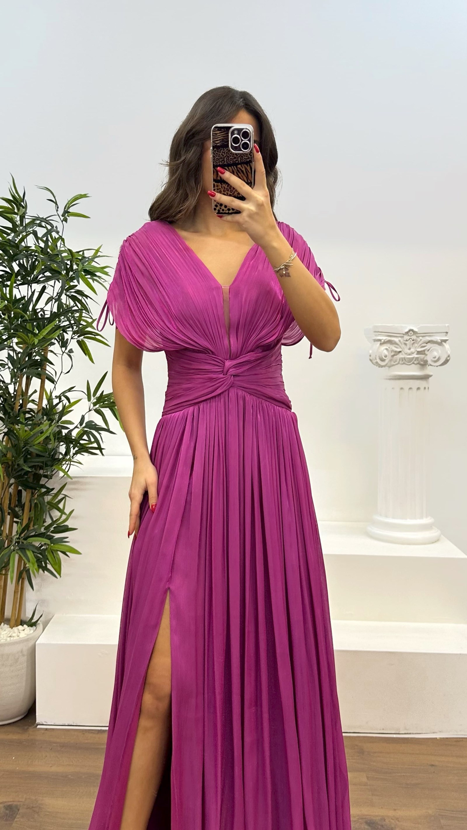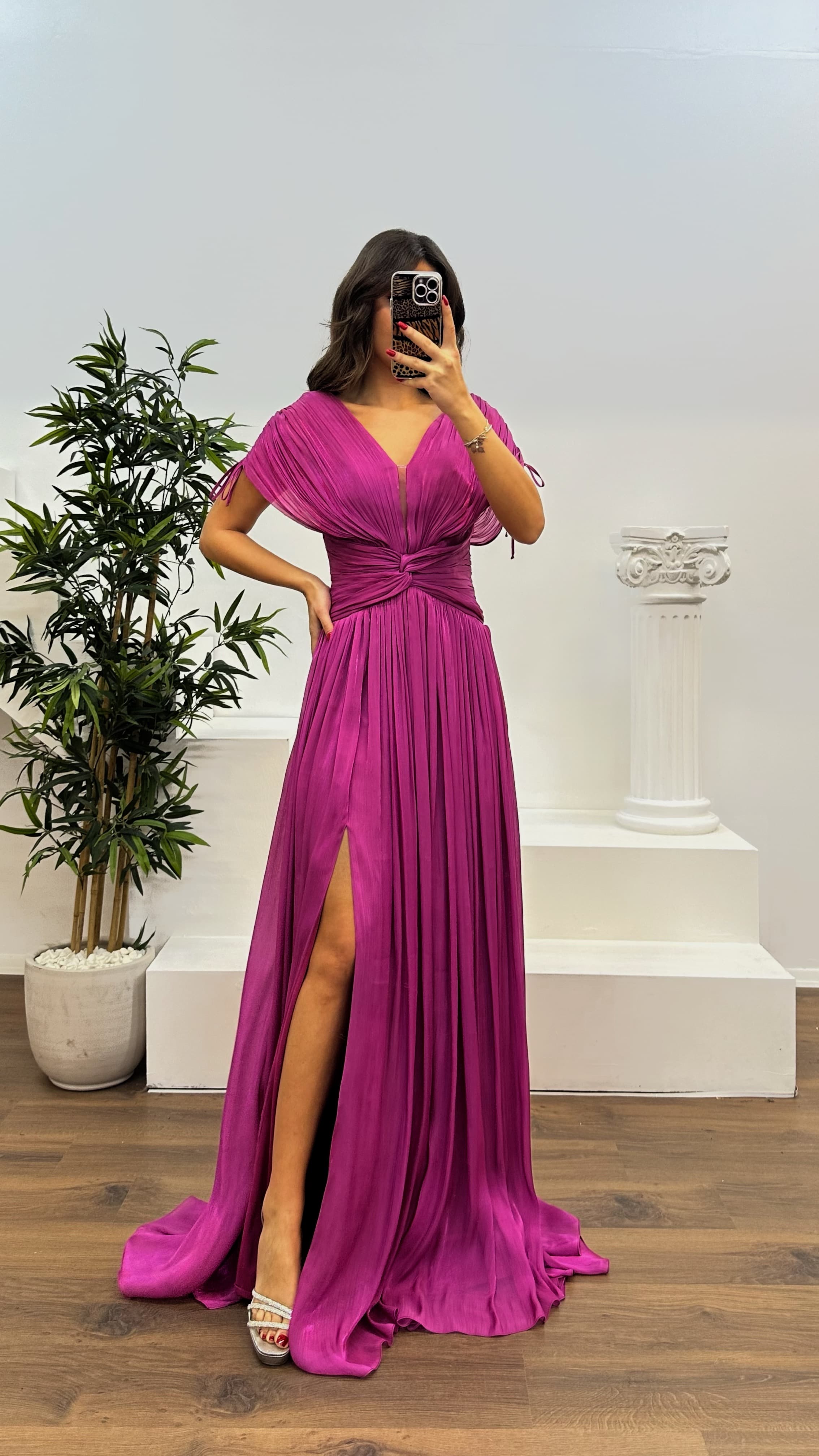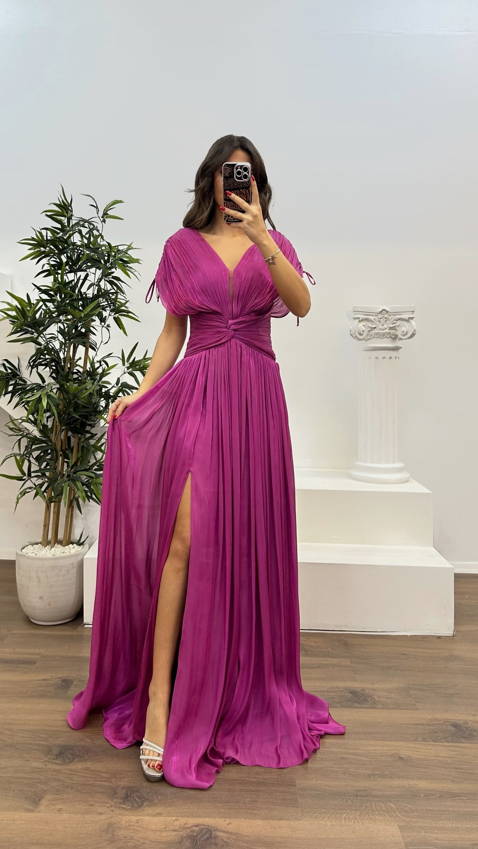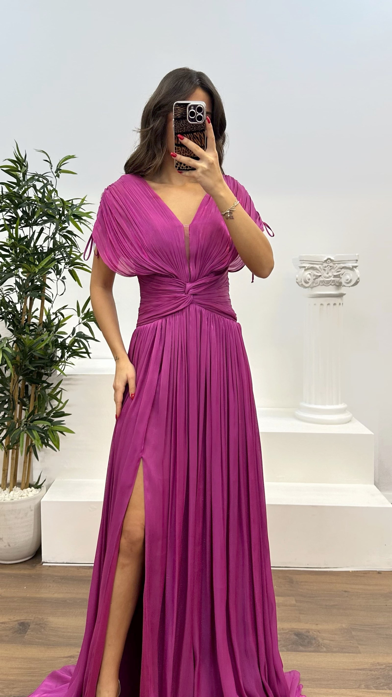V-neck Pleated Evening Dress The product is compatible with sizes 36-42, featuring built-in breast pads, lined, with a back zipper, slit, and designed in a pleated style. The product length may vary between 175-170 cm. Fabric type: Chiffon 66% Viscose 34% Polyester.