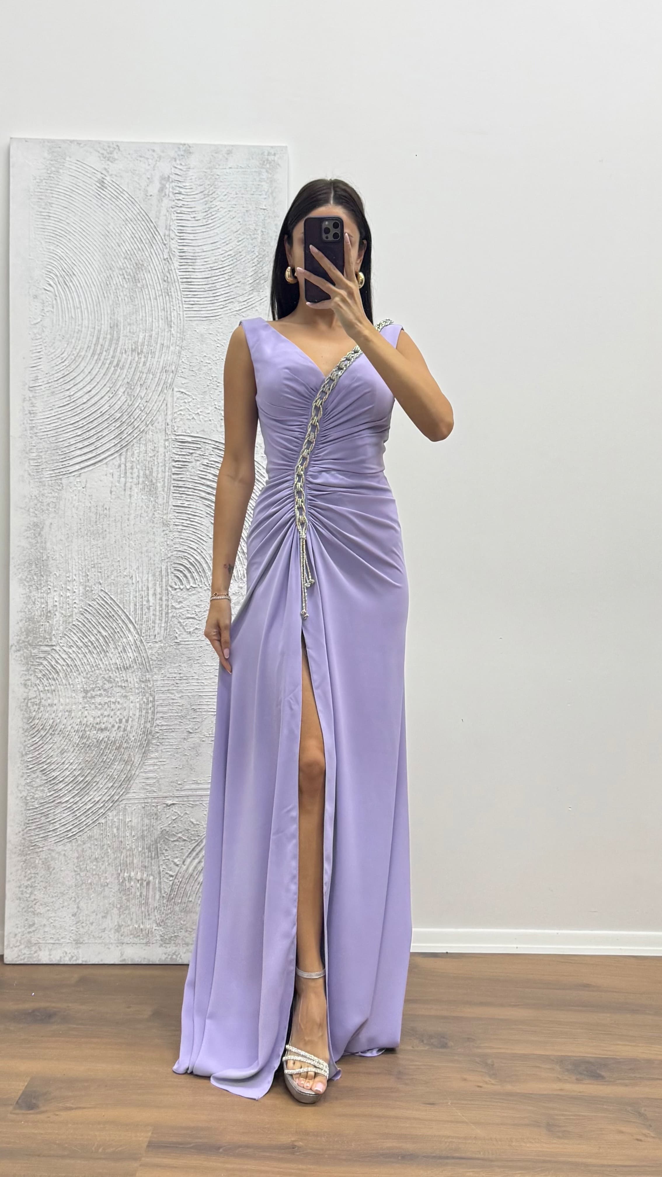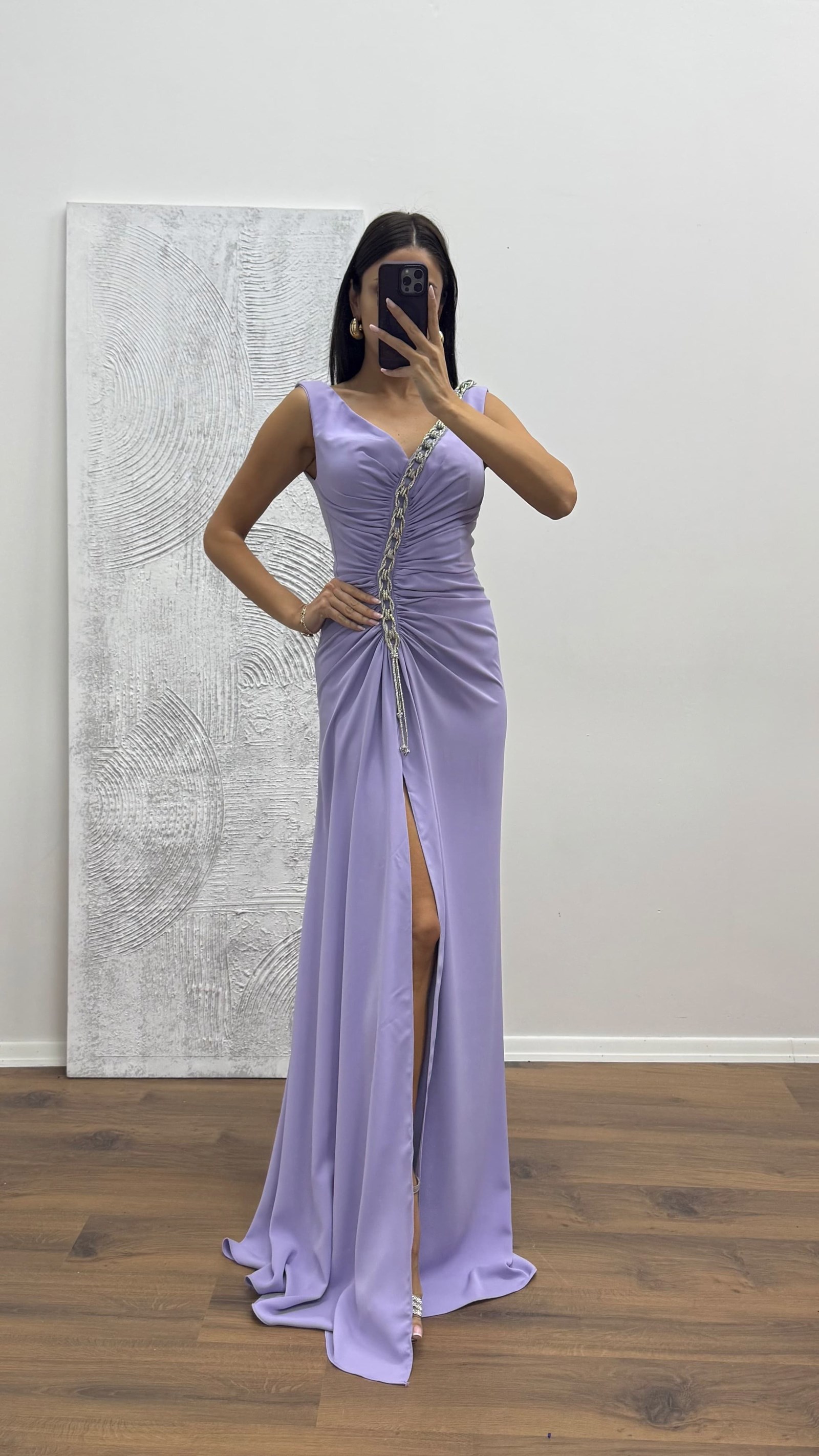 V-Neck Evening Dress with Chain Detail This elegant evening dress is designed to fit sizes 36 to 42. It features built-in bust pads, full lining, a back zipper closure, a front slit, and stylish chain details. Dress length: May vary between 175 and 170 cm. Fabric type: Atlas, 100% polyester.
