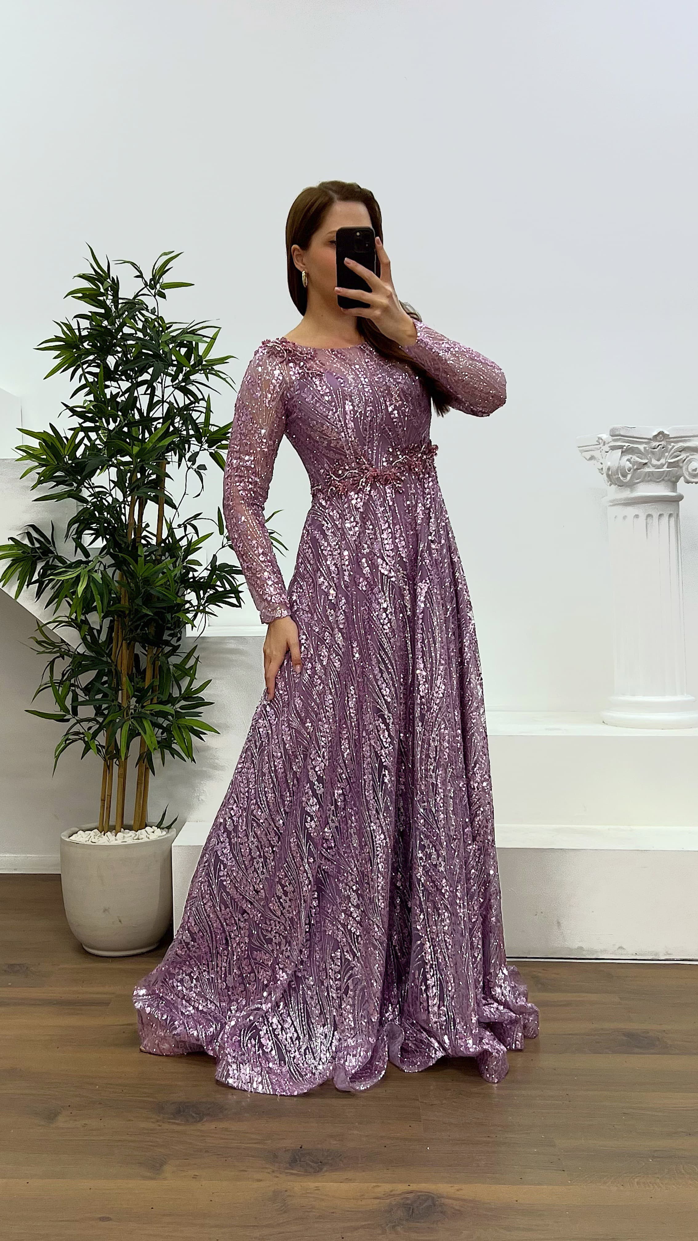 Waist Detail Evening Dress The product is designed to fit sizes 44–48. It features padded cups, lining, a back zipper closure, and elegant waist detailing. Product length: May vary between 165–170 cm. Sleeve length: 65 cm. Fabric type: Sequin (100% polyester)