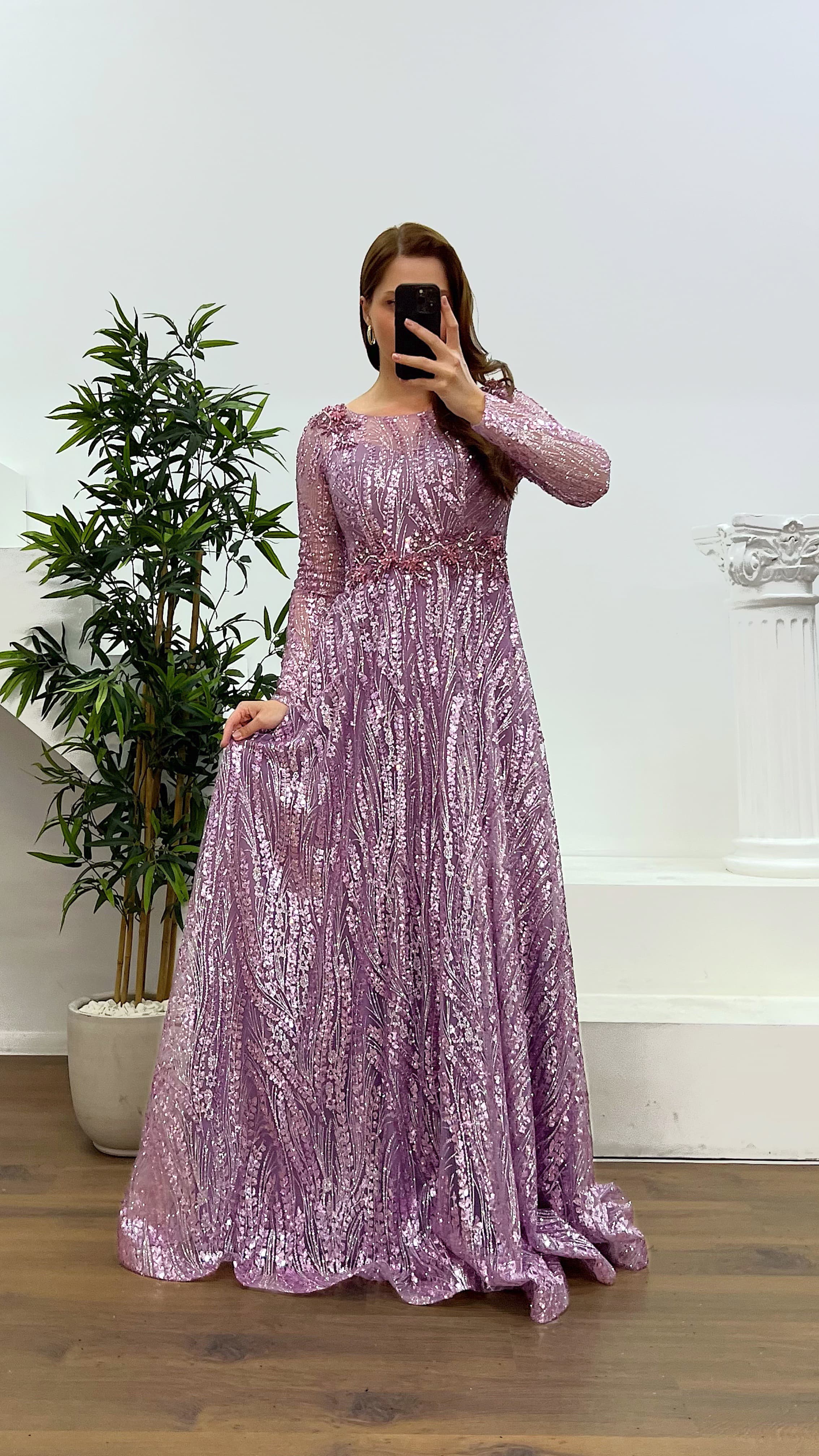 • Lila Bel Detay Büyük Beden Abiye Elbise