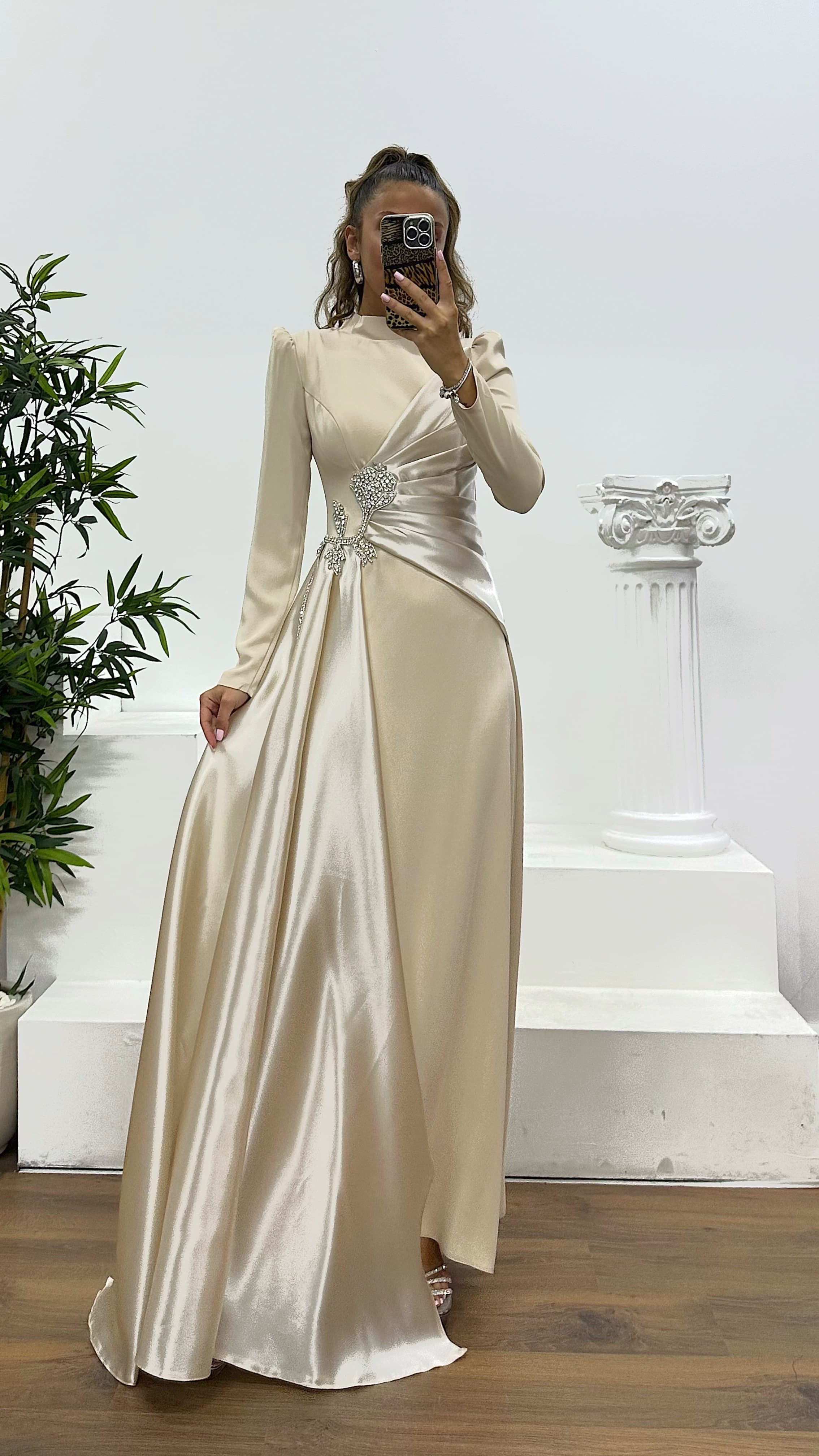 Waist-Detail Modest Evening Dress The product is compatible with sizes 36 to 44, includes chest padding, is fully lined, has a back zipper closure, front train, and is designed as a waist-detail evening dress. Product length: May vary between 170-175 cm. Fabric type: Satin polyester, viscose - atlas 100% polyester.