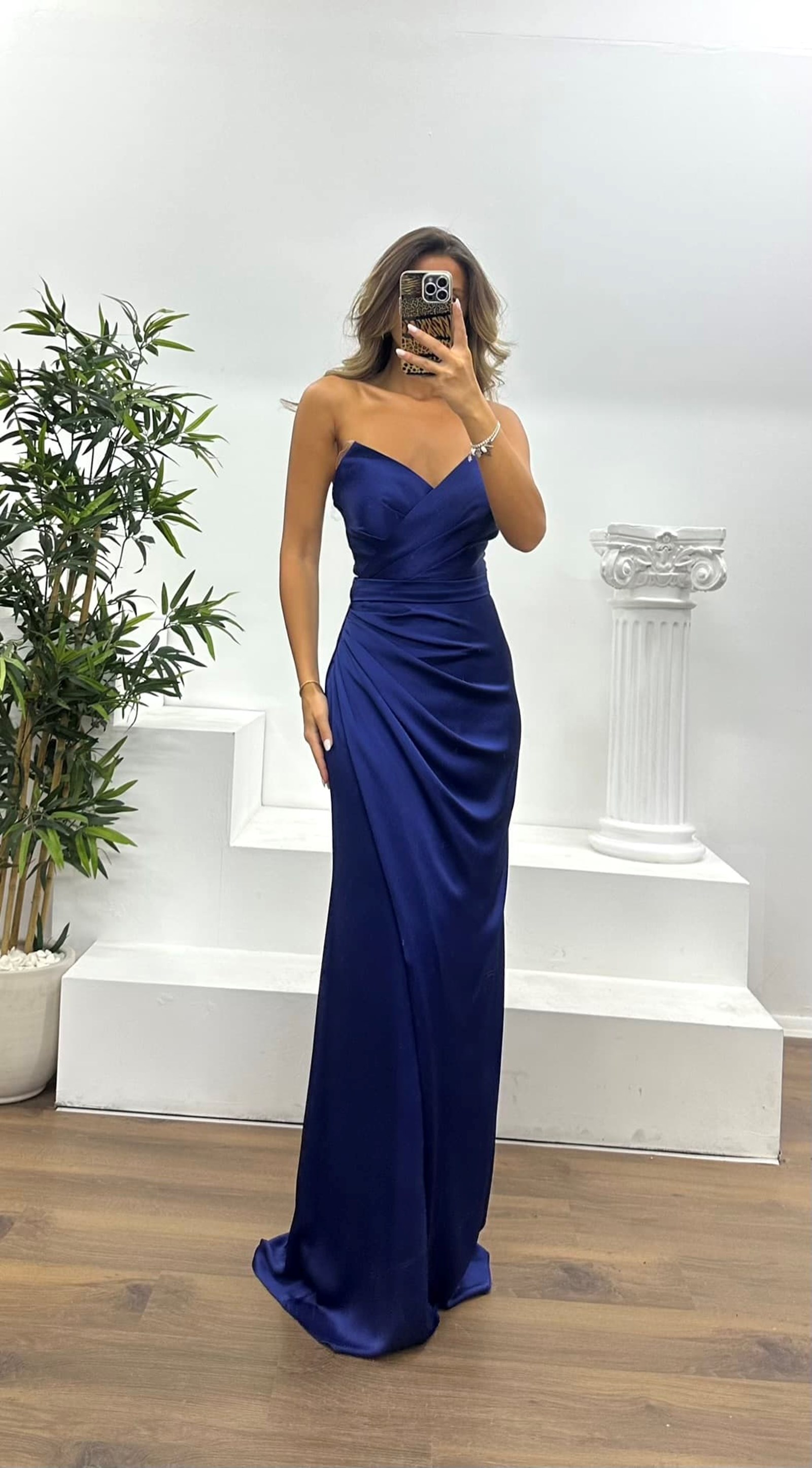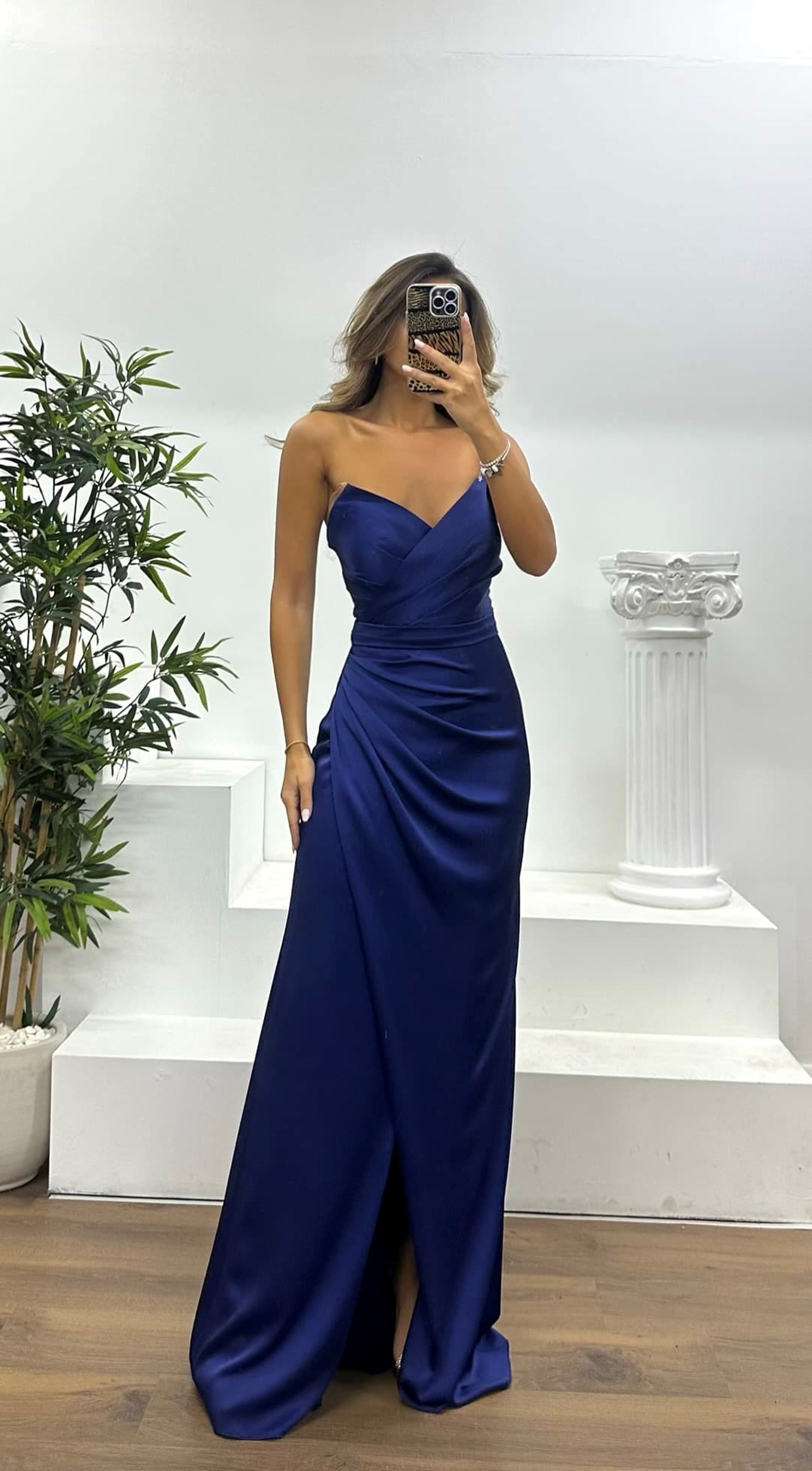 Strapless Draped Evening Dress The product is designed as a draped evening dress with a slit, inner lining, padded bust, and back zipper closure. It fits sizes 36 to 42. Product length: May vary between 170-175 cm. Fabric type: Satin polyester-viscose.