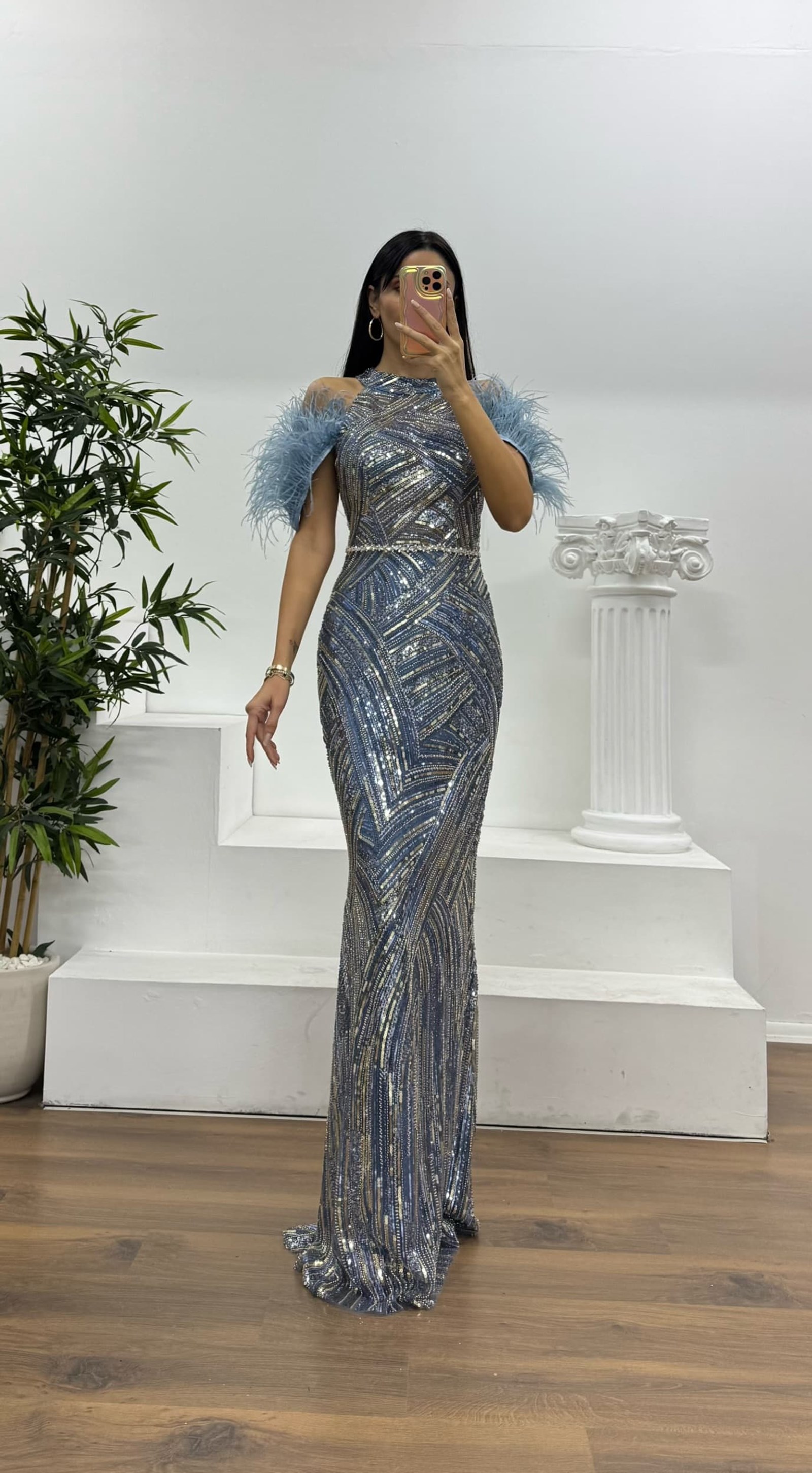 • İndigo Tüy Detay İşlemeli Abiye Elbise