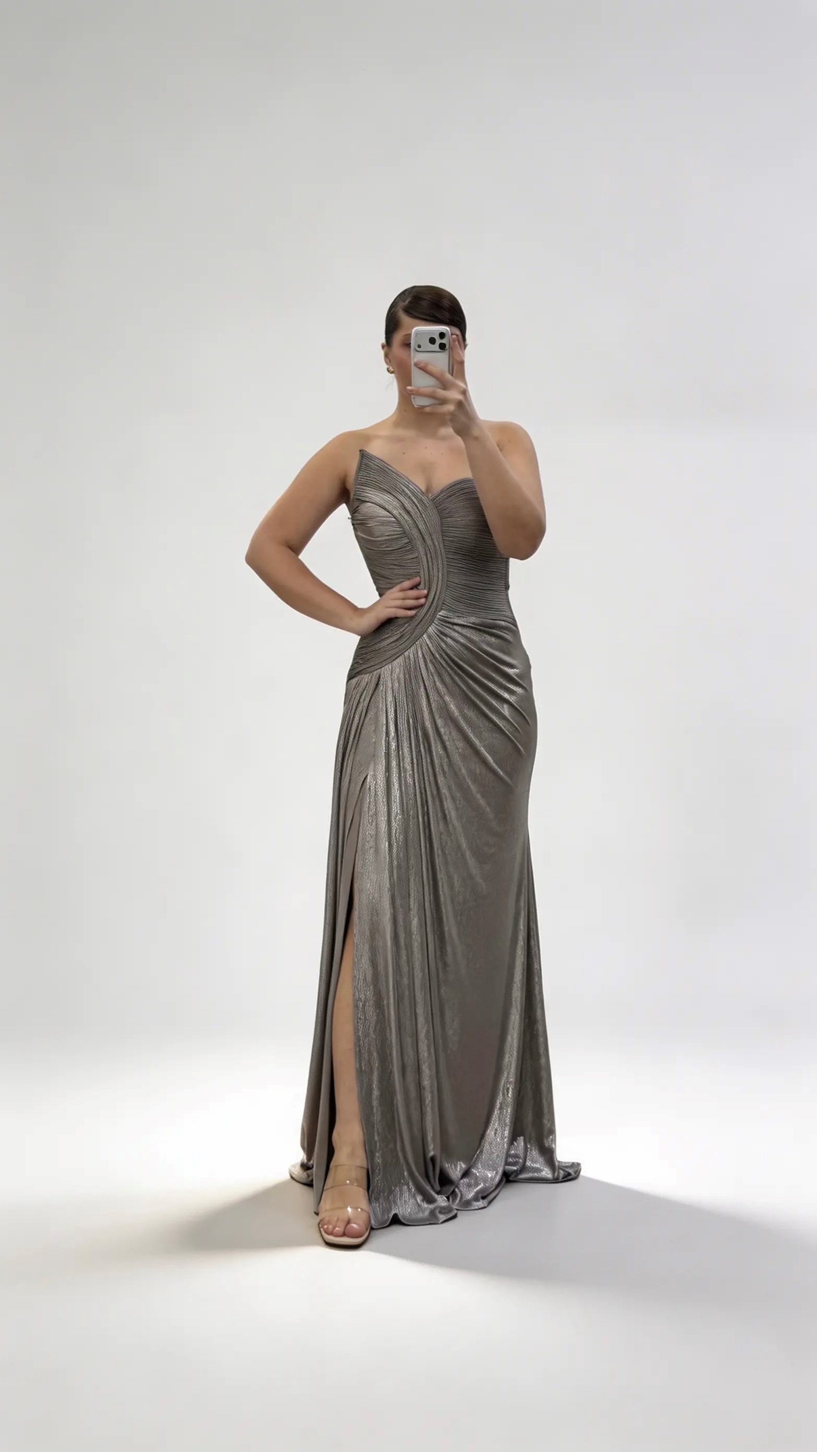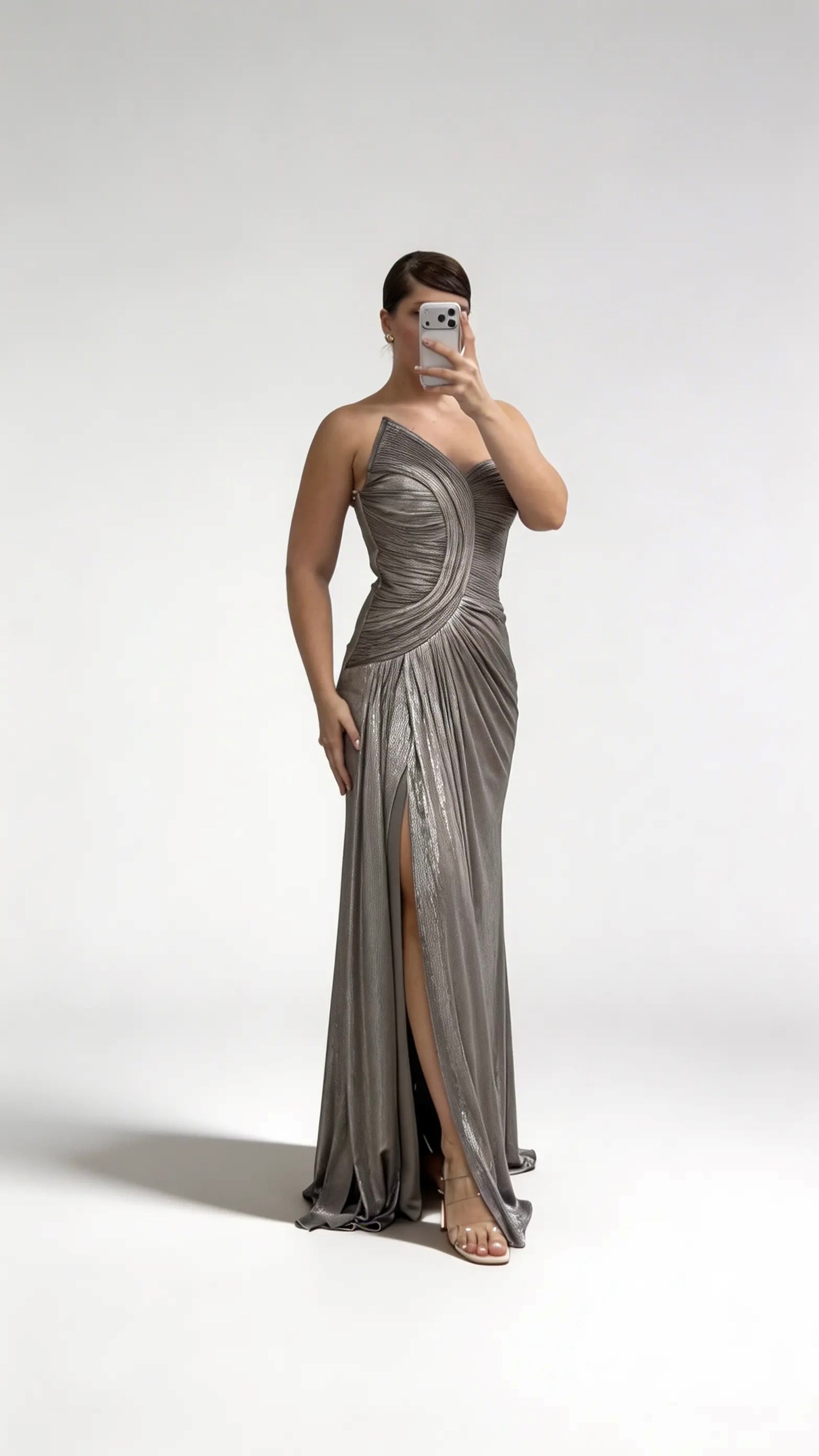 • Bakır Asimetrik Kavis Drapeli Straplez Büyük Beden Abiye Elbise