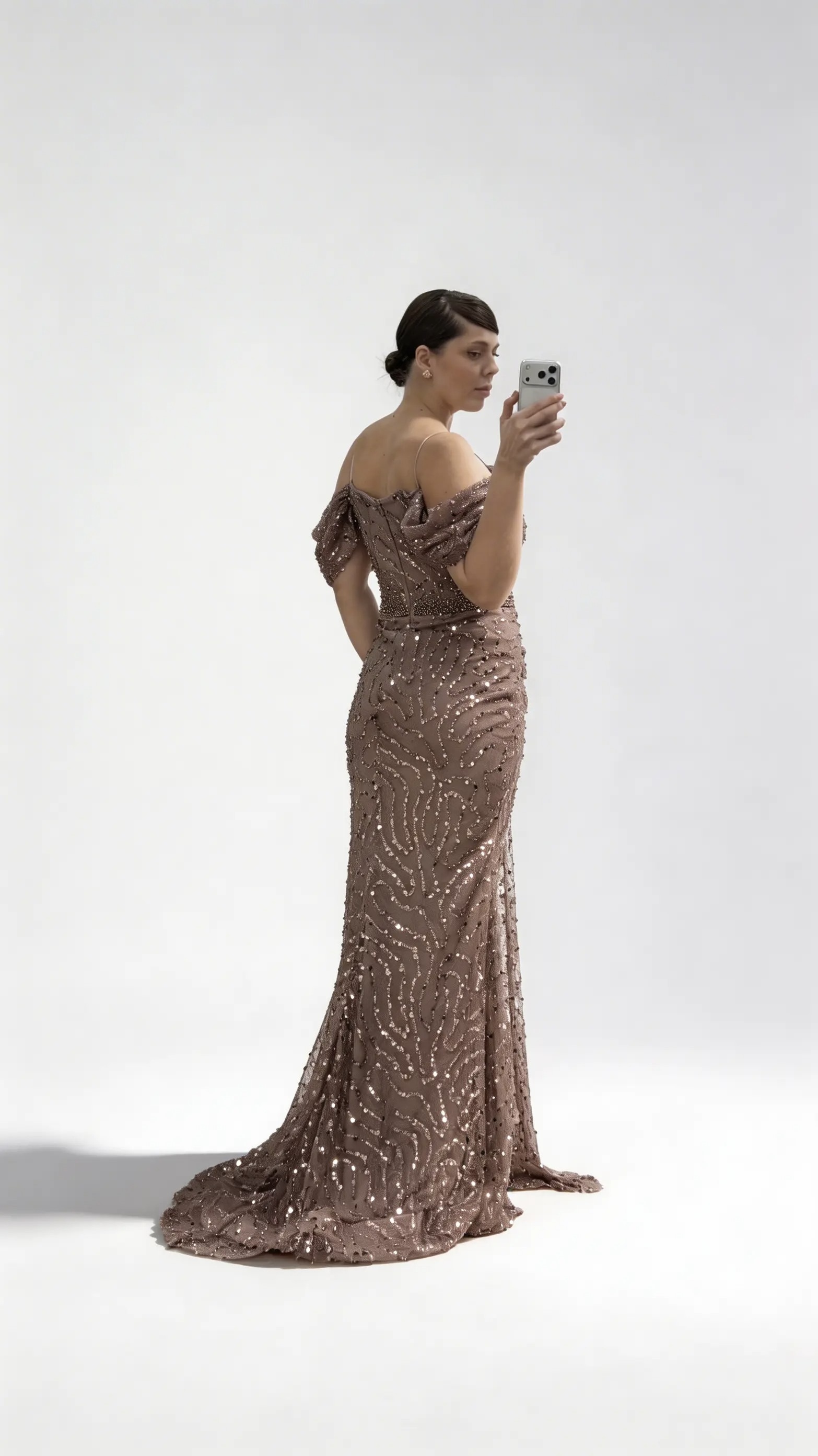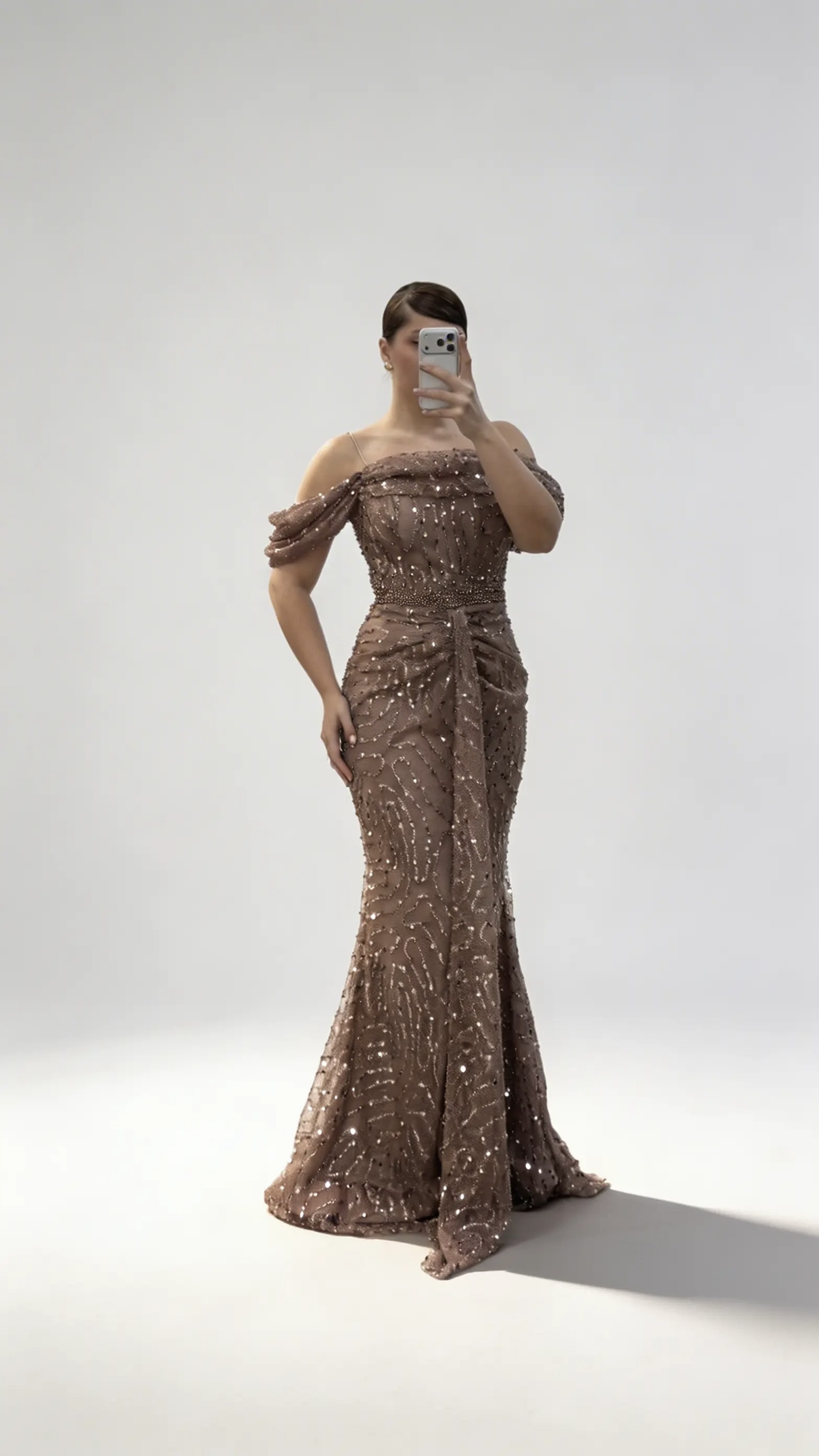 • Kahverengi Drapeli Göğüs Yandan Dökümlü Kol Pul Payet Büyük Beden Abiye Elbise
