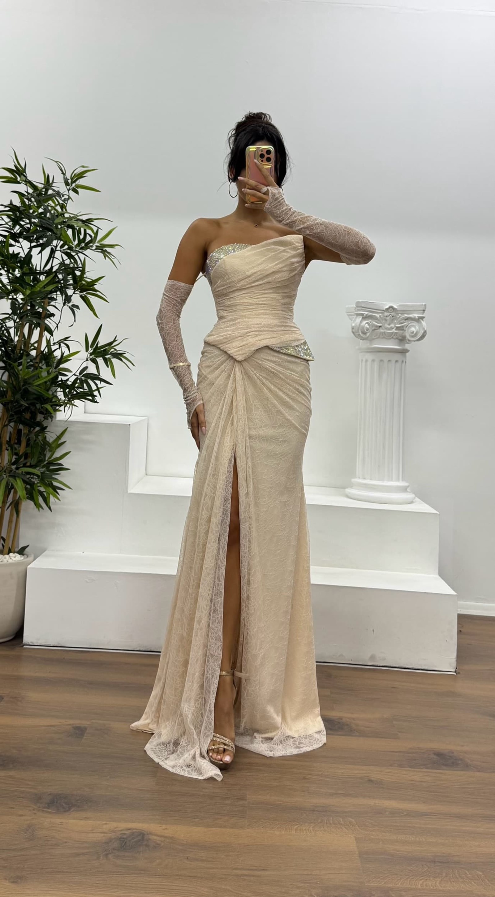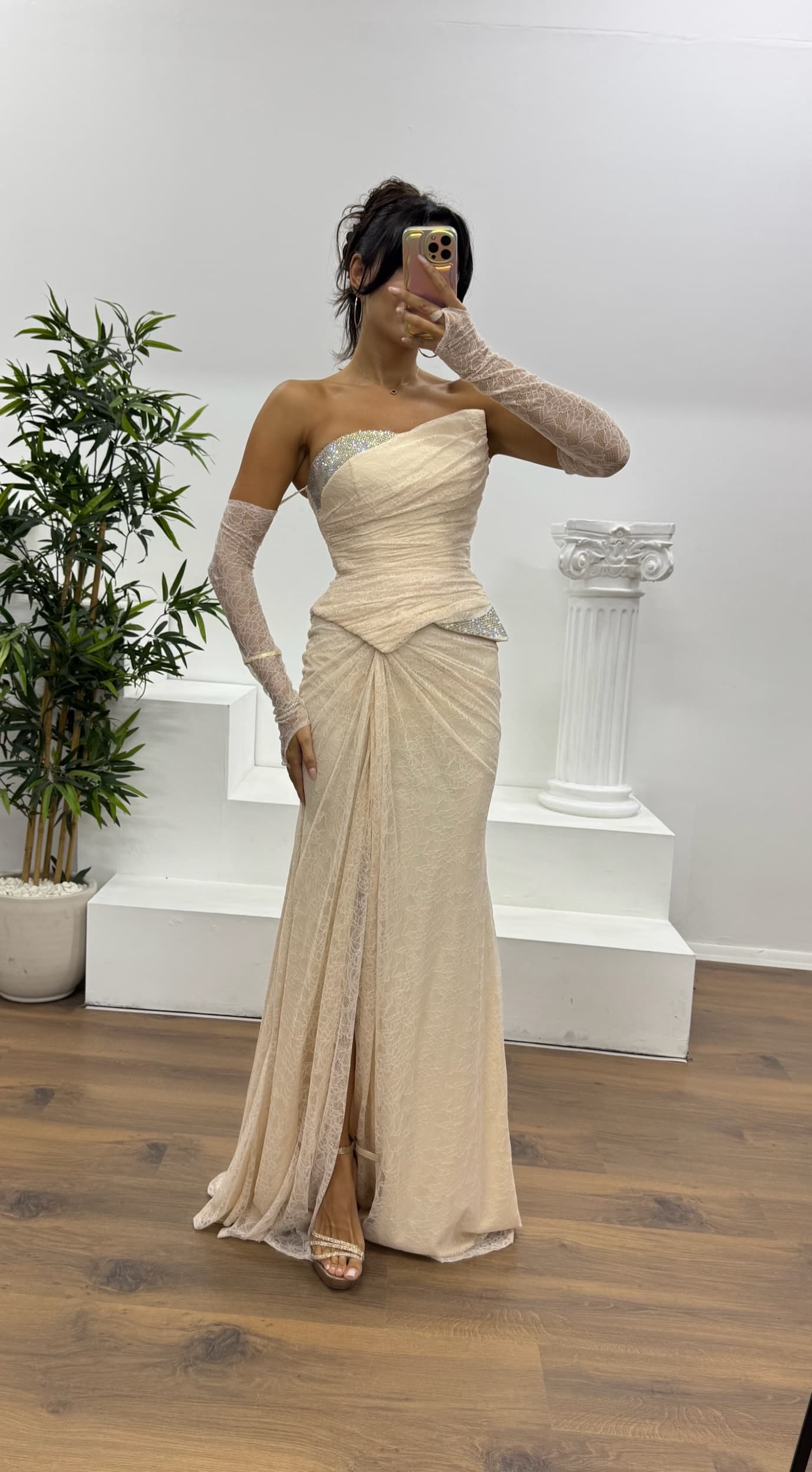 Vestido de noche sin tirantes con detalle de guantes El producto está diseñado como un vestido de noche sin tirantes con guantes, apto para tallas de la 36 a la 42. Incluye copas en el busto, forro interior, cierre con cremallera trasera y abertura. Longitud del producto: Puede variar entre 170 y 175 cm. Tipo de tela: Encaje