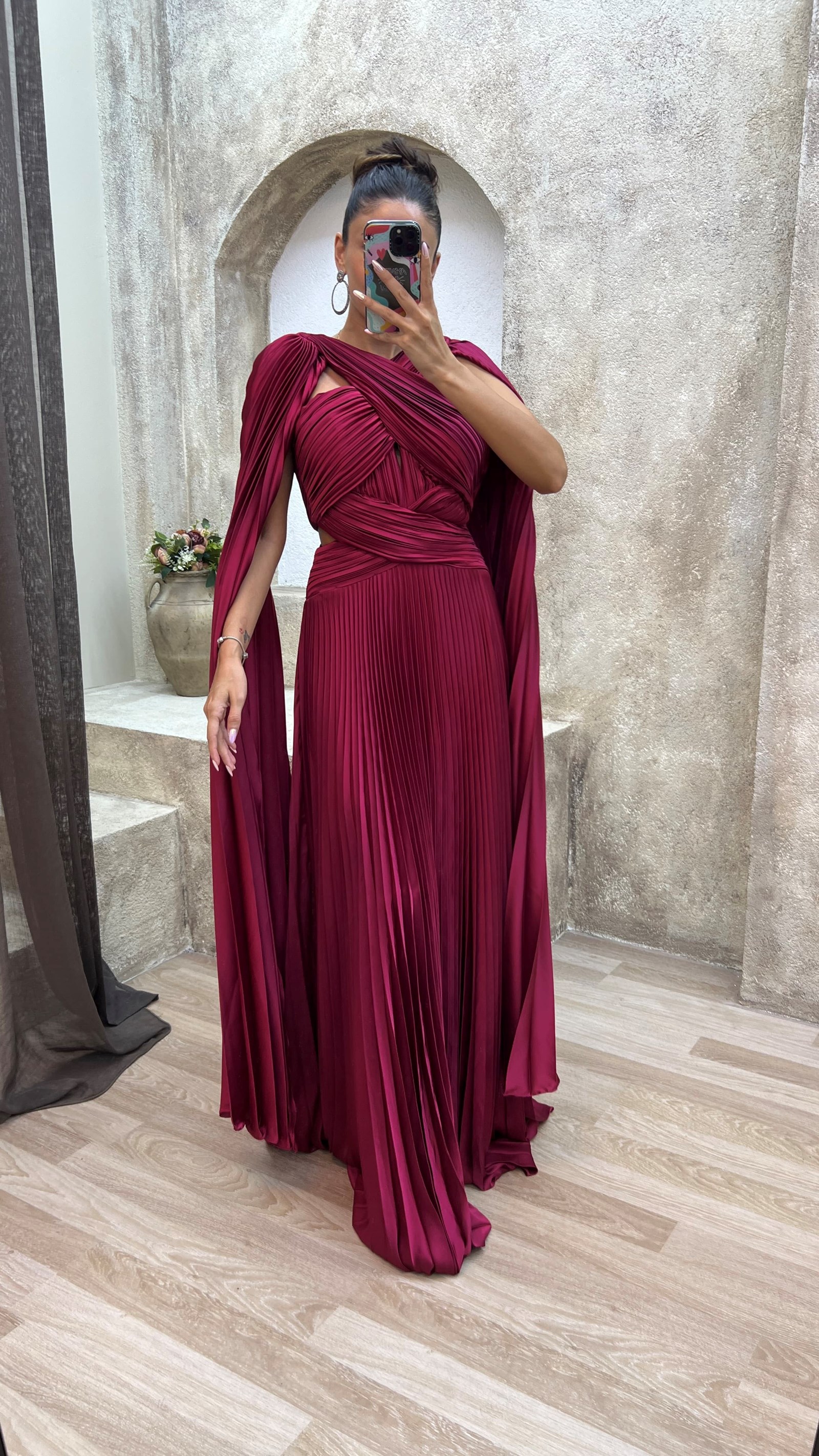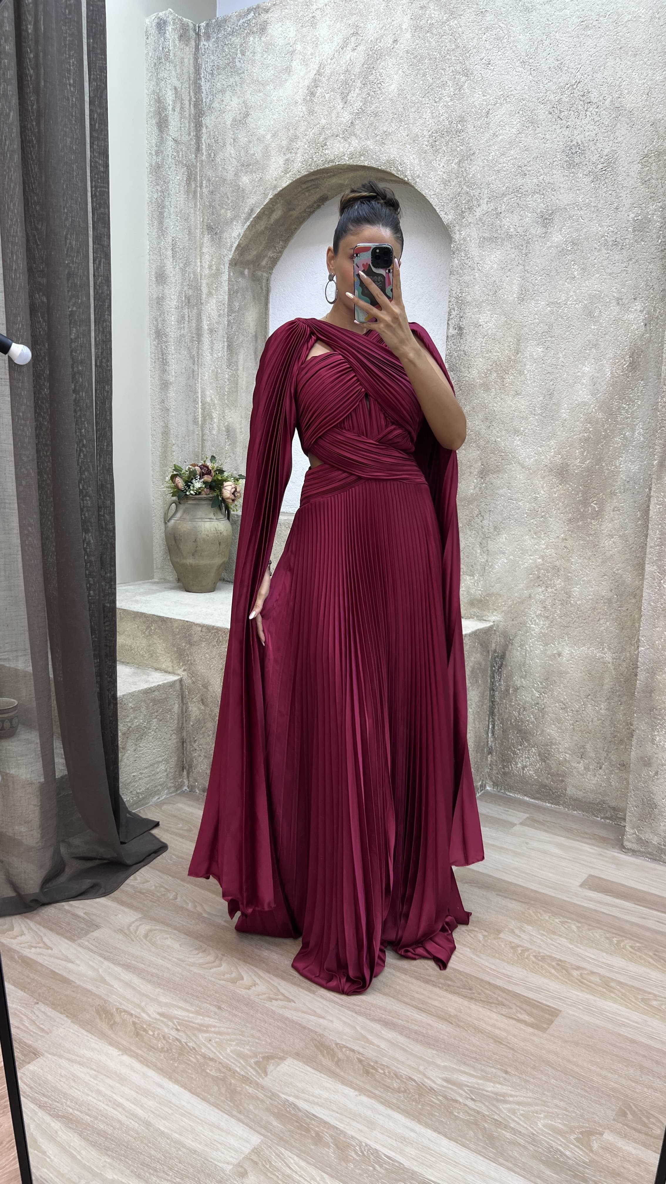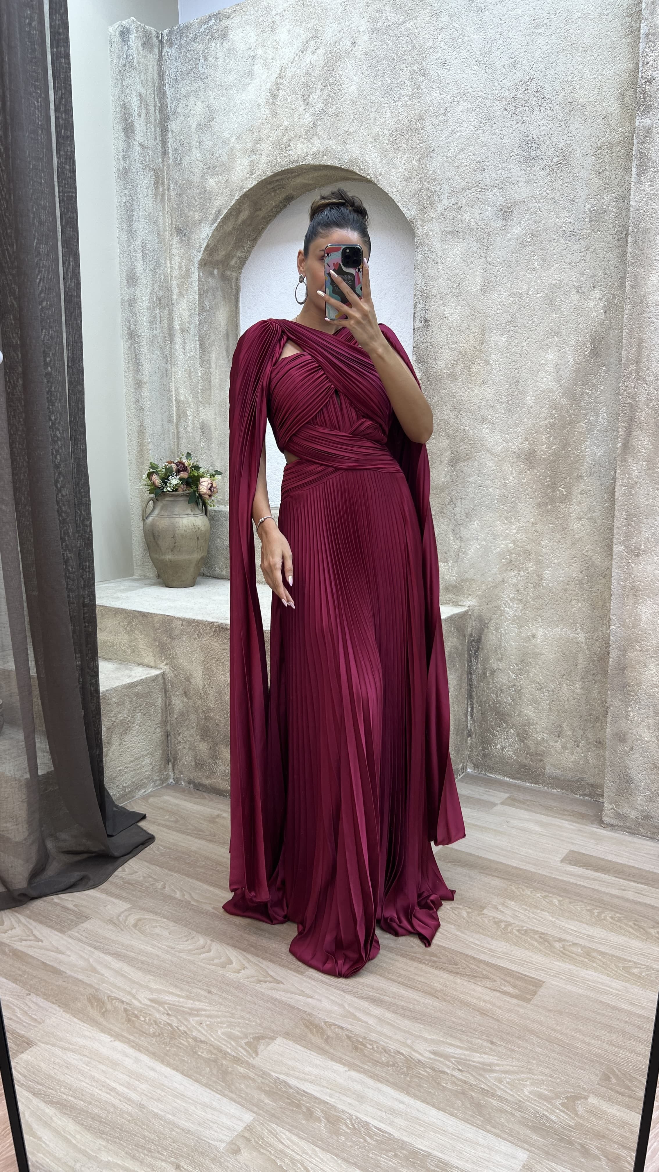 • Bordo Çapraz Detay Pliseli Saten Abiye Elbise