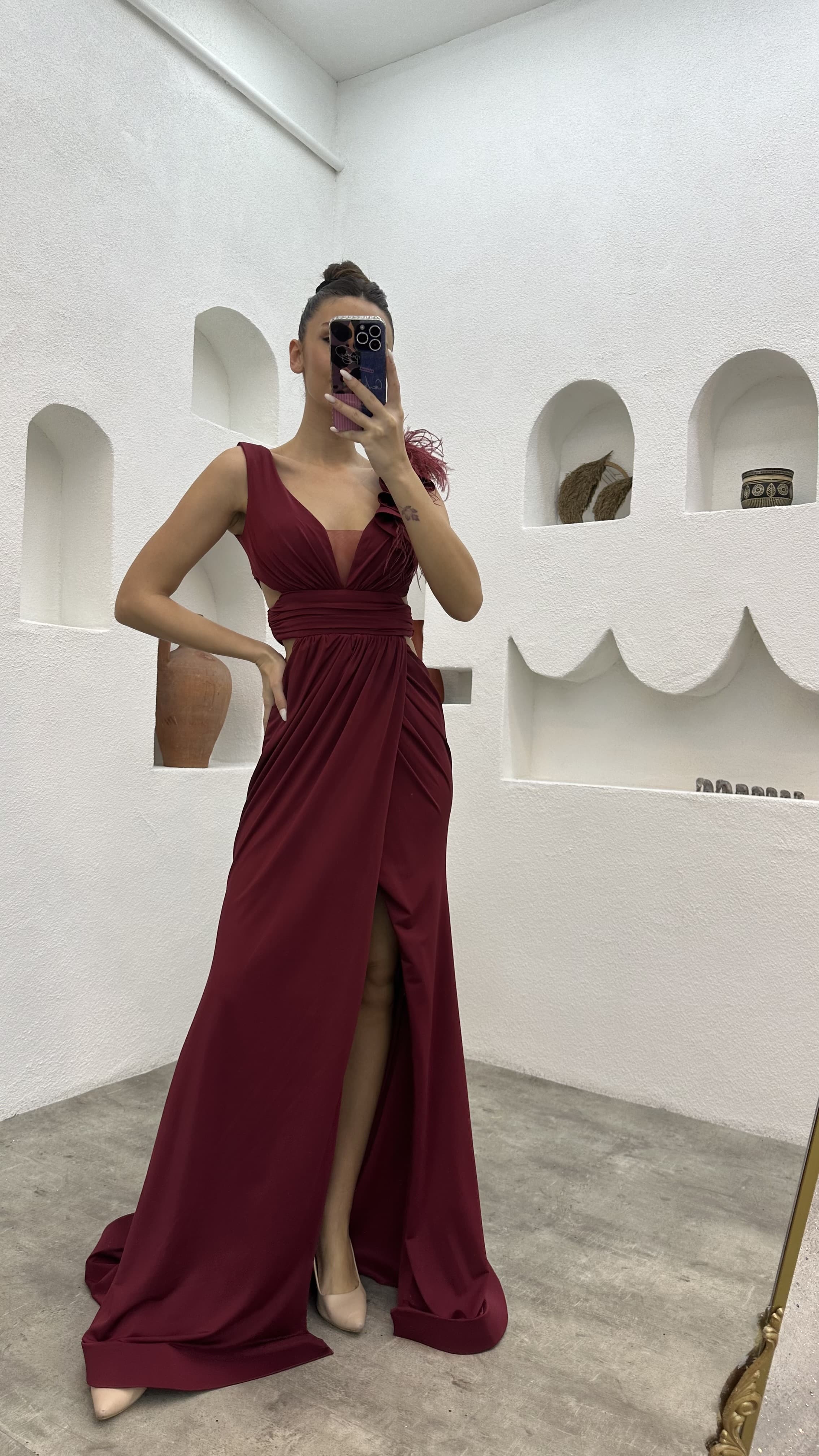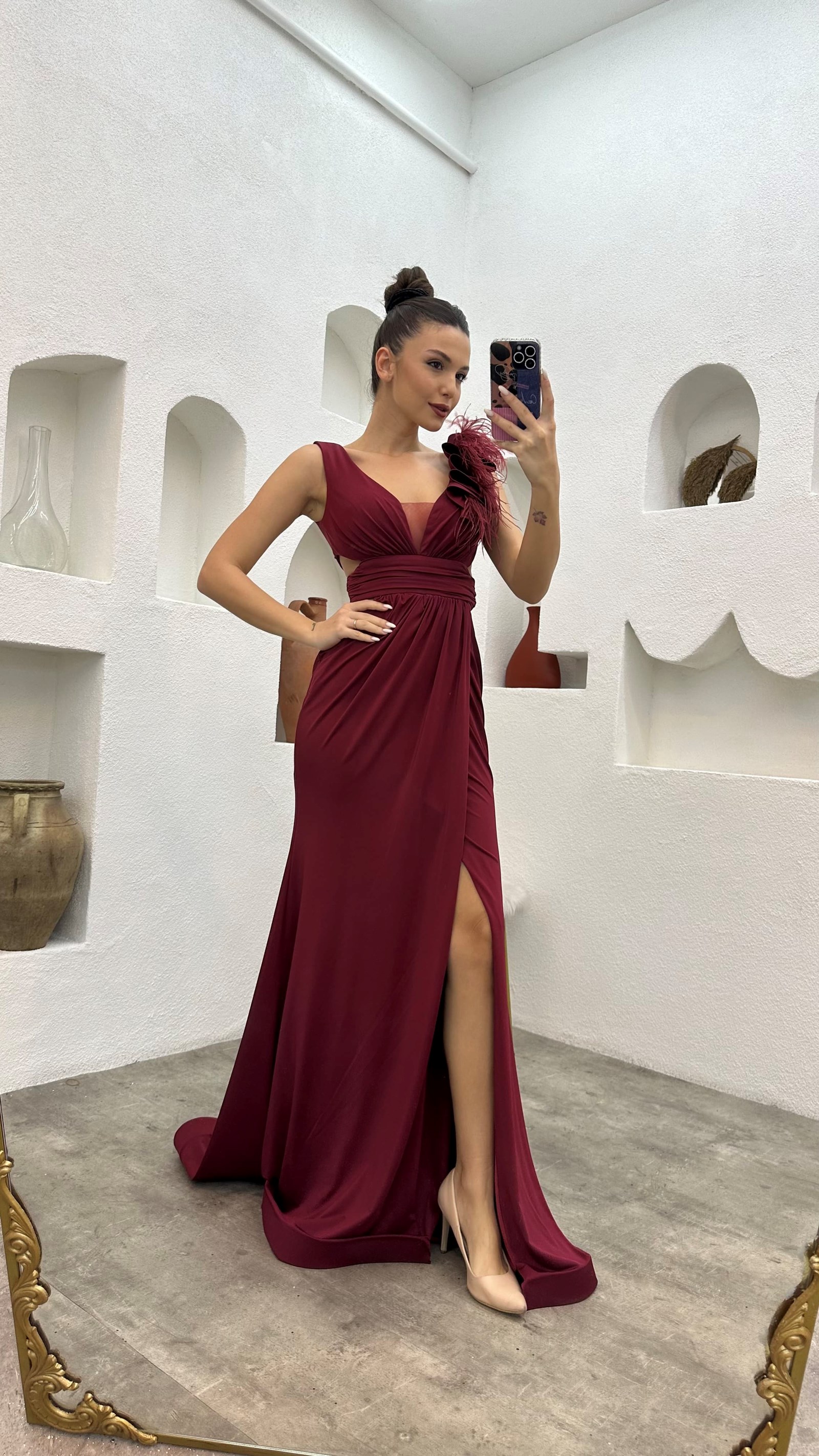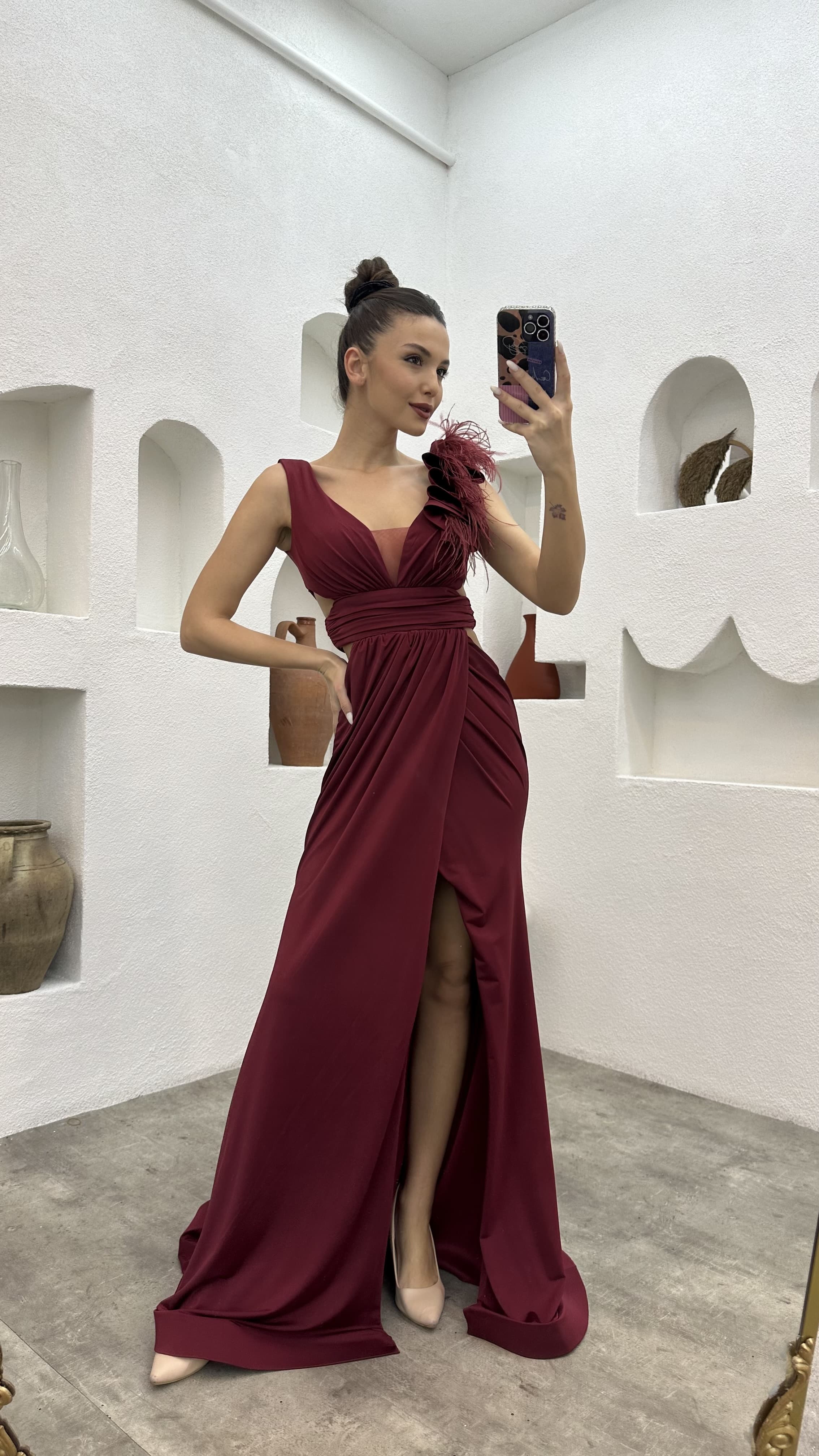 Bordo Volanlı Tüylü Drapeli Abiye Elbise