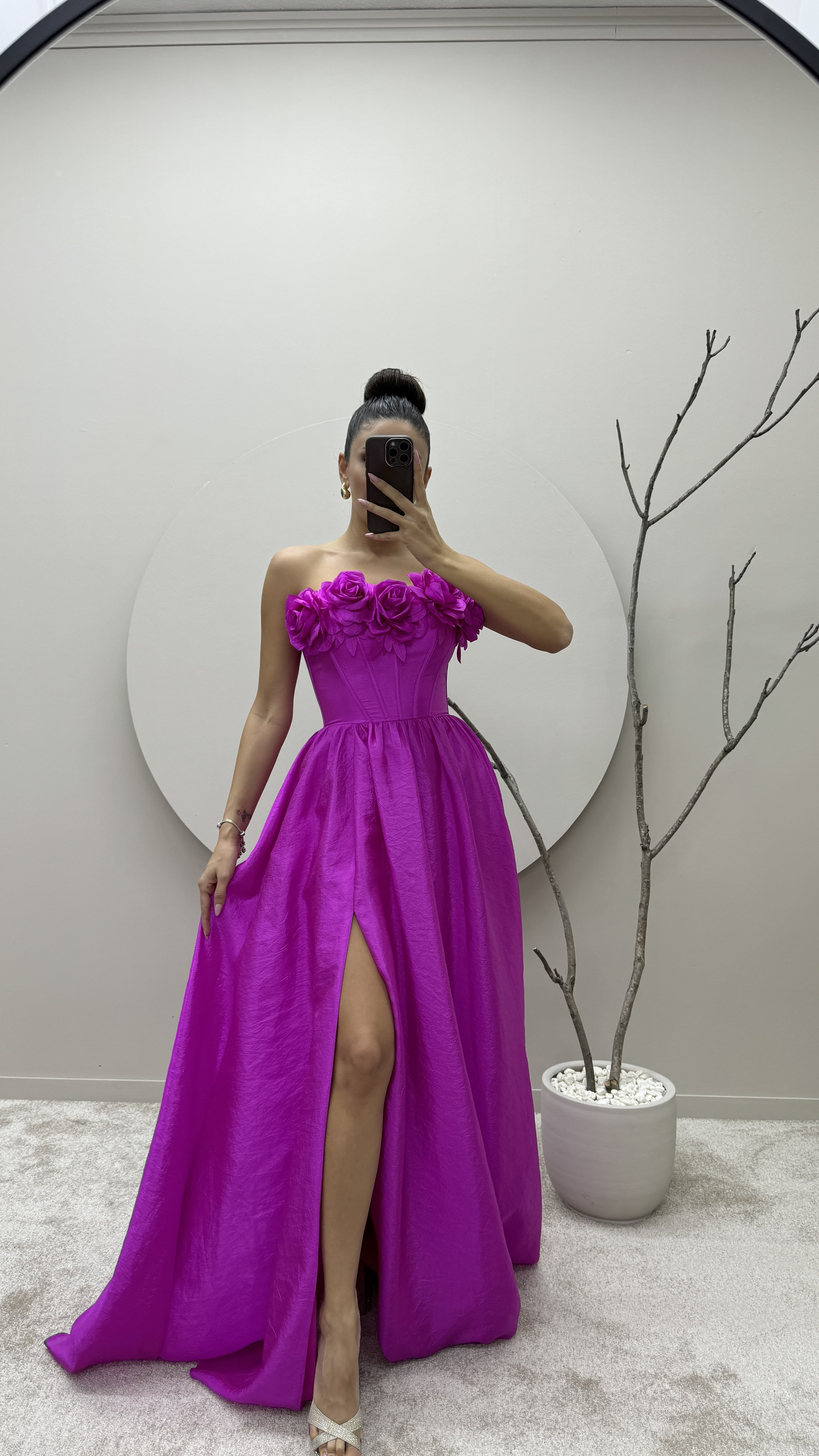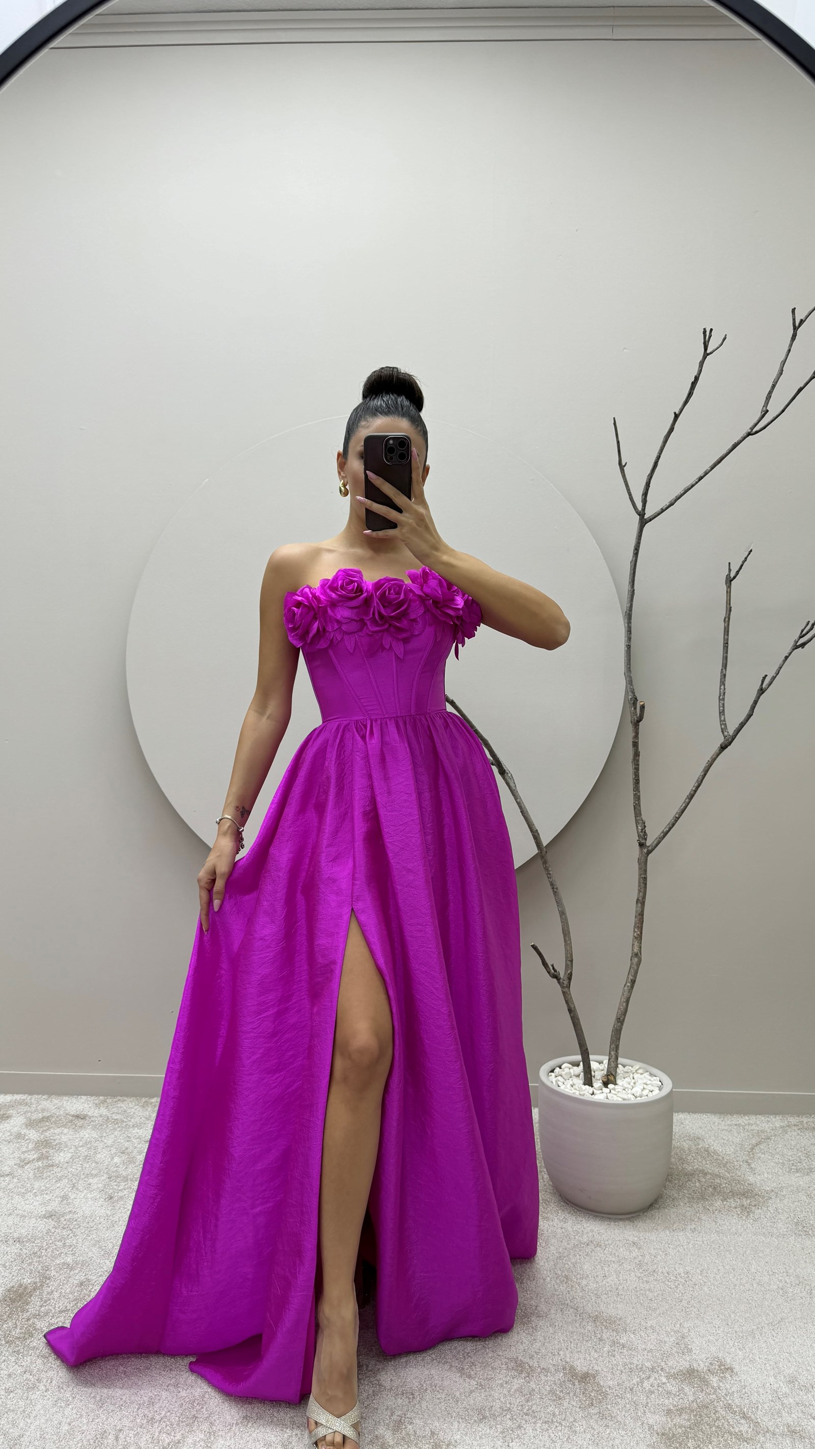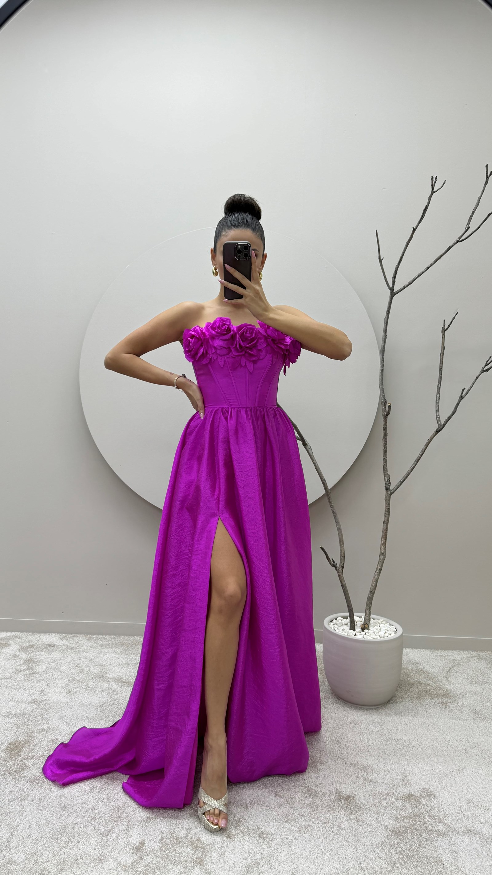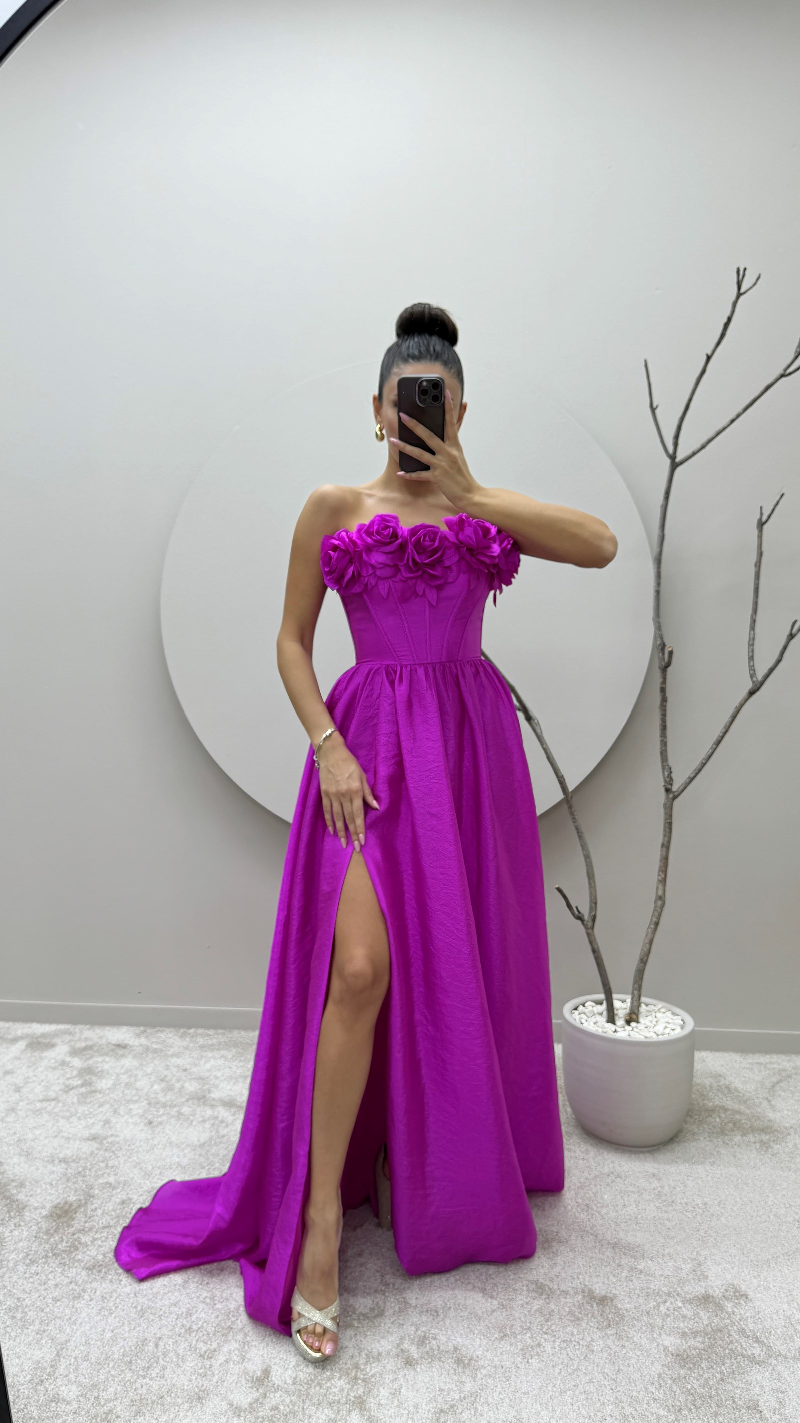 Fuşya Göğsü Çiçek Detay Tasarım Abiye Elbise