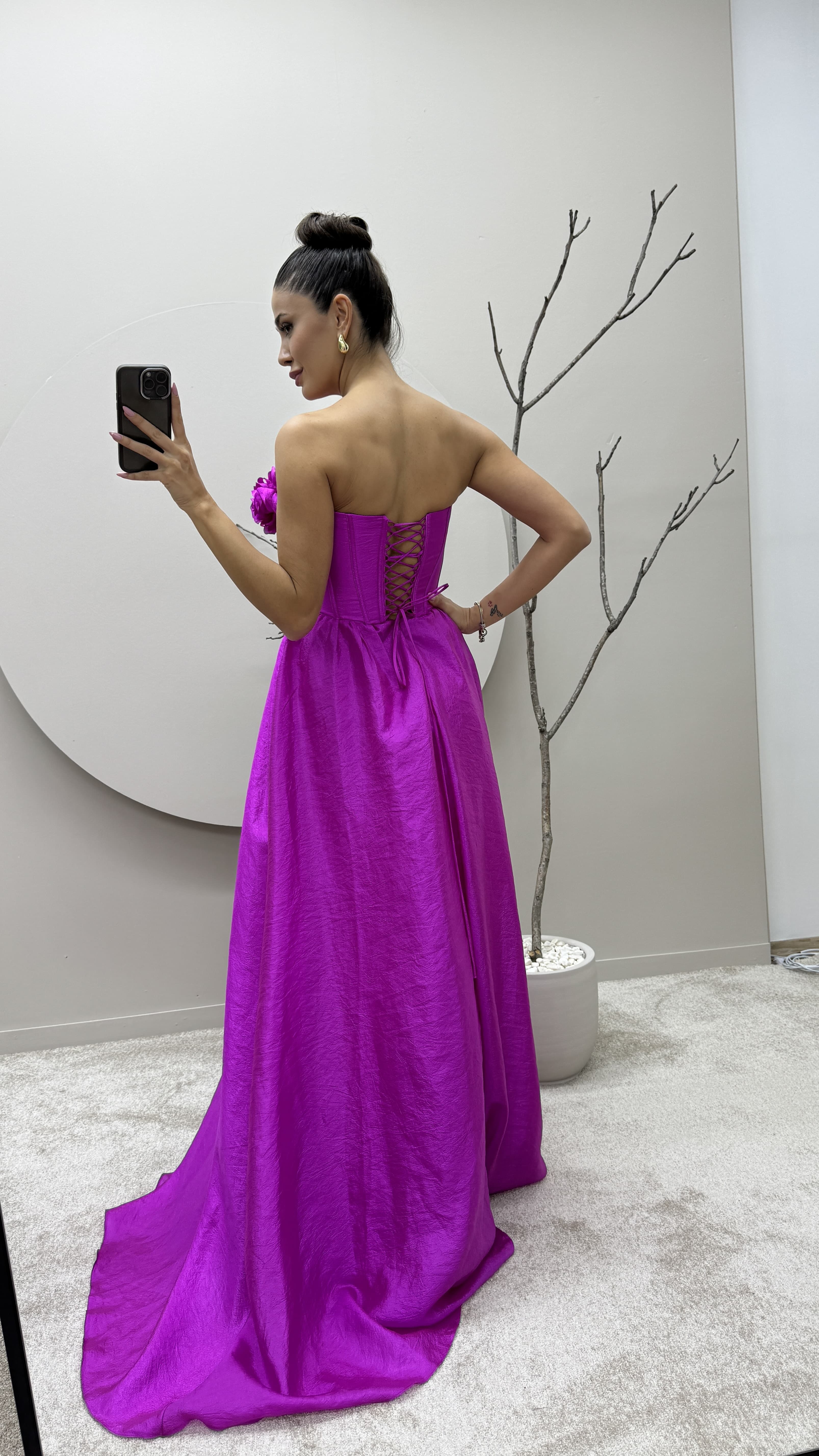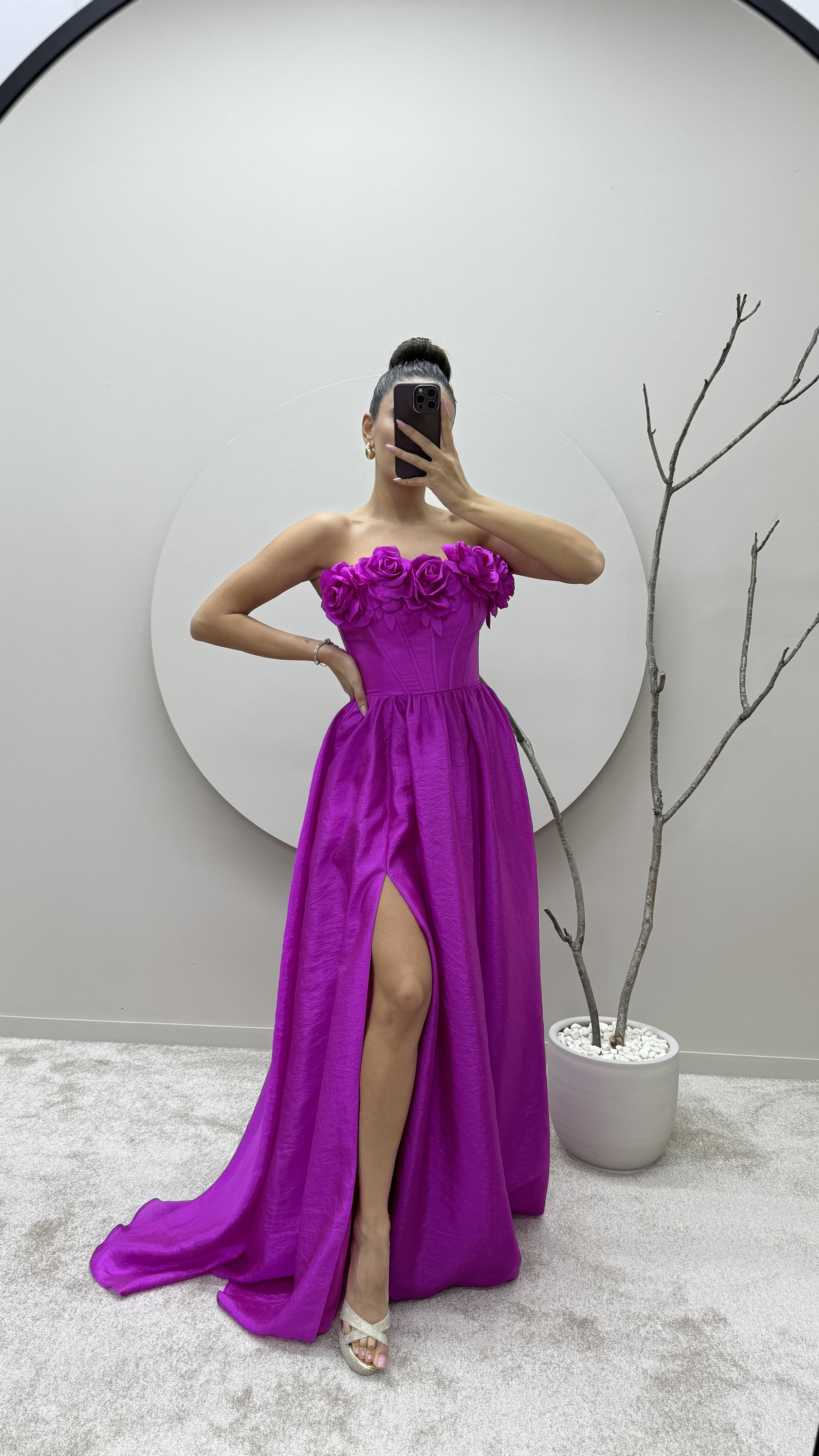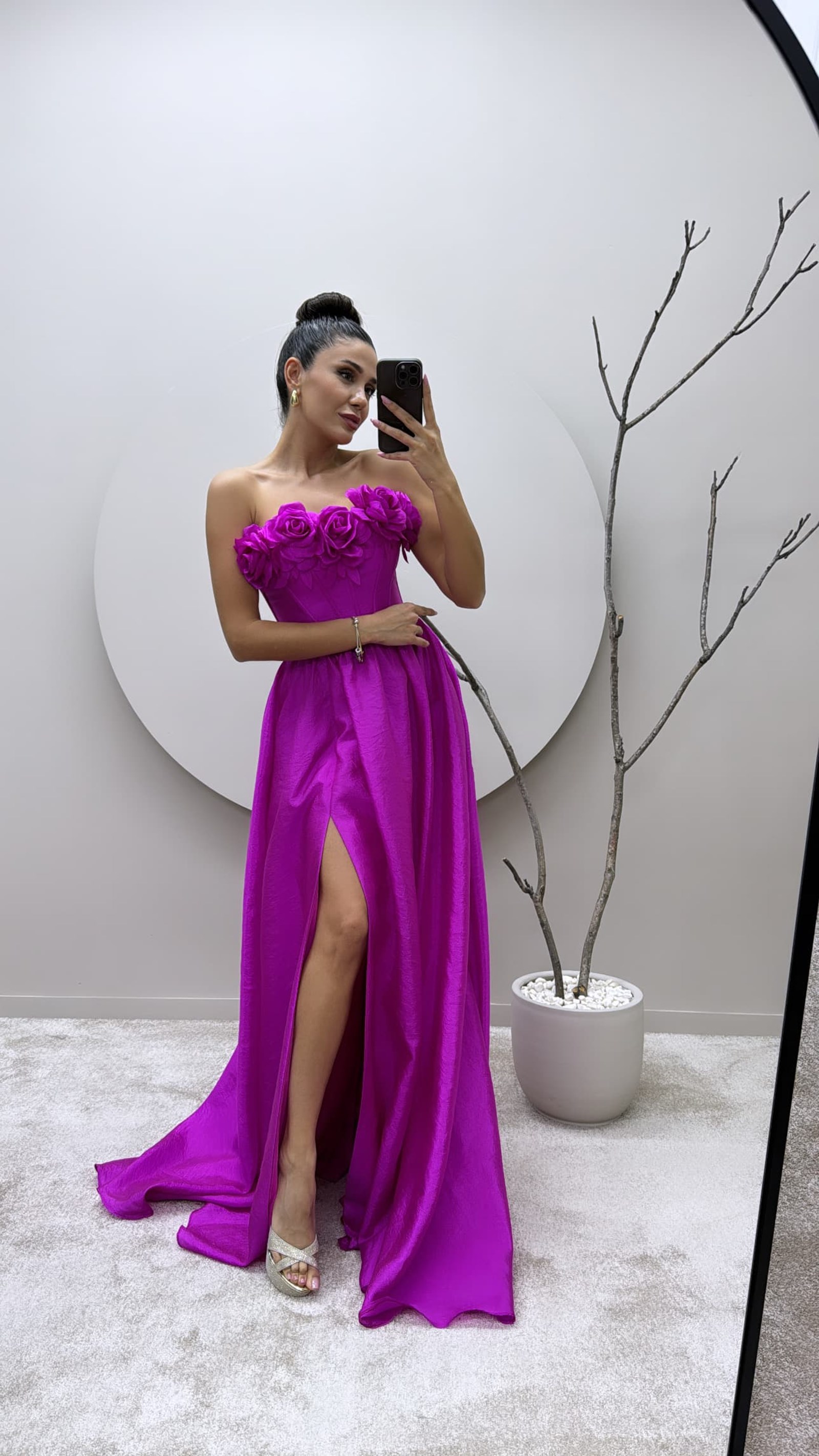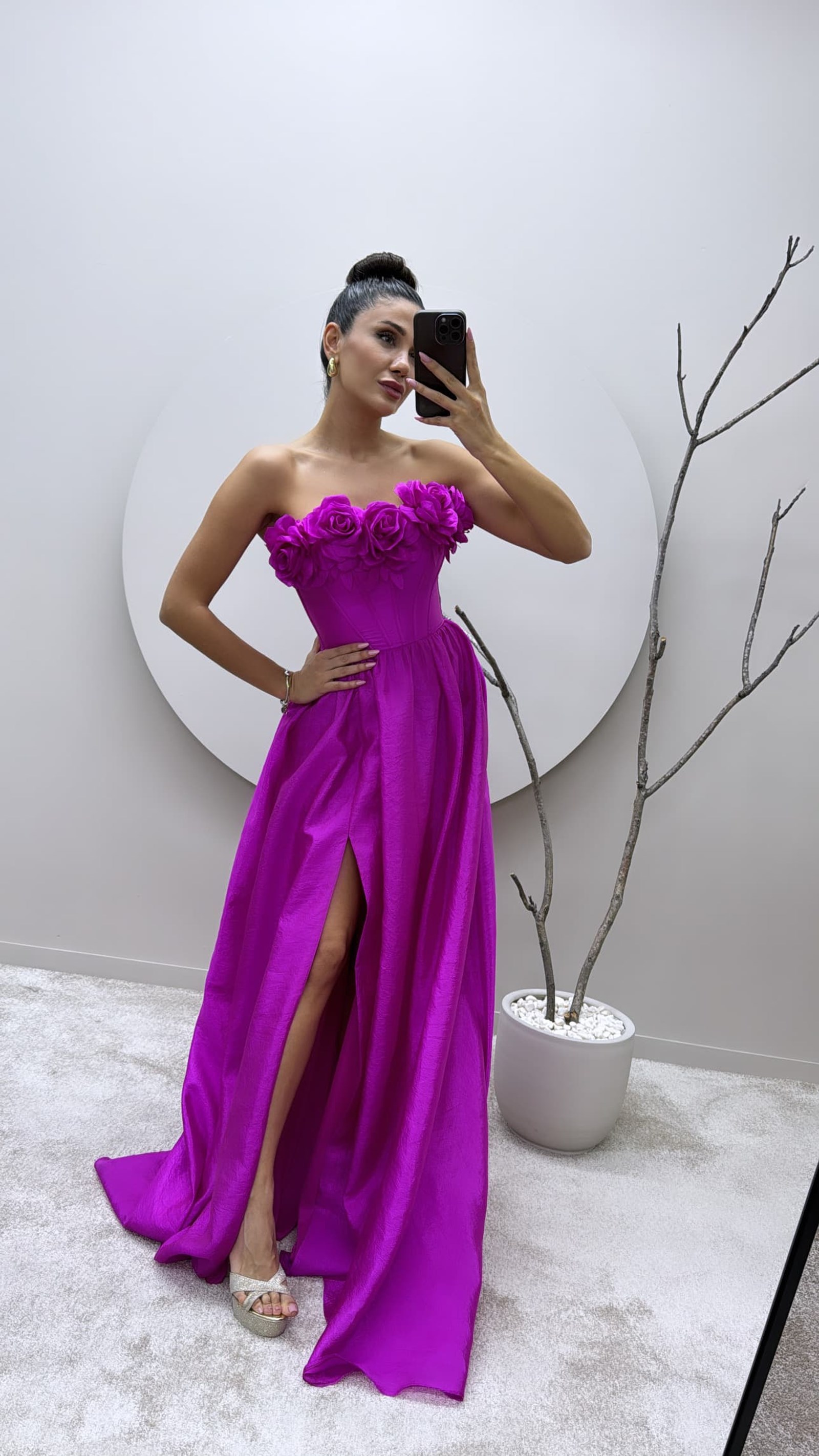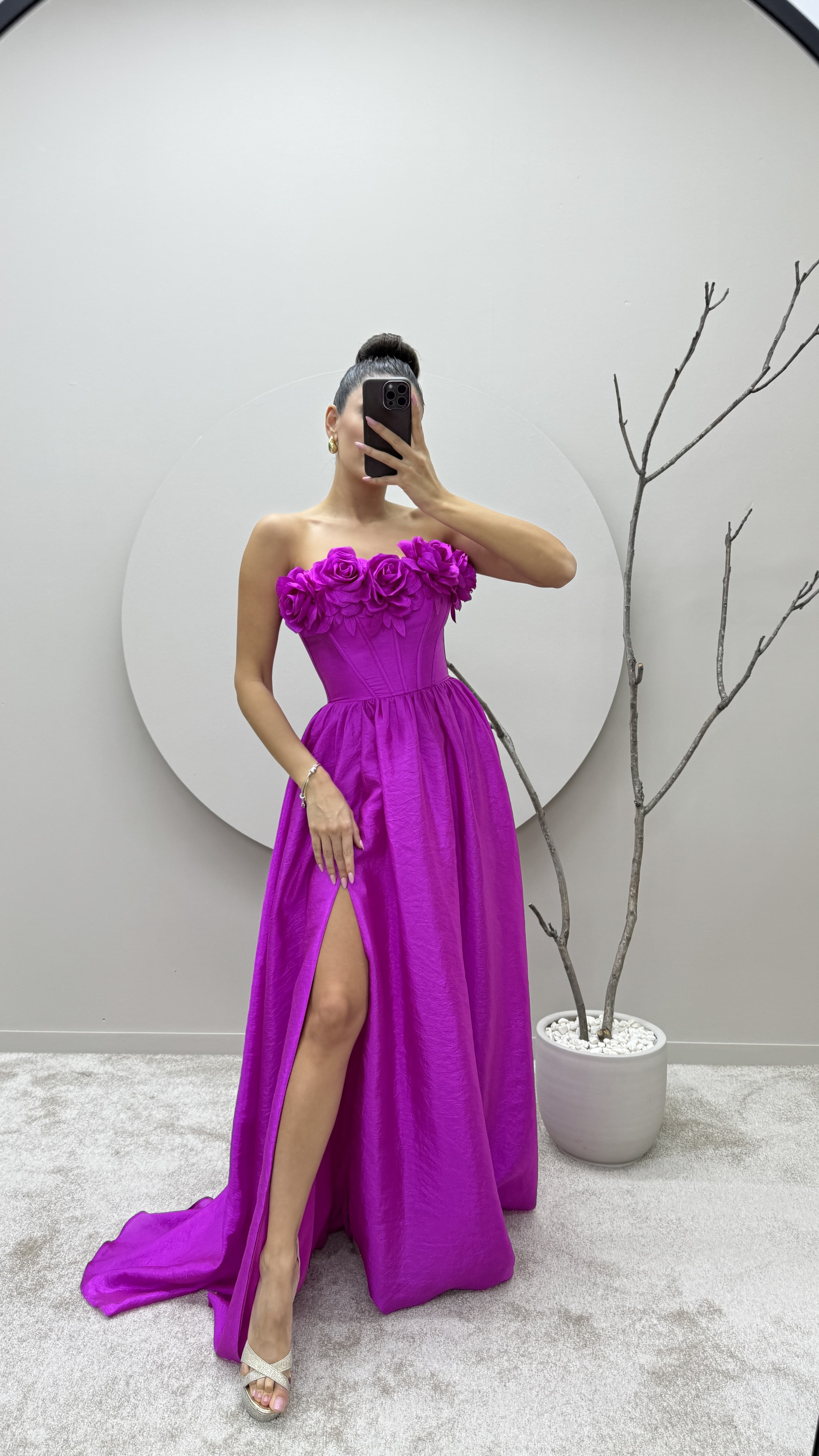 Fuşya Göğsü Çiçek Detay Tasarım Abiye Elbise