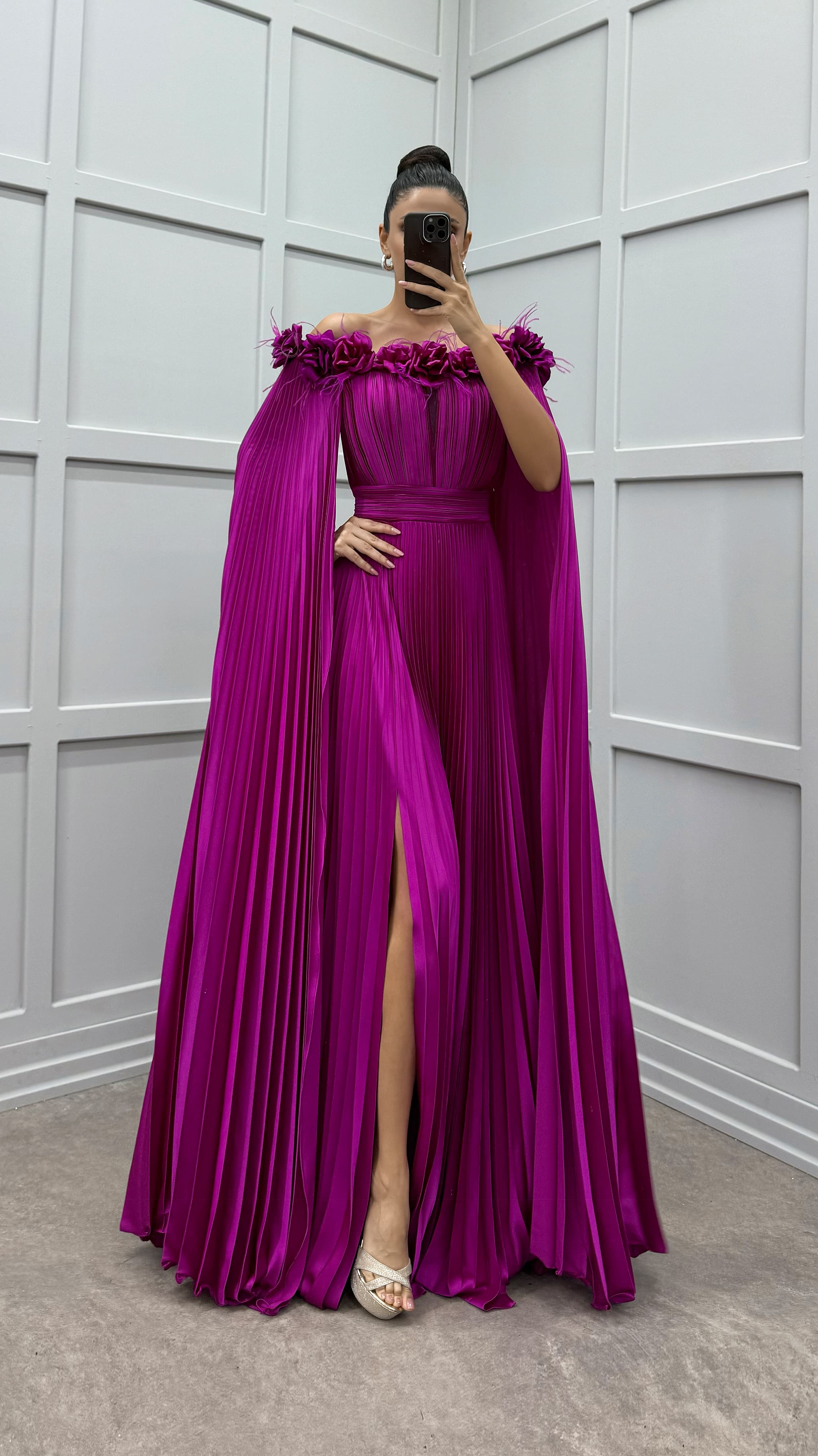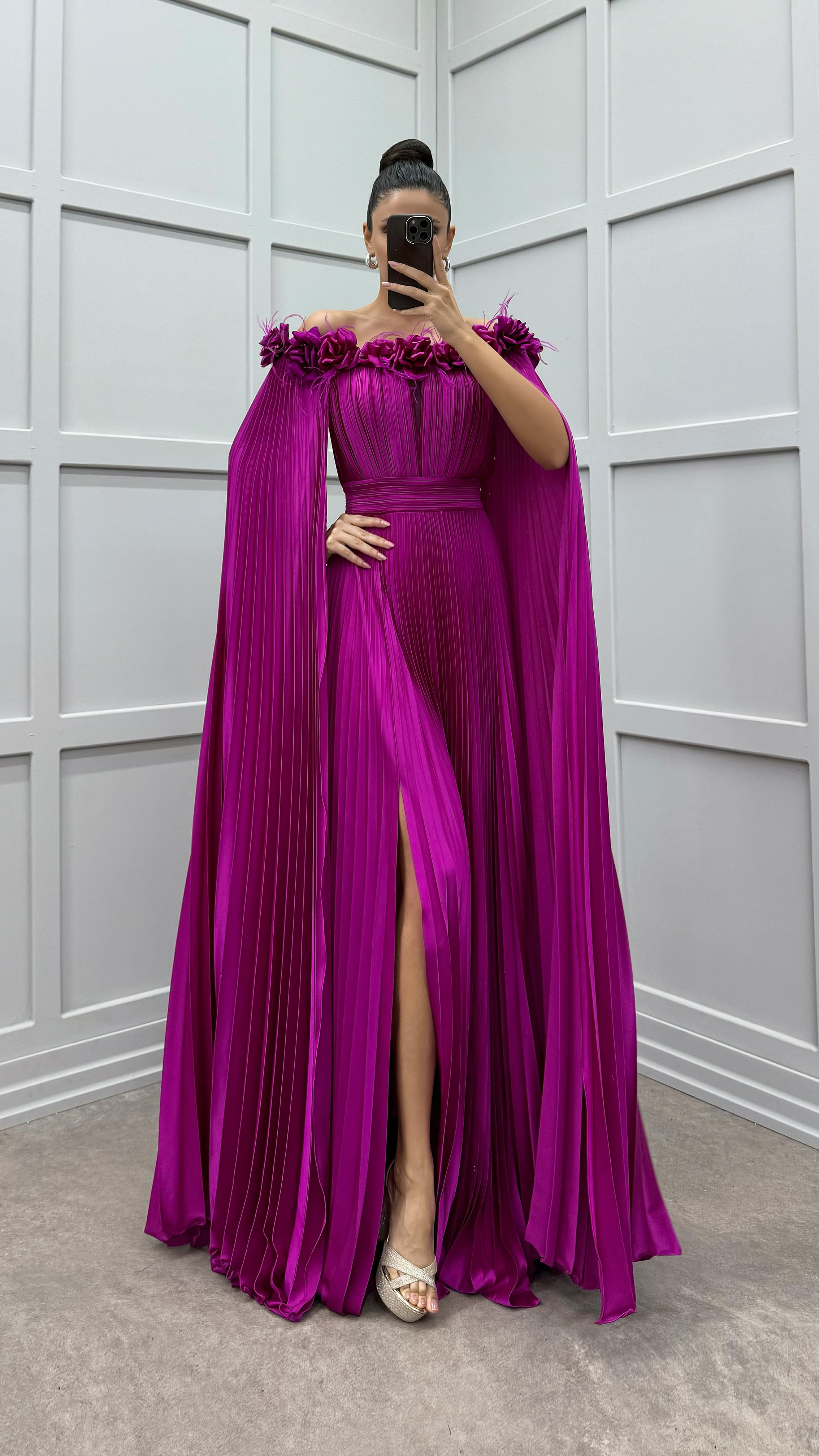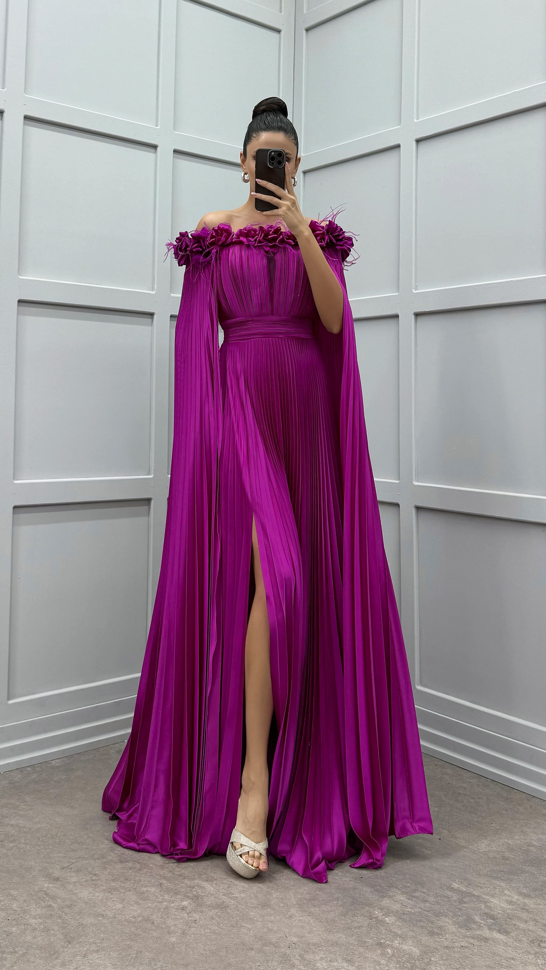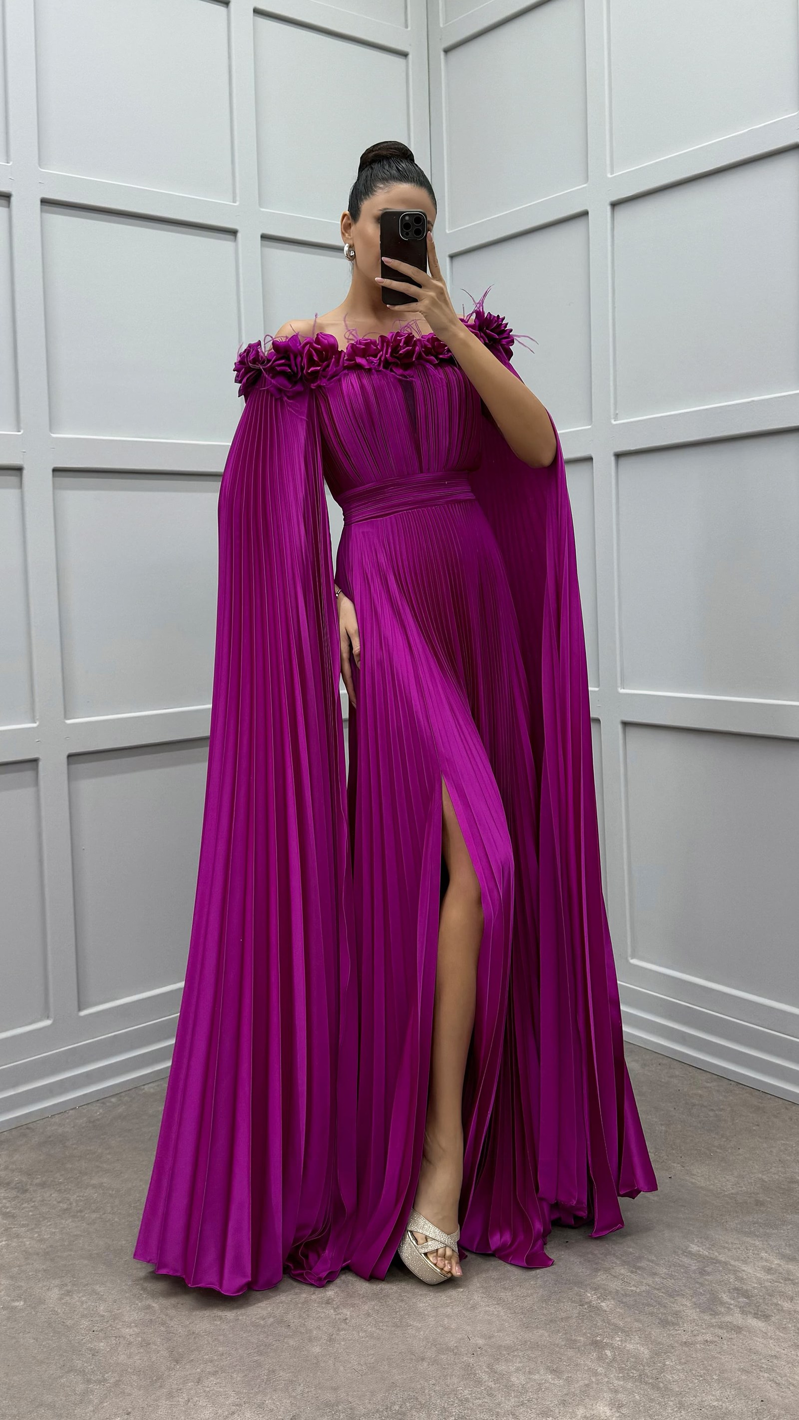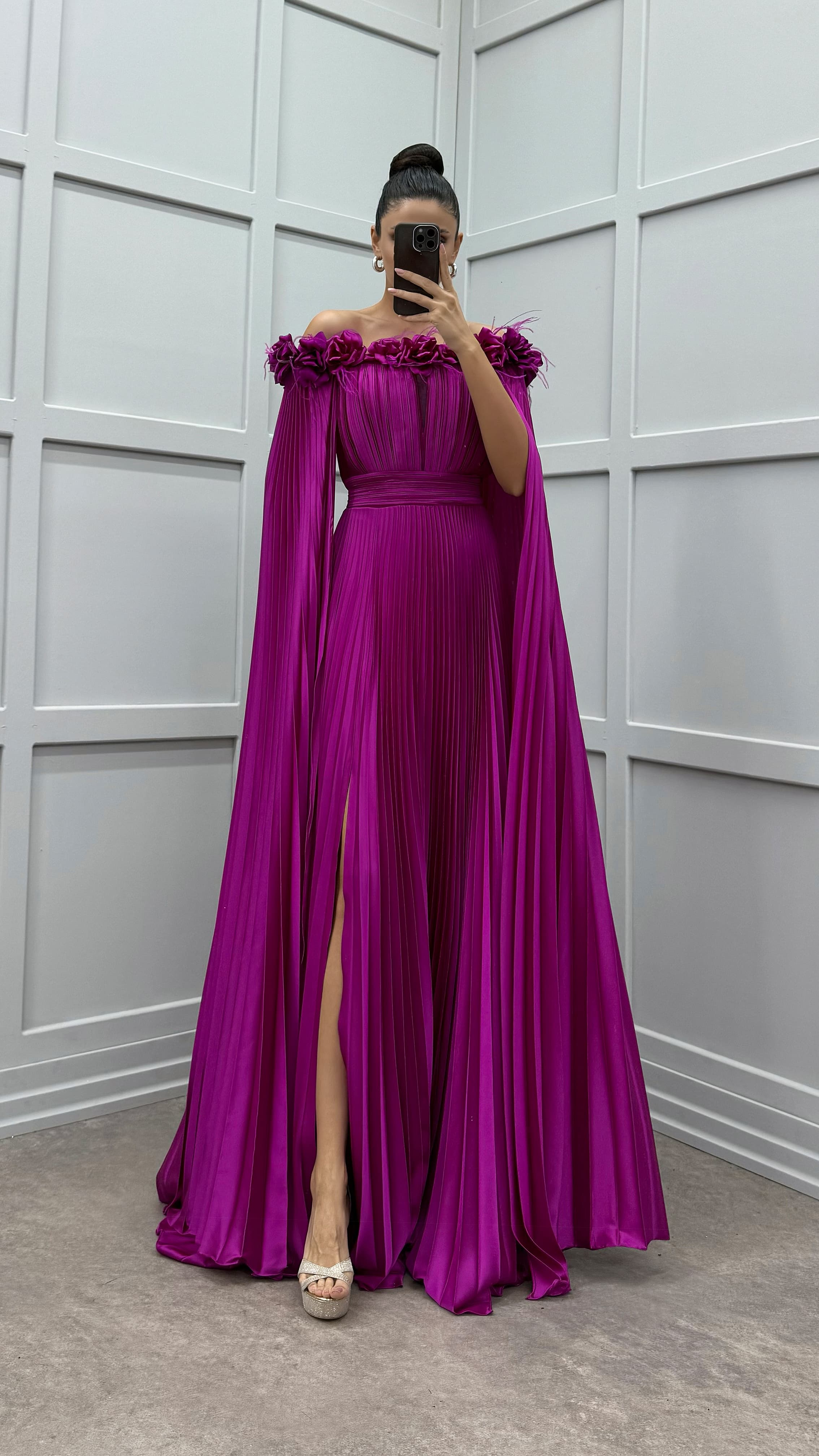 Fuşya Göğsü Ve Omuzları Gül Detay Tüylü Pliseli Elbise