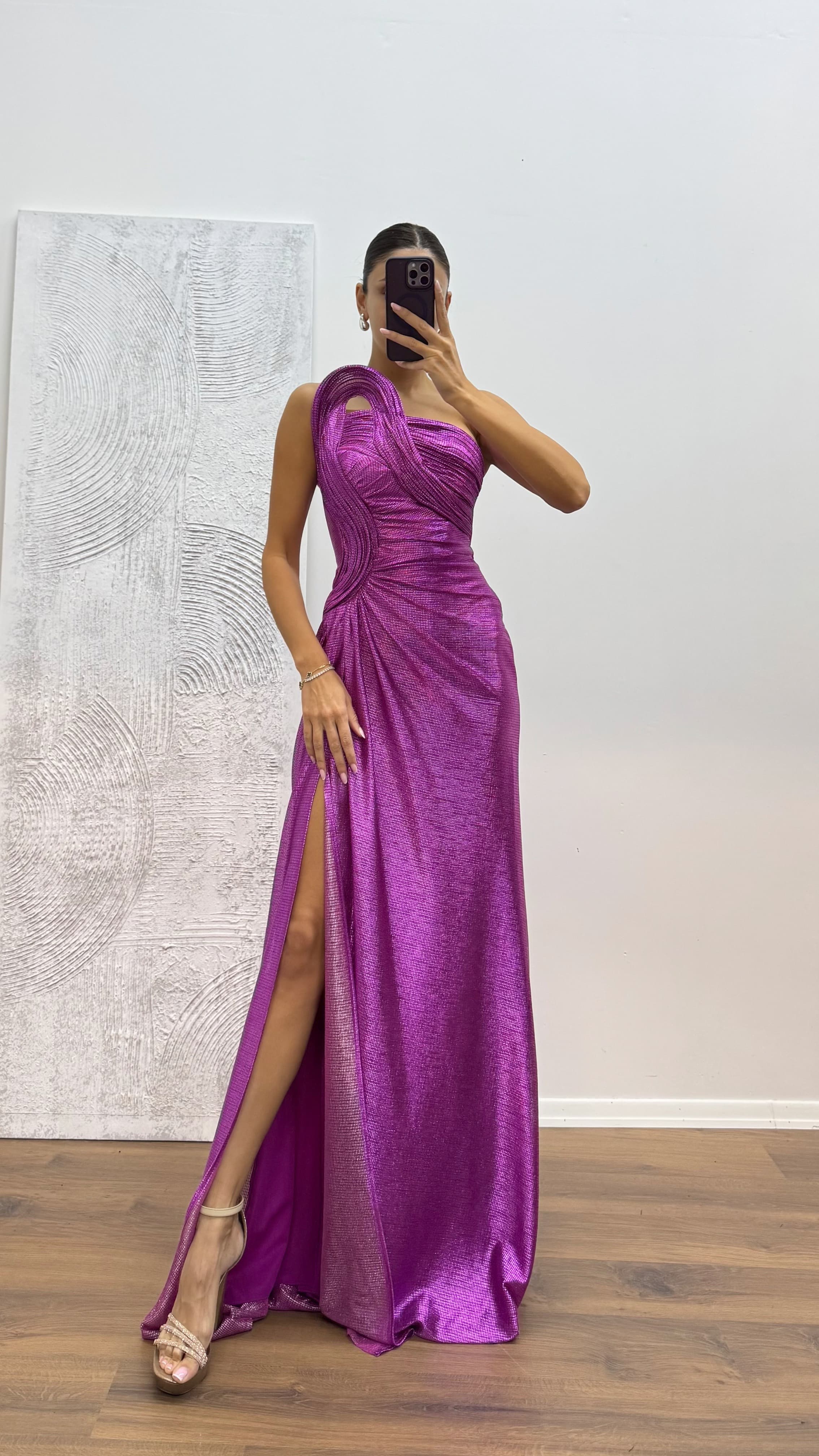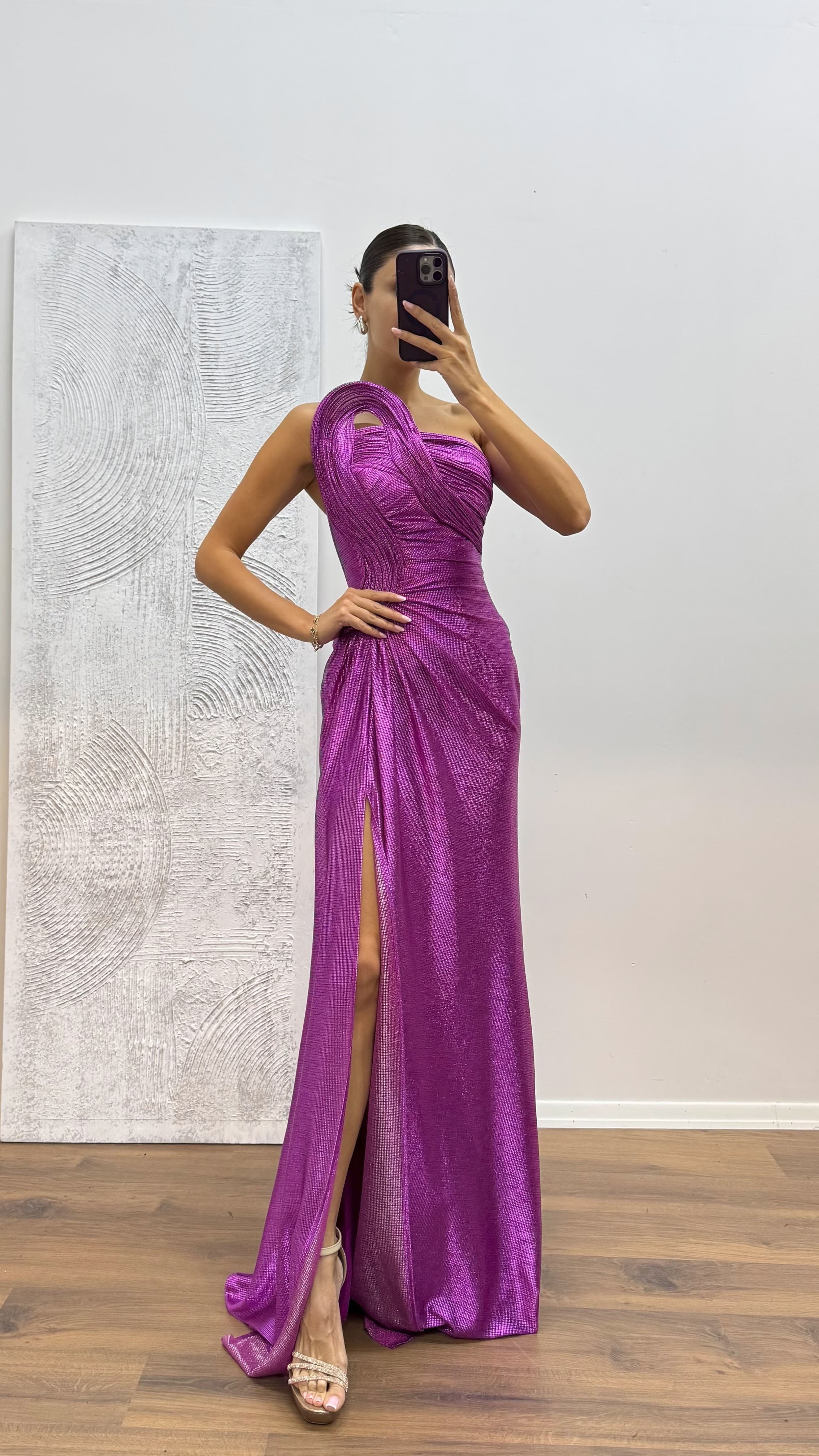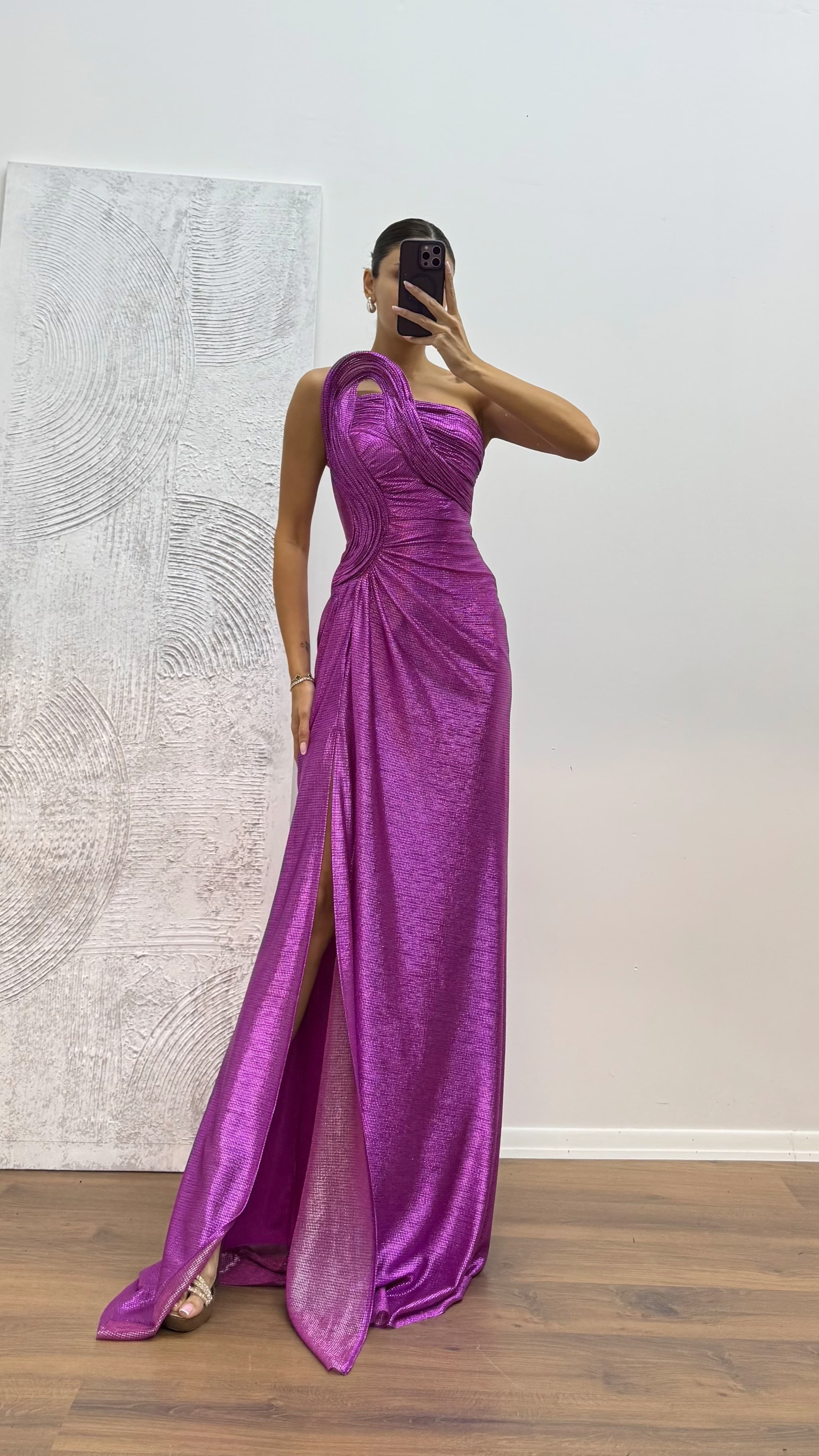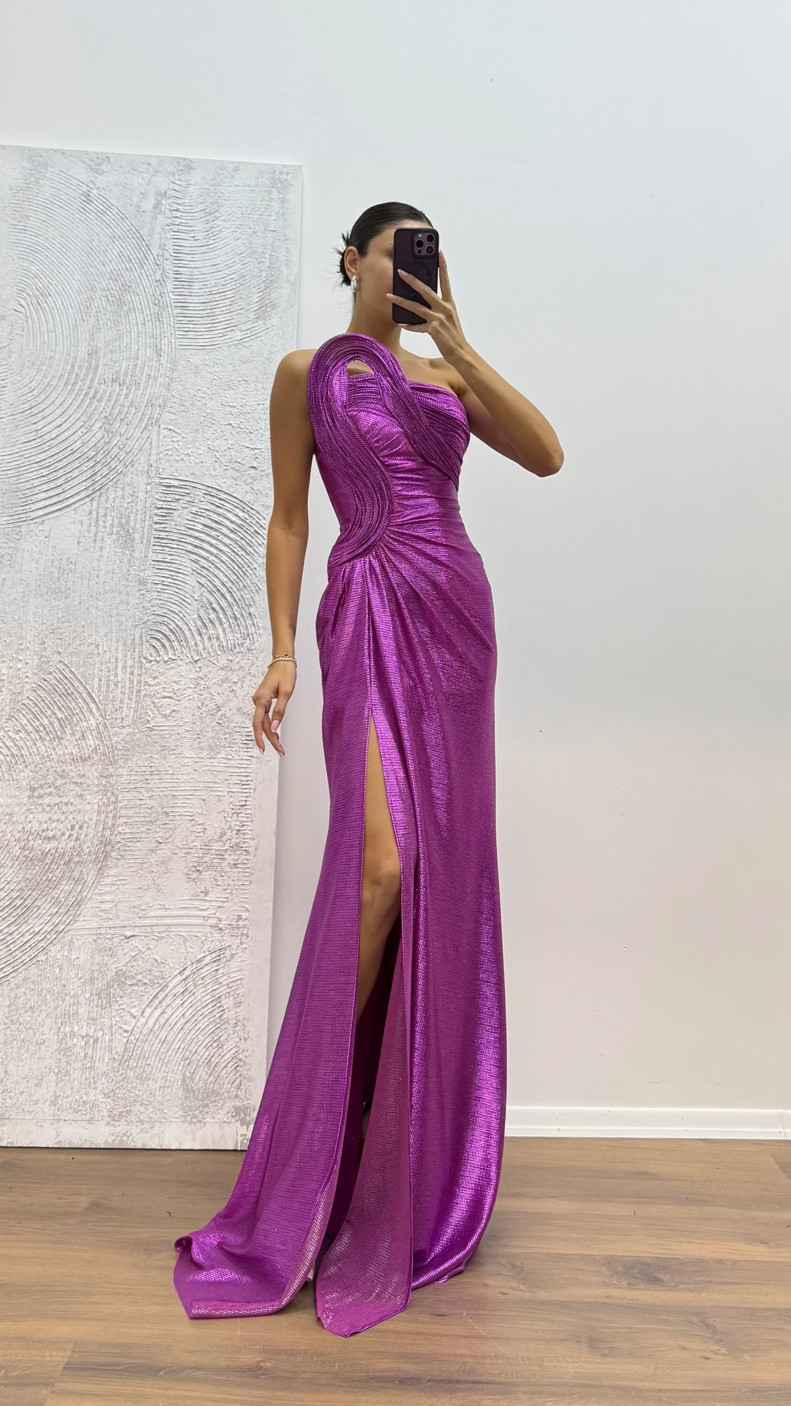 Vestido de noche brillante con detalle de cuello sin tirantes El producto está diseñado como un vestido de noche con almohadillas en el pecho, forro, cierre de cremallera en la espalda, abertura, detalle de cuello, adecuado para las tallas 36-42. Longitud del producto: 170-175 cm. Tipo de tejido: poliéster-viscosa satinado
