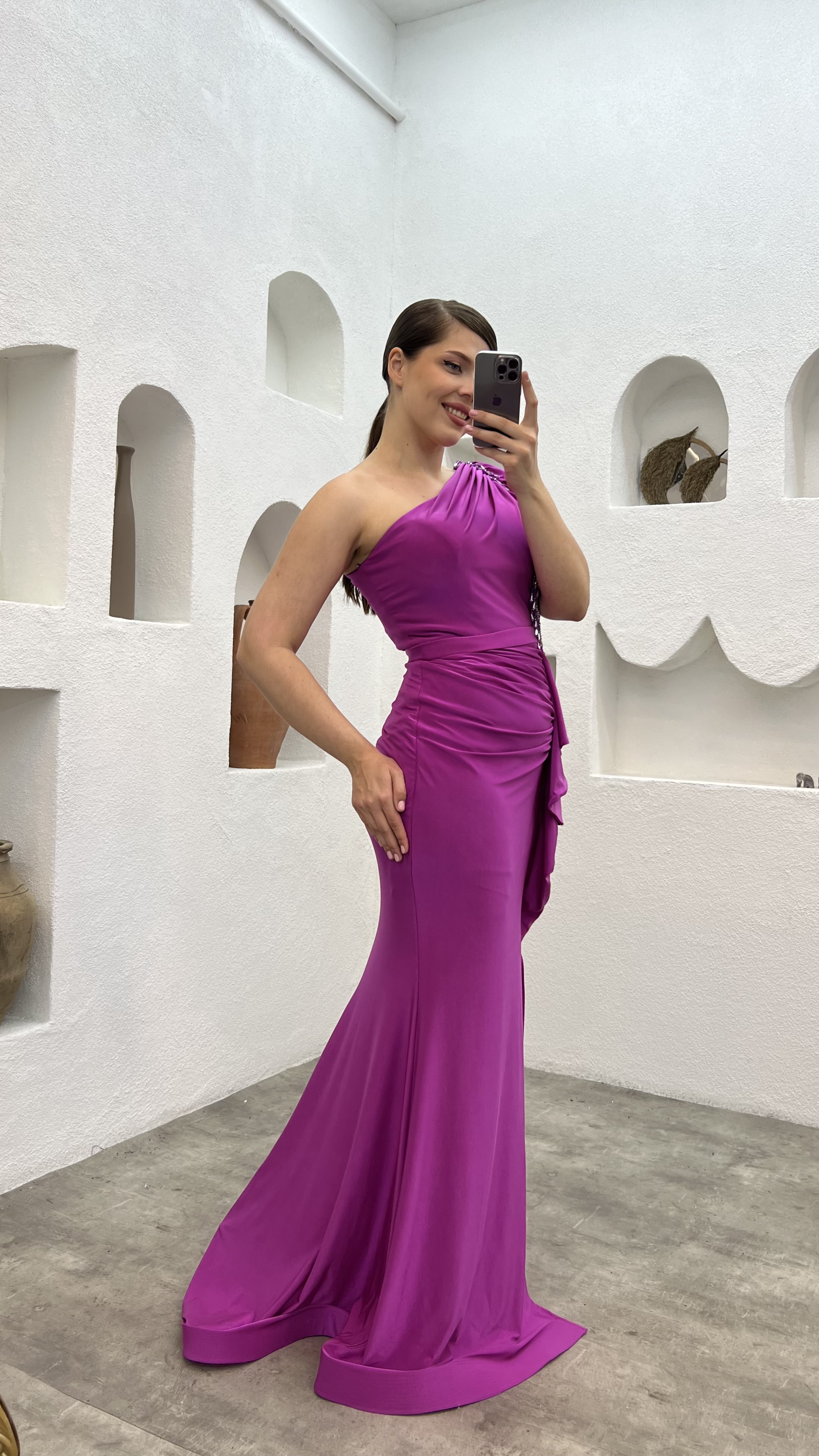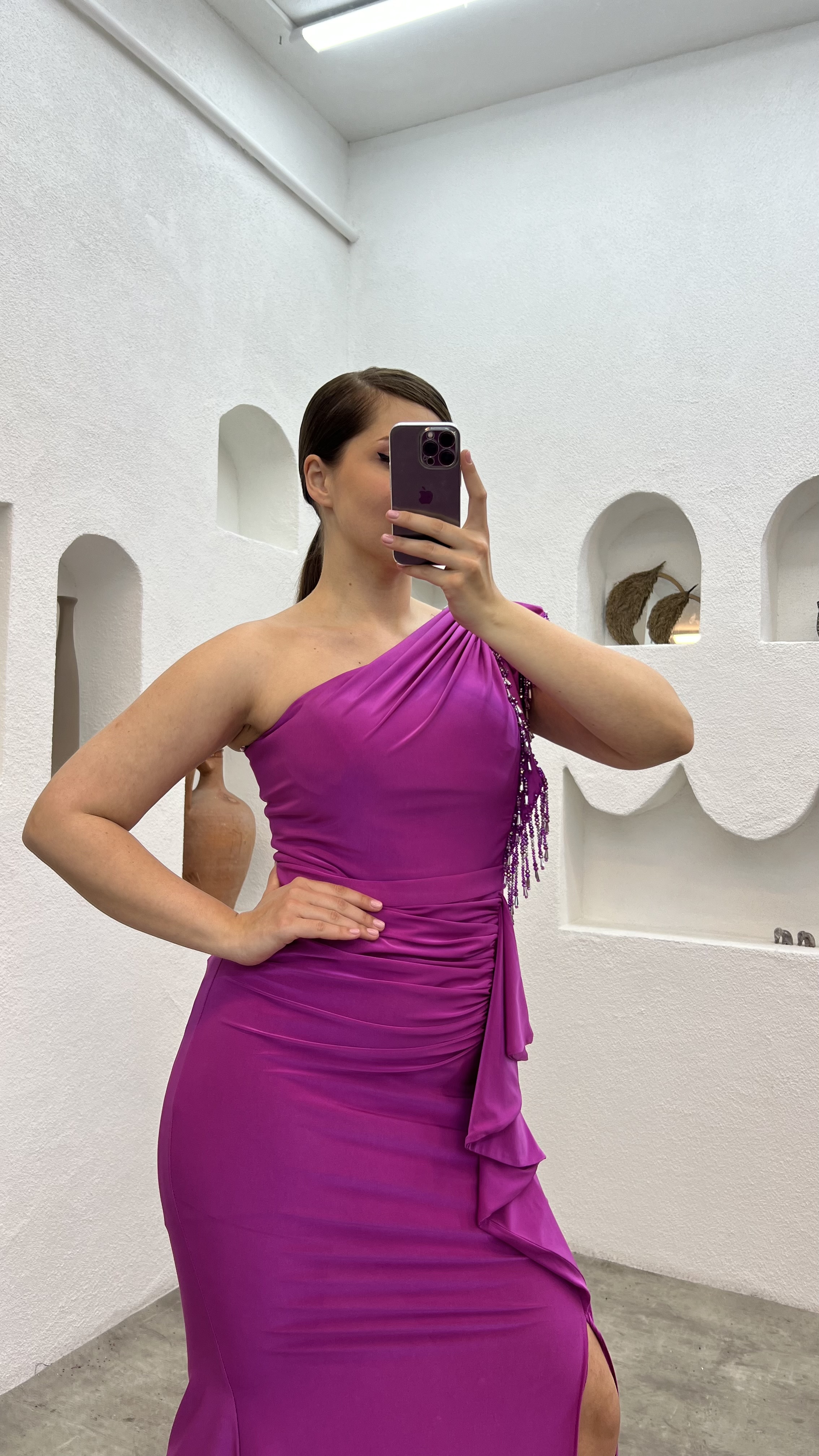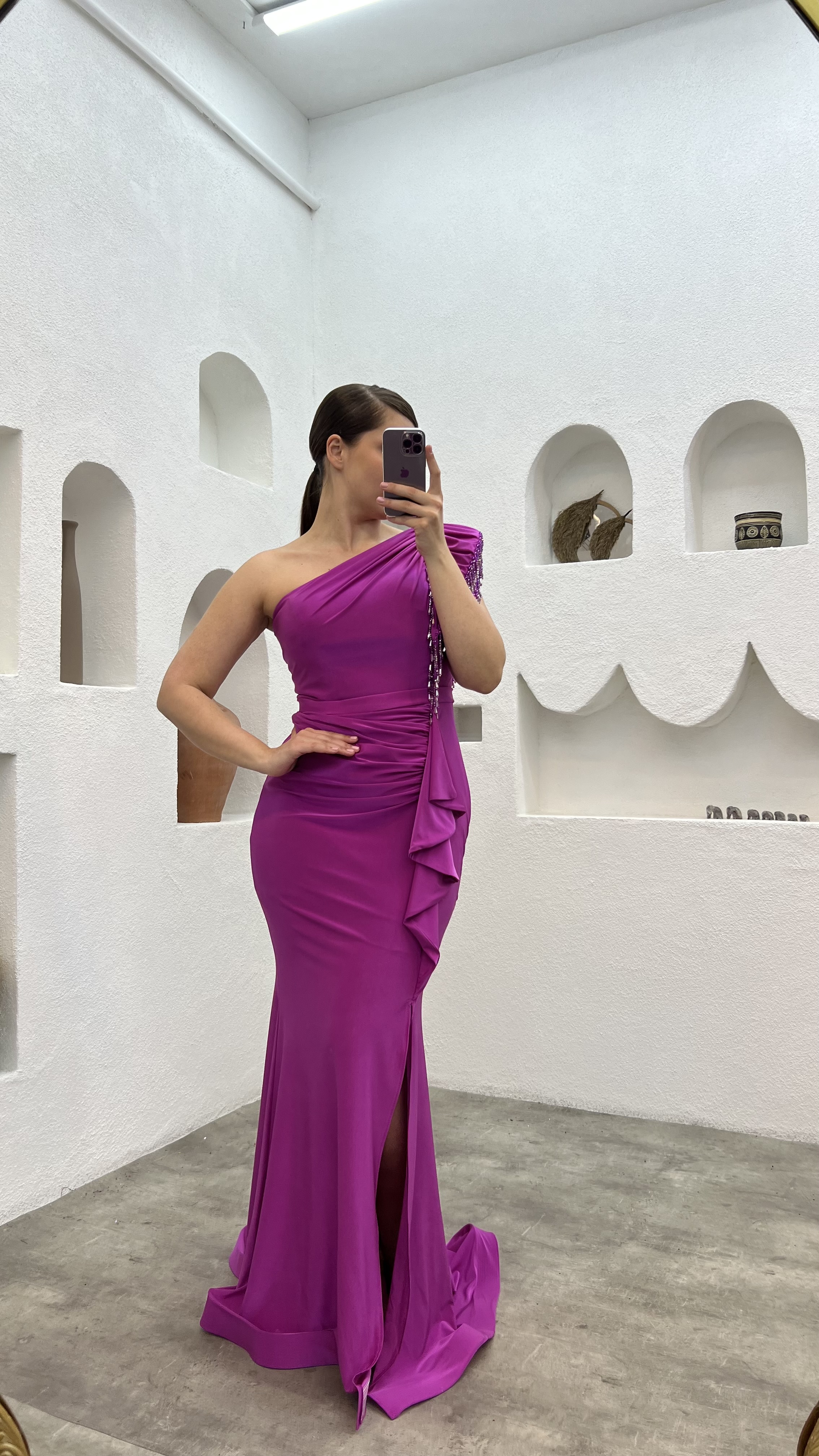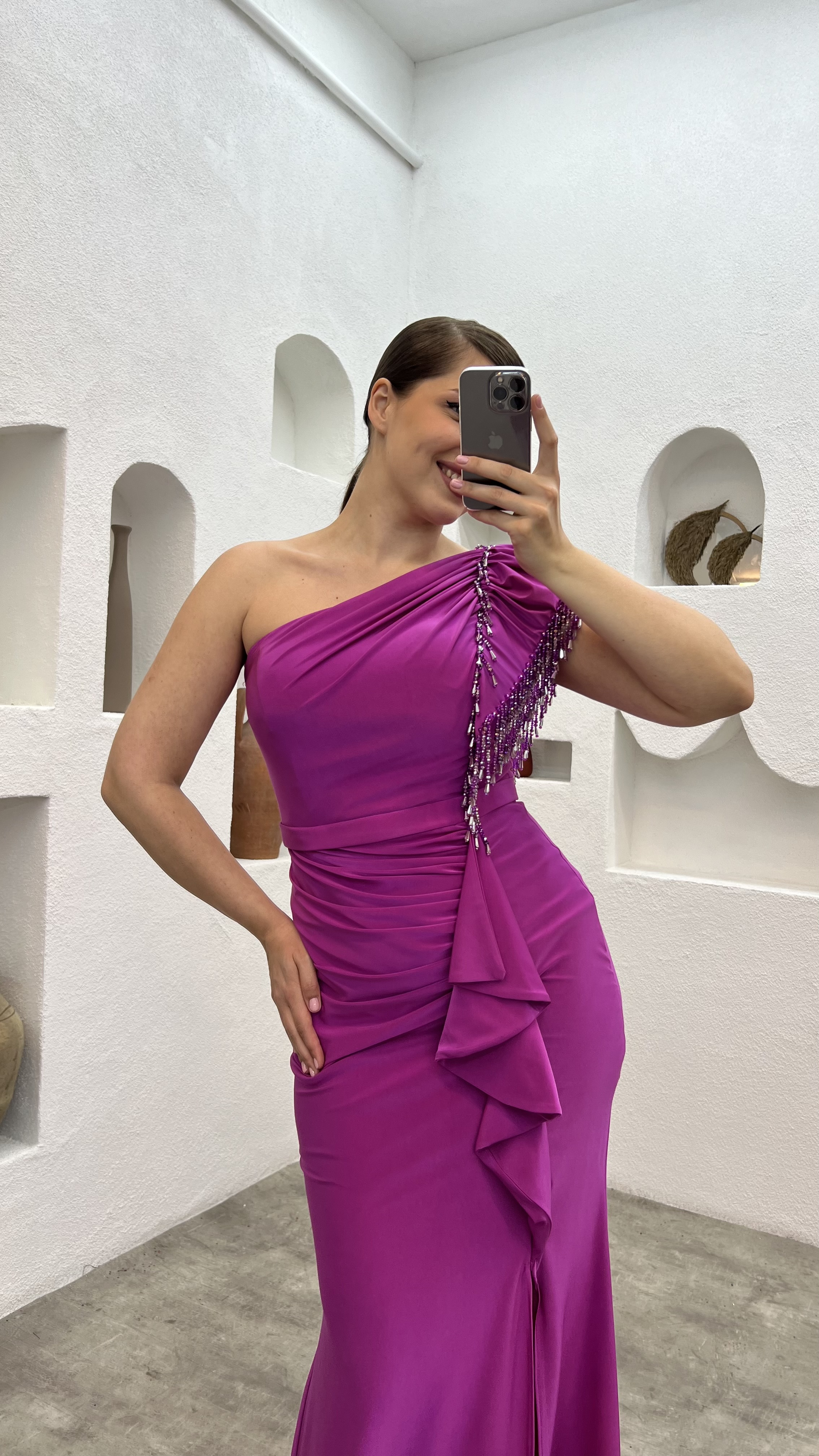 • Fuşya Tek Kol Kolu İşlemeli Büyük Beden Abiye Elbise