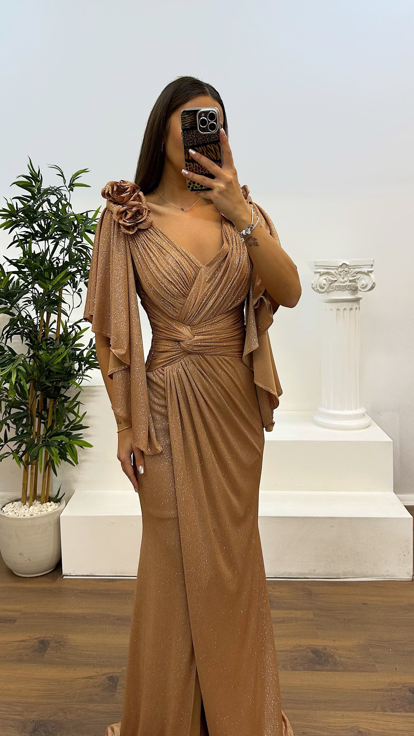 • Gold V Yaka Çiçek Detay Simli Abiye Elbise